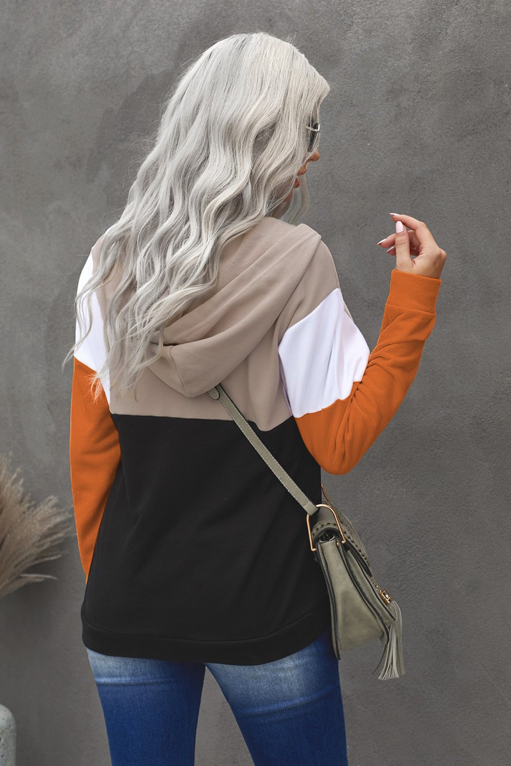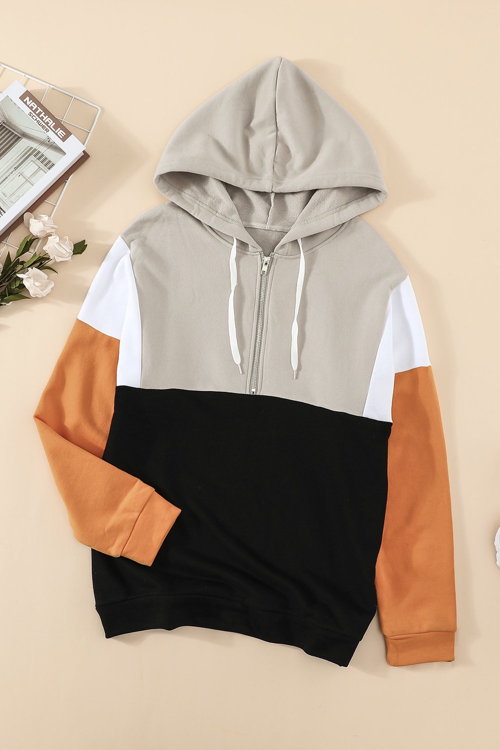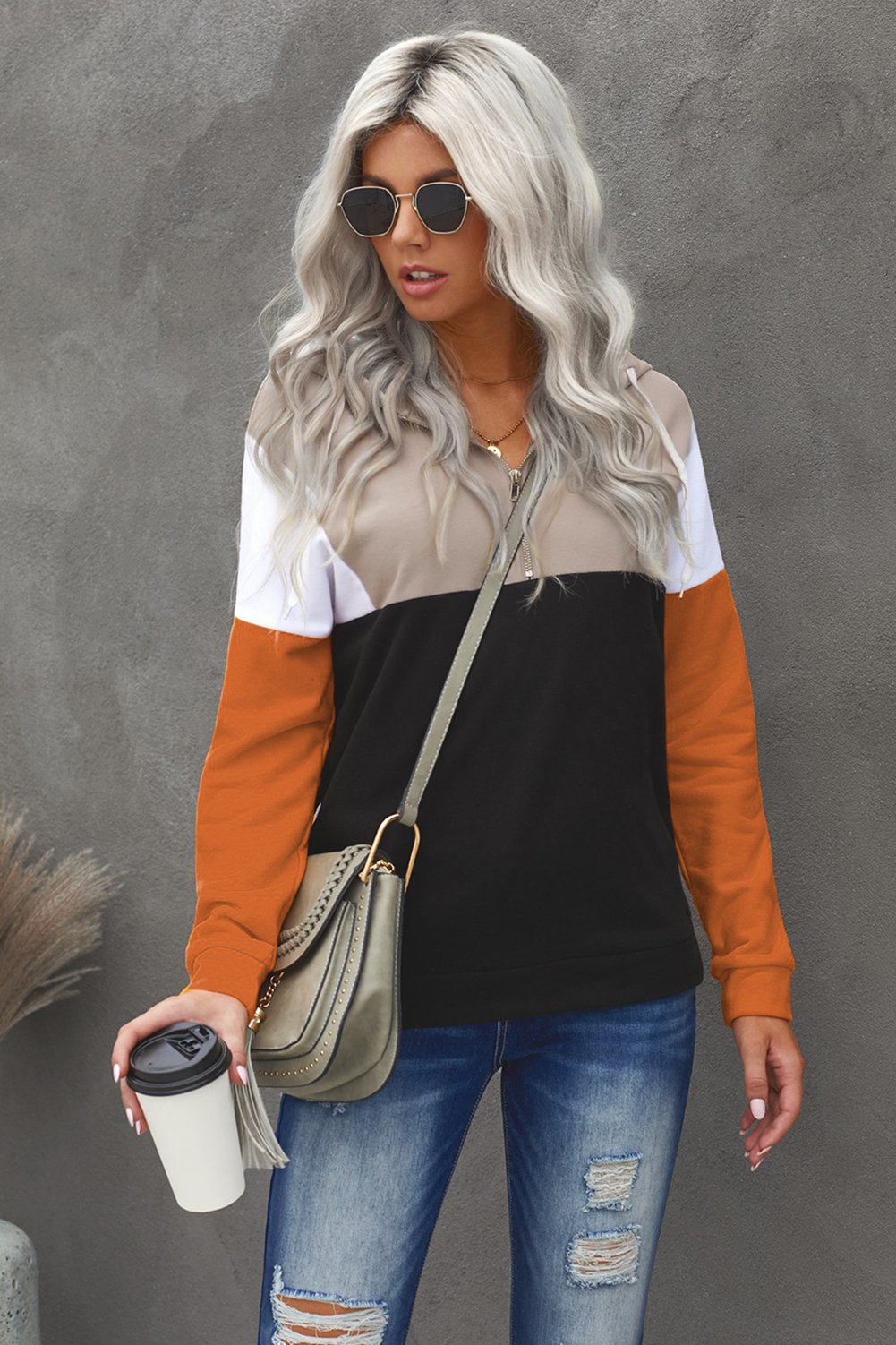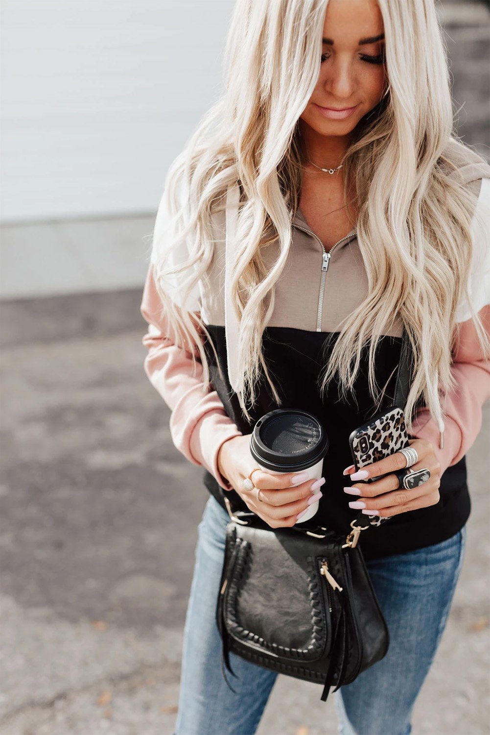 Colorblock Quarter Zip Pullover Hoodie in ivory, mauve, and mocha colors, featuring a stylish design and functional zipper.