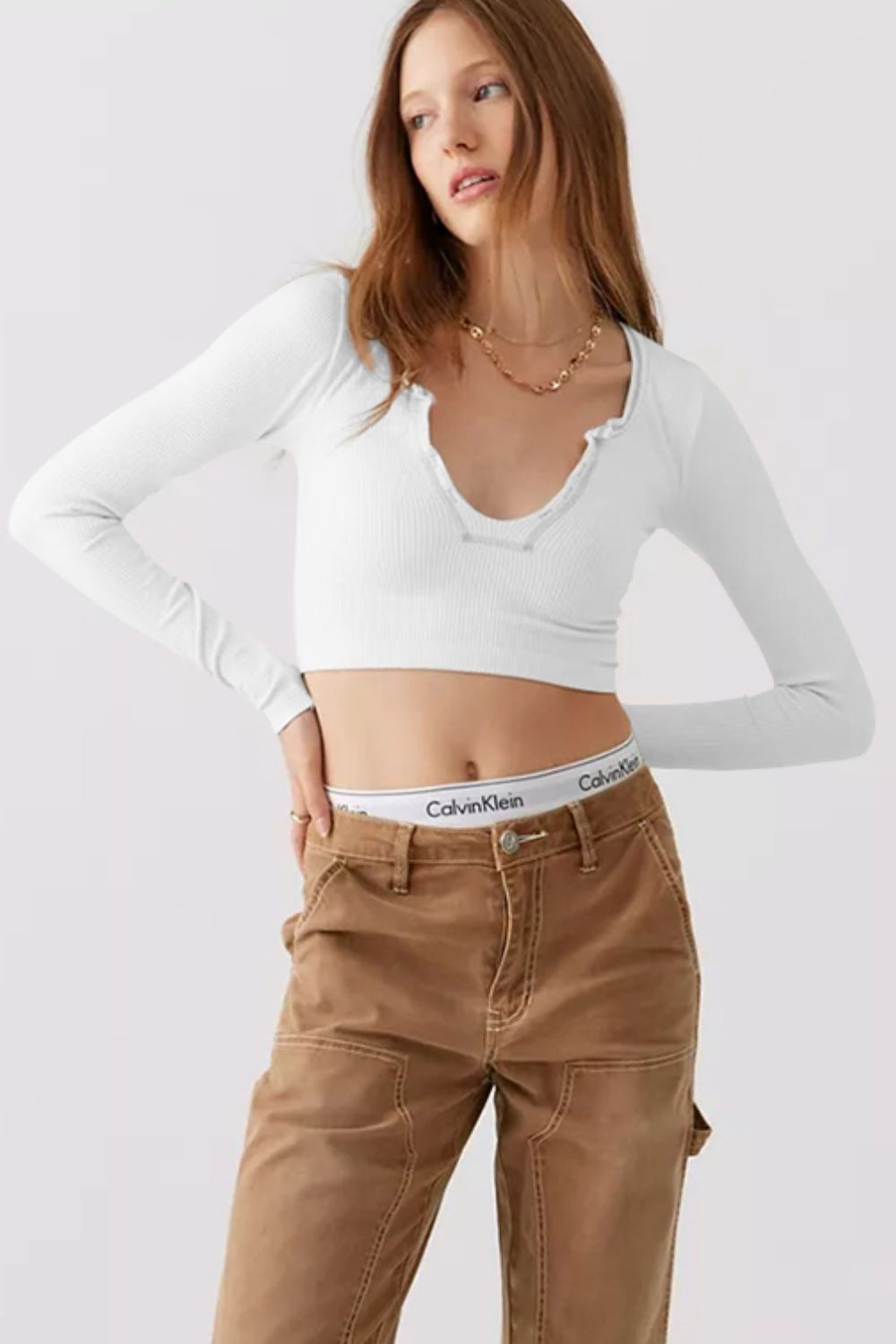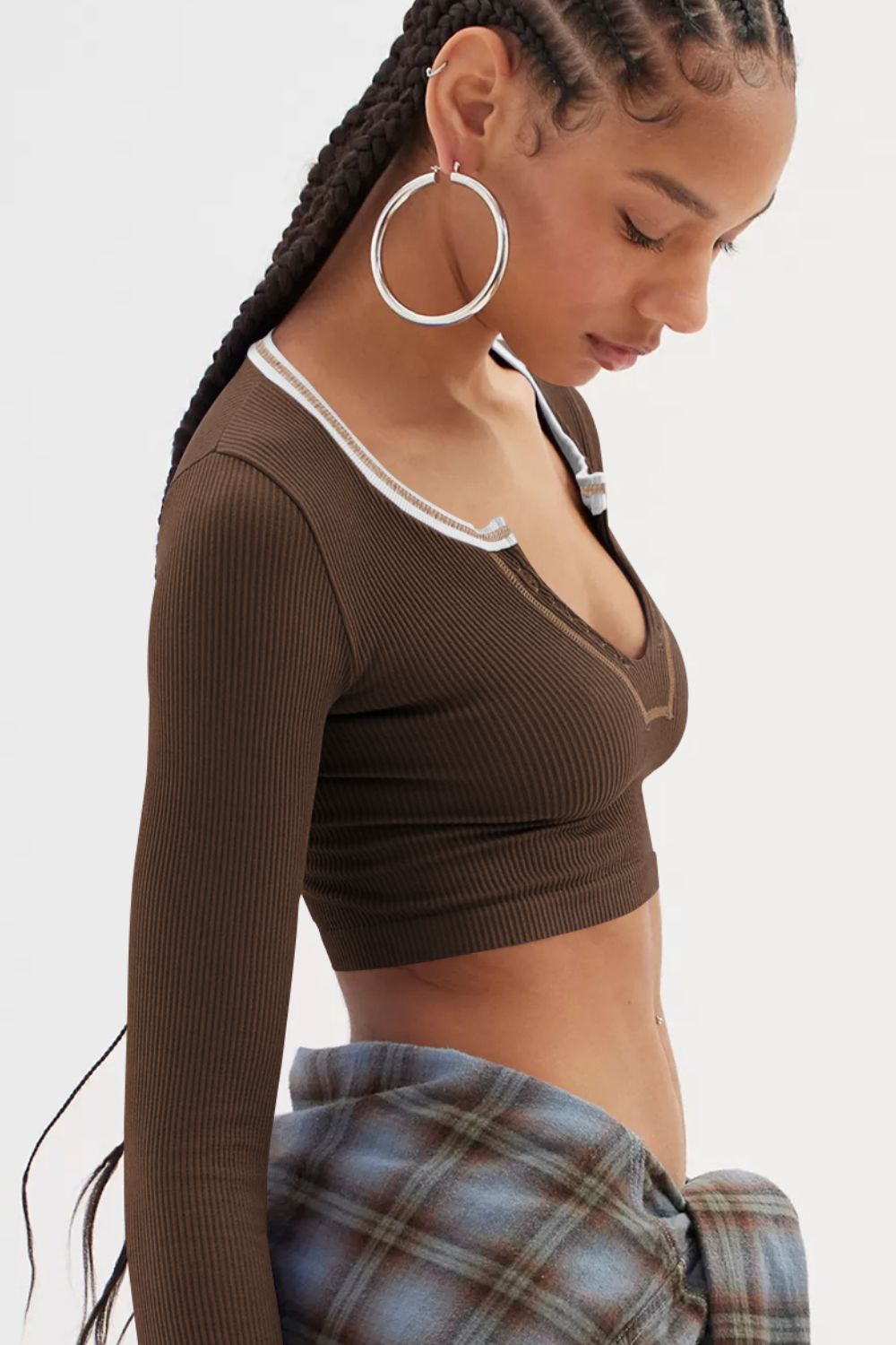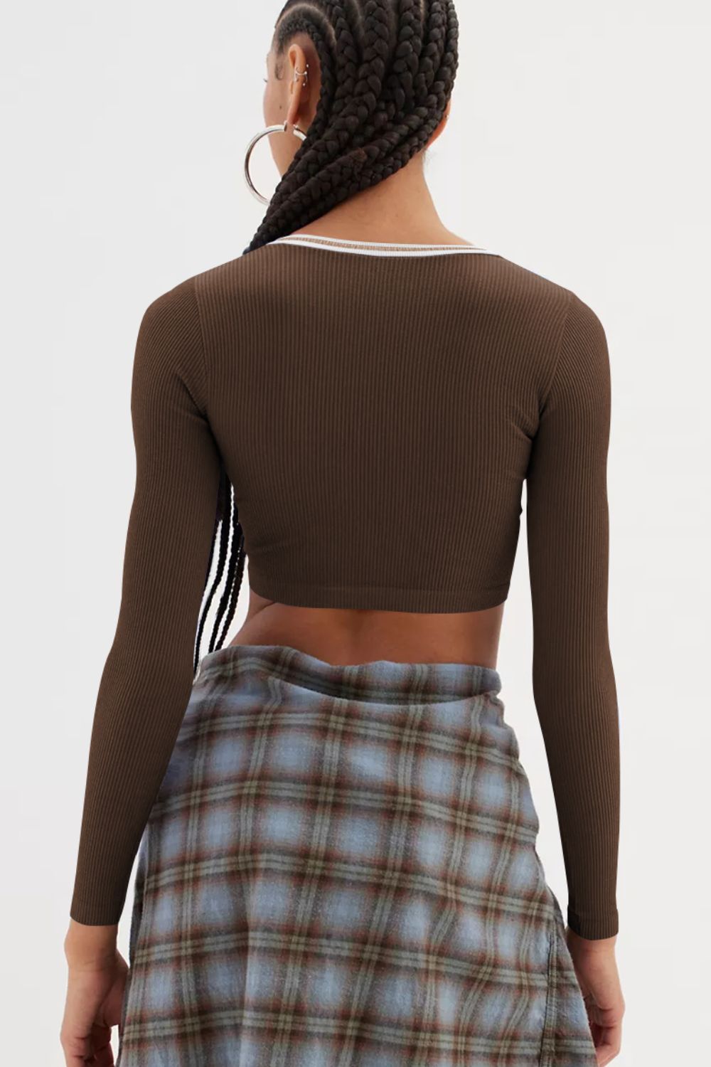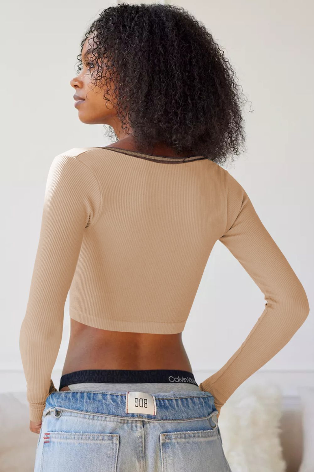 Choosing the Contrast Trim Ribbed Cropped Top means investing in a piece that combines comfort, style, and versatility. Its basic yet chic design makes it suitable for various occasions, from casual outings to more dressed-up events. The long sleeves and cropped length provide a flattering silhouette, while the notched neckline adds a unique touch. This top is perfect for layering, allowing you to create different looks effortlessly.