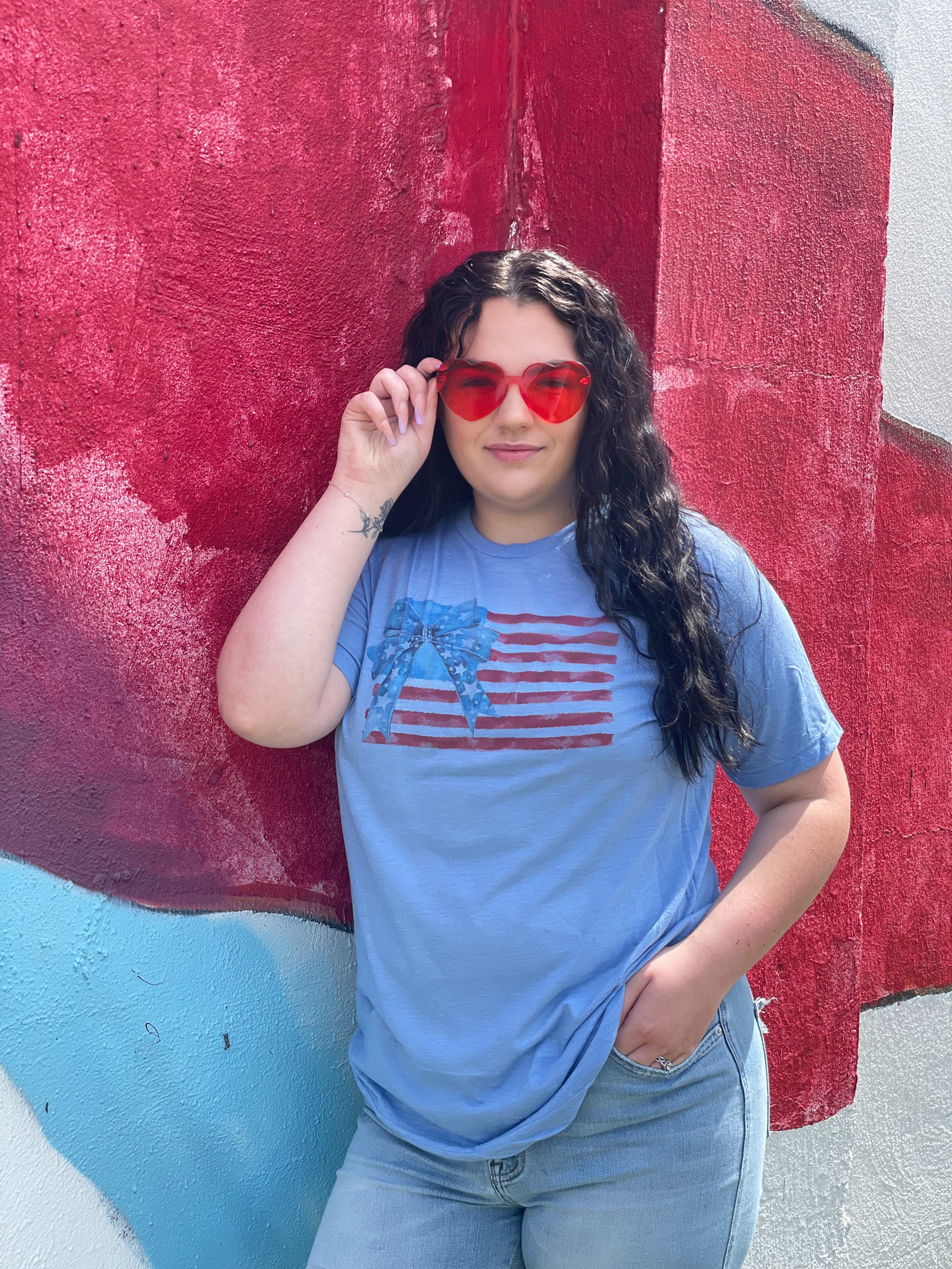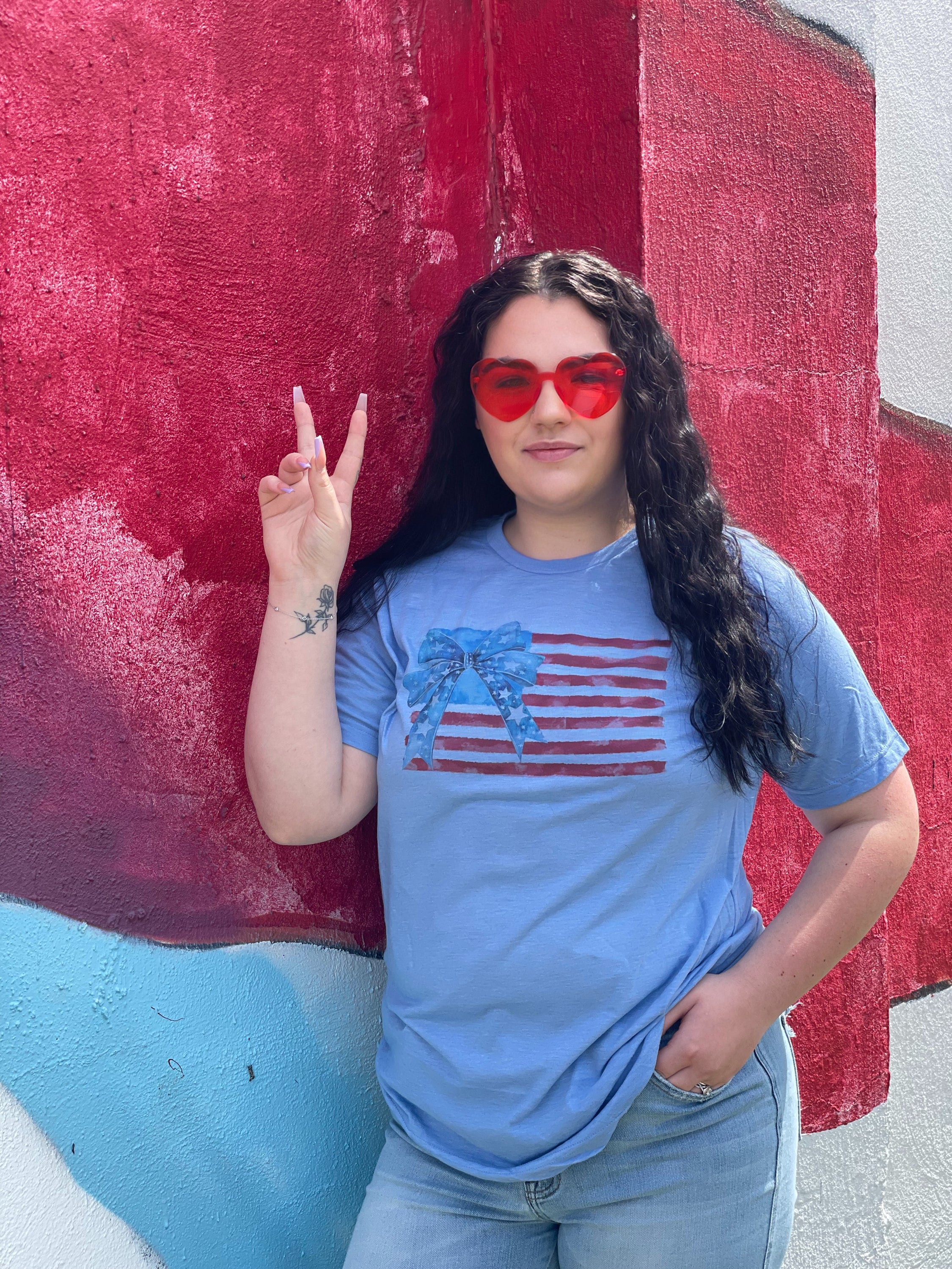 Coquette Flag Tee in Heather Athletic Blue featuring a bold and playful design, perfect for casual wear.