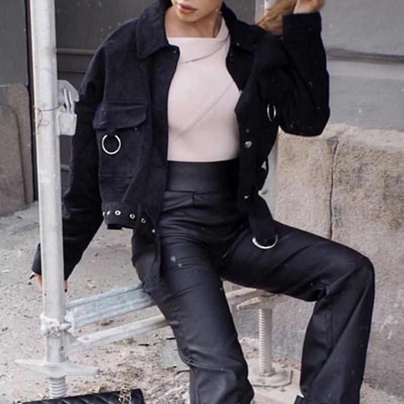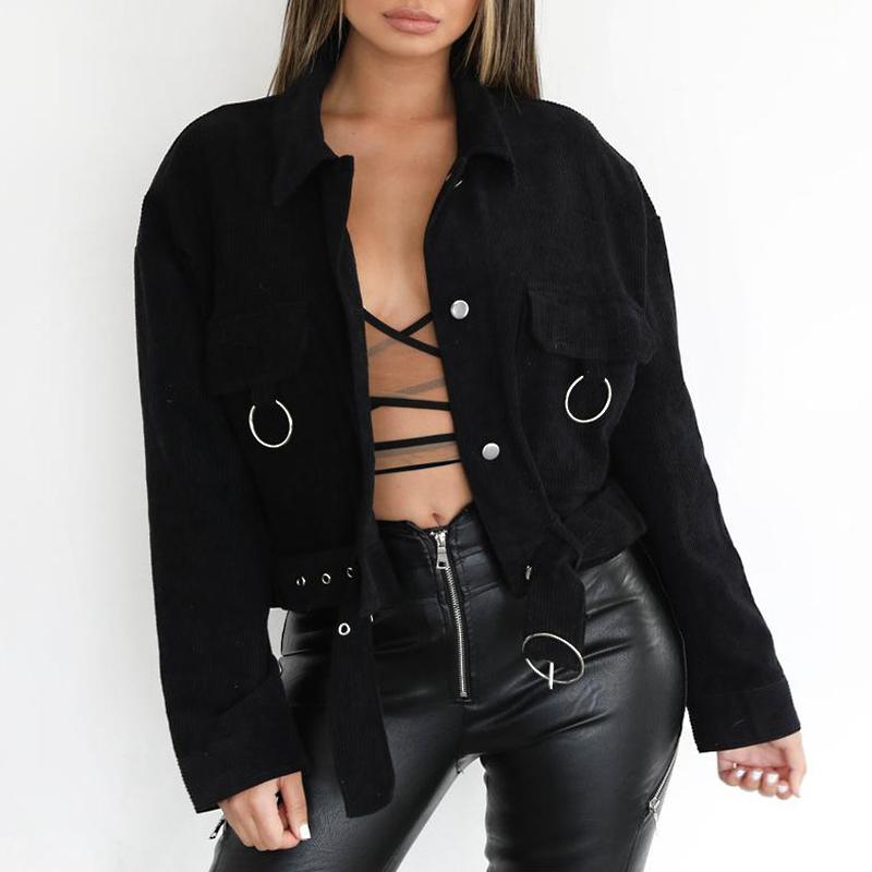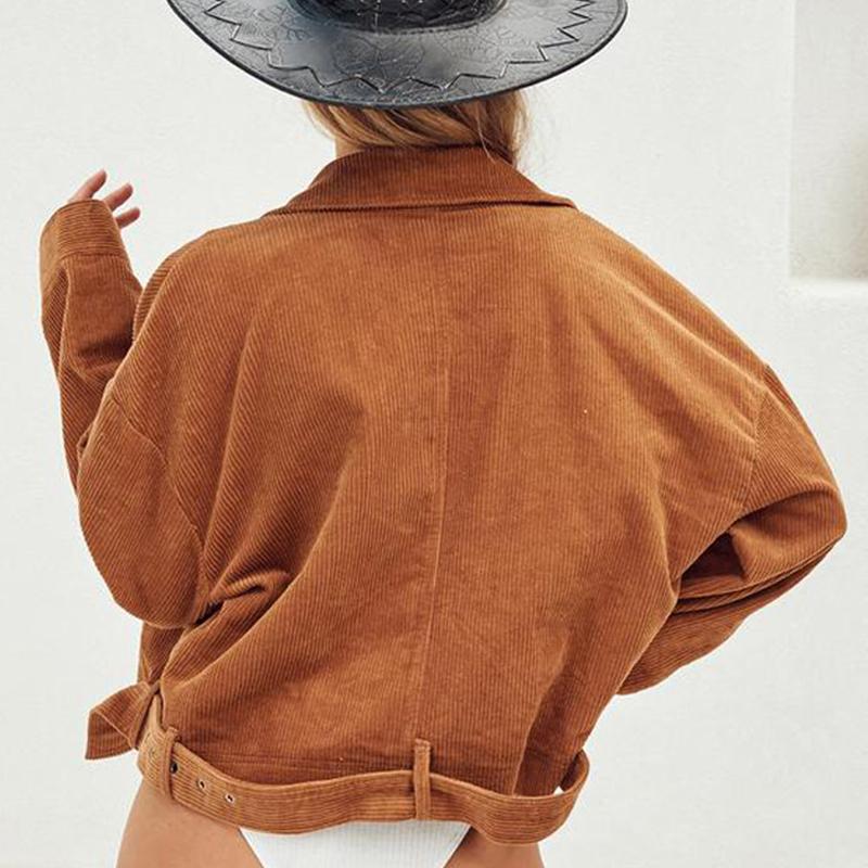 A stylish women's corduroy jacket with a turn-down collar, featuring pockets and a loose fit, perfect for casual and club wear.