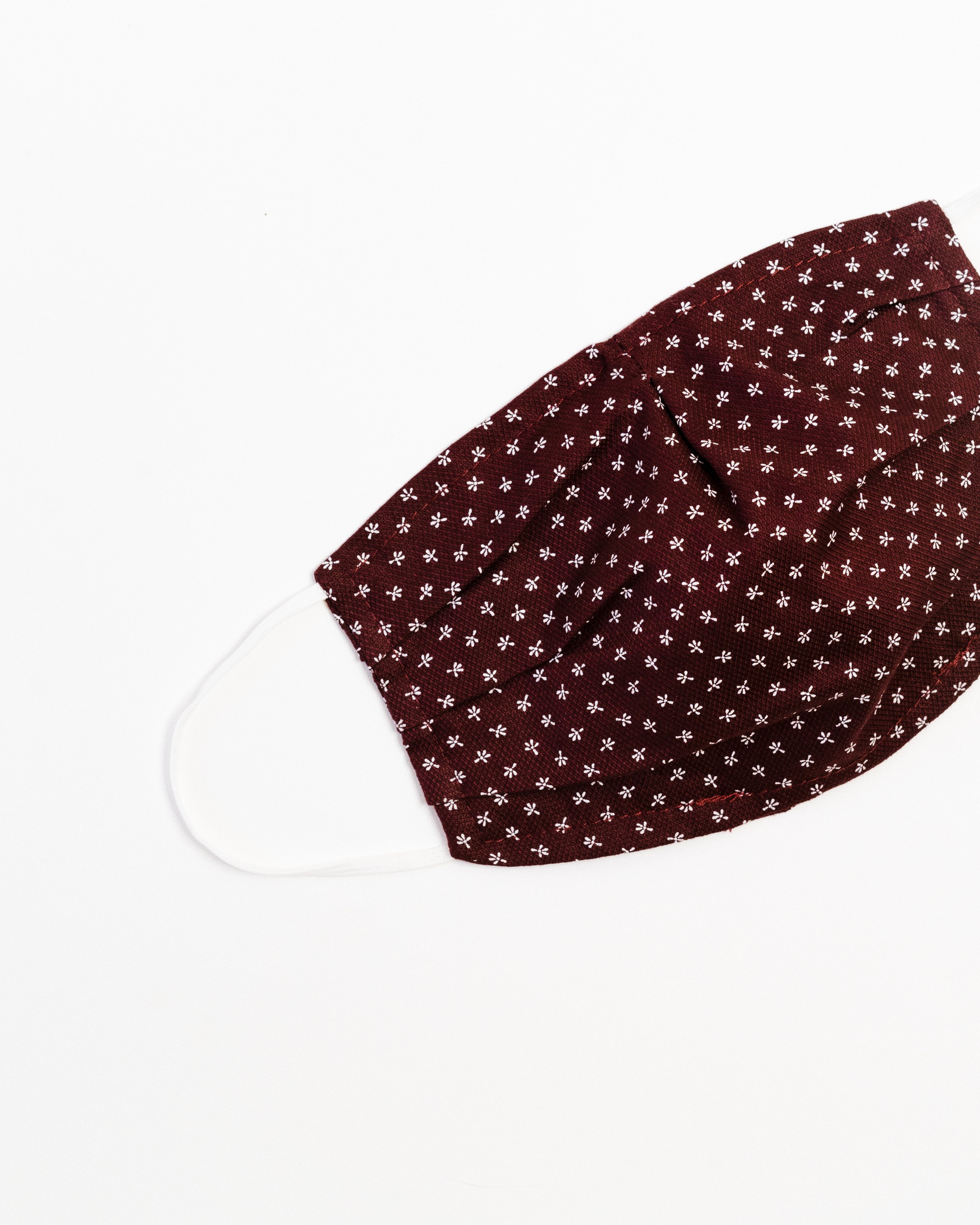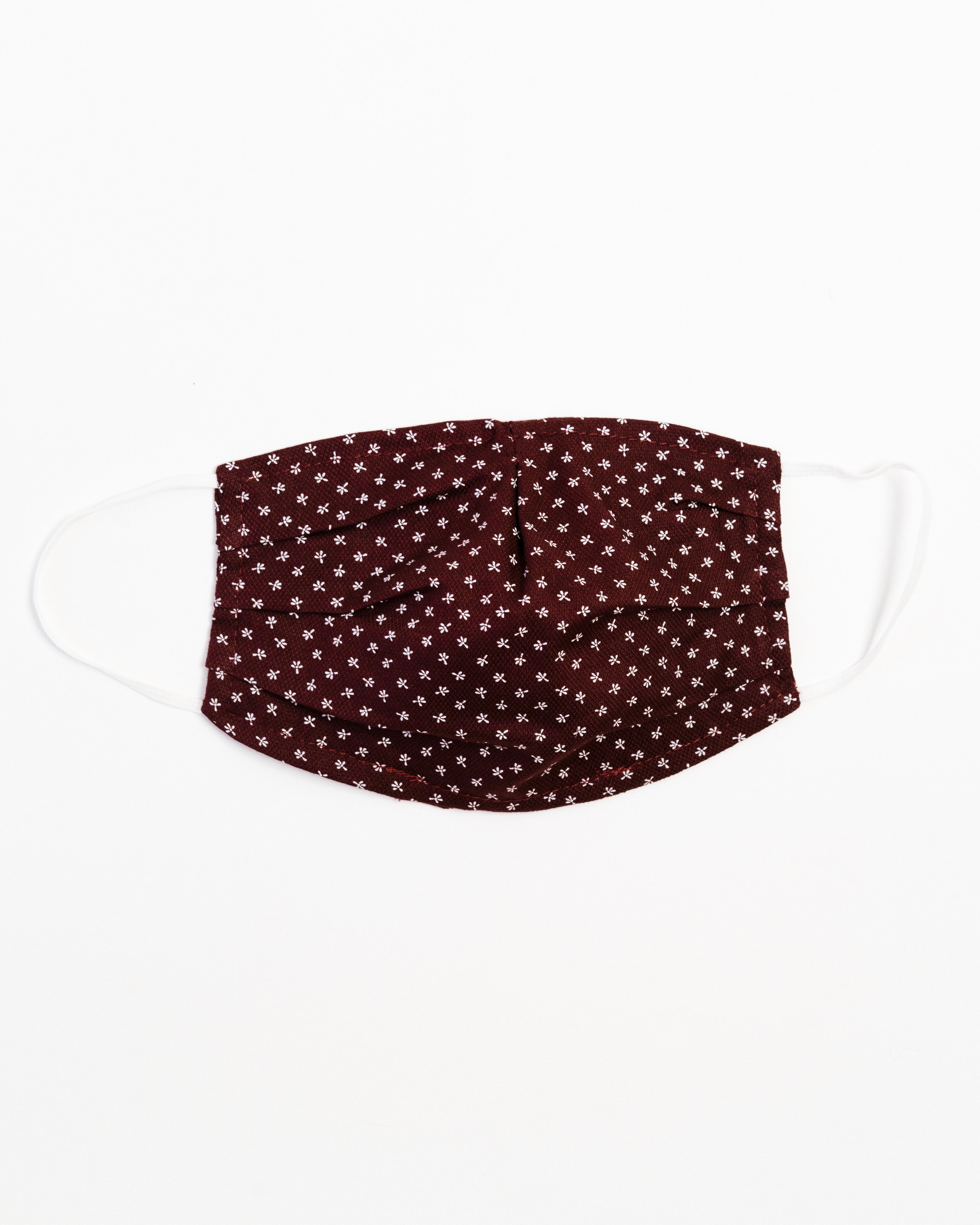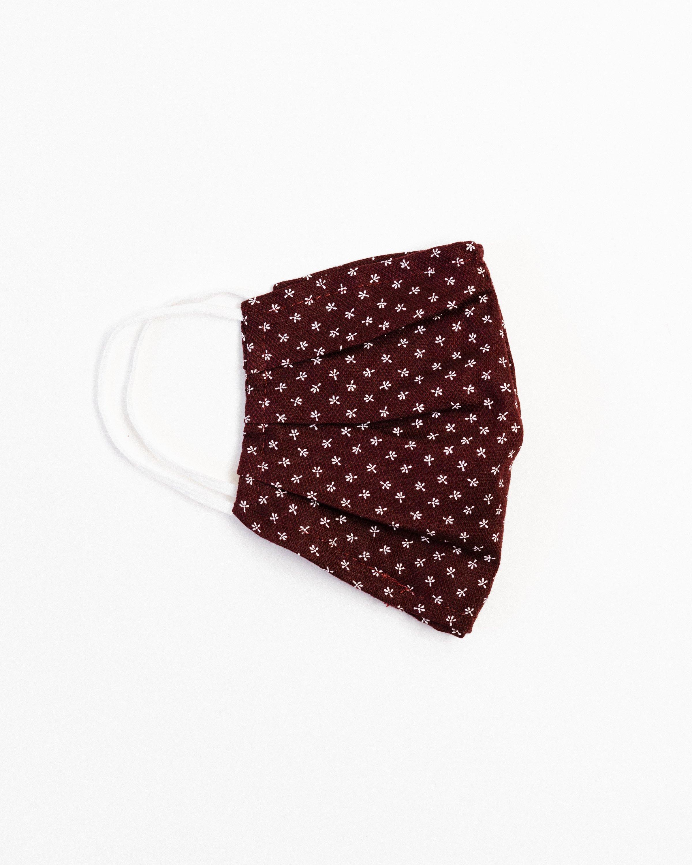 Daisy Burgundy face mask made of 100% cotton, featuring a classic burgundy print, designed for comfort and style with pleats for a perfect fit.