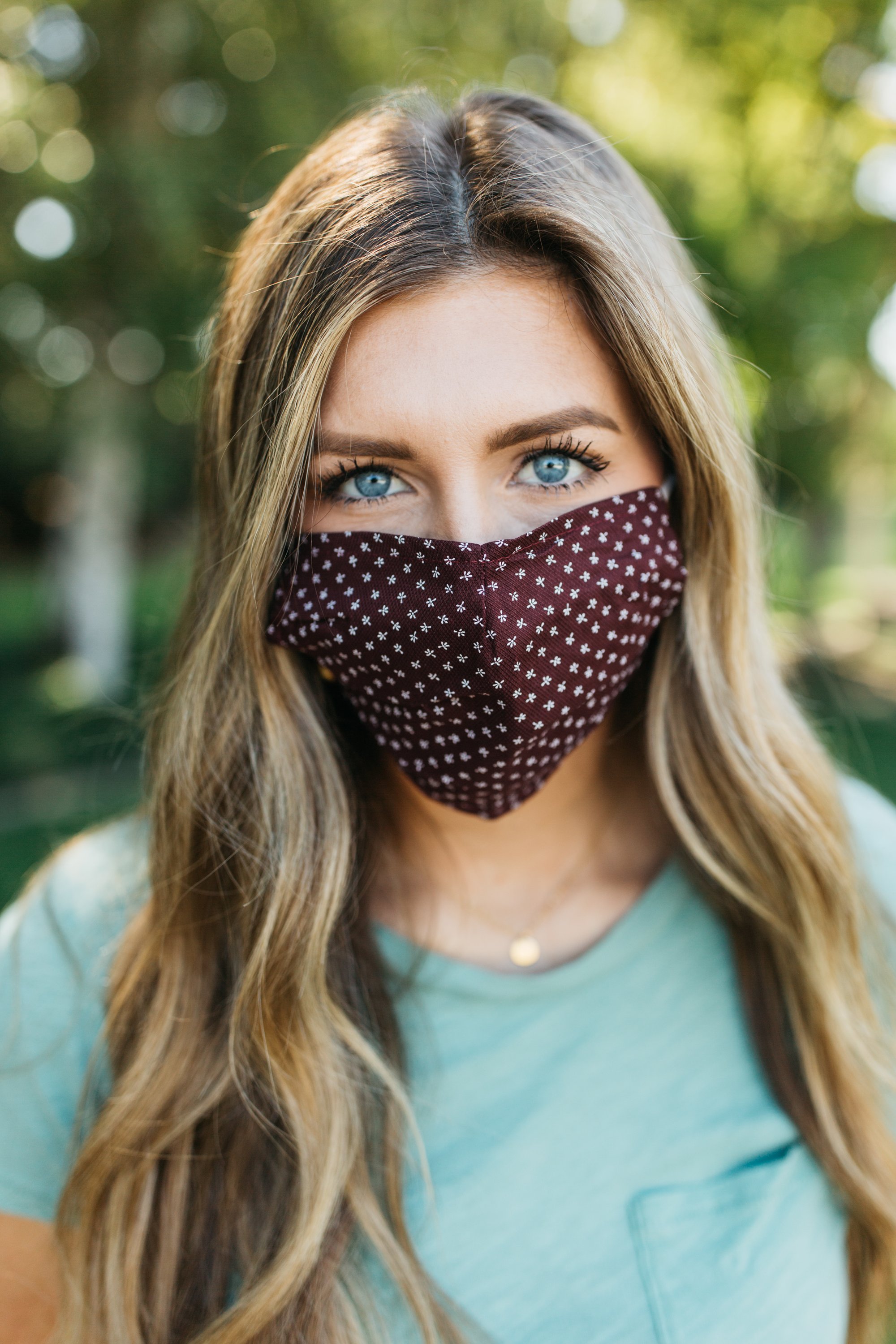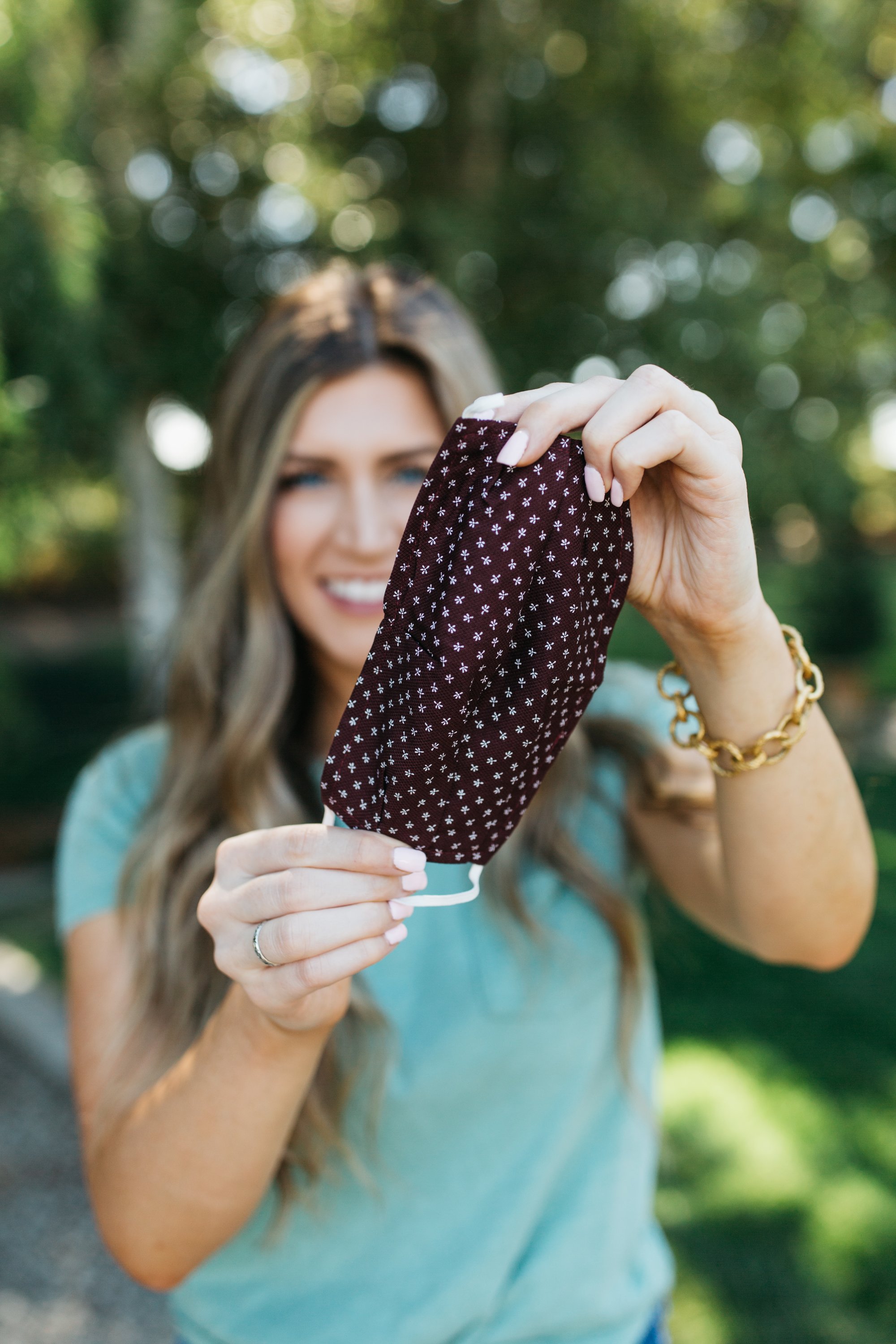 Available in a classic burgundy print, the Daisy mask is suitable for all genders, making it a versatile addition to your wardrobe. Whether you're heading to the grocery store or running errands, this mask is easy to store in your car or purse for quick access. The thoughtful design features four pleats on each side, allowing for an ultimate fit and comfort, while a nose pleat adds extra room for a better fit.