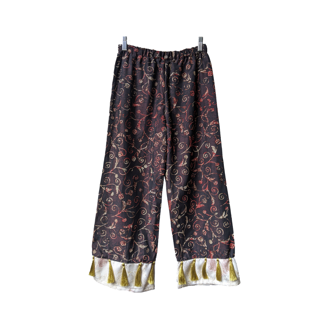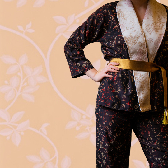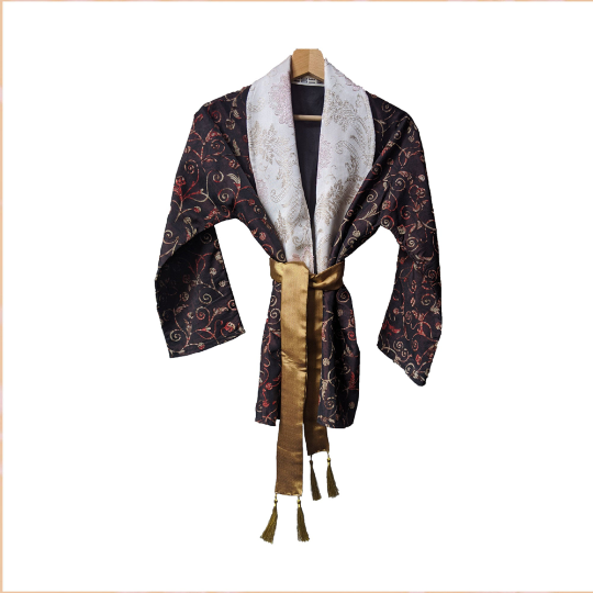 The fabric belt that accompanies the DALIA suit is adorned with golden handmade tassels, adding a luxurious touch to the overall look. This belt not only cinches the waist for a more defined silhouette but also serves as a statement accessory that enhances the outfit's elegance. The combination of the belt and the kimono jacket creates a harmonious balance of style and sophistication.