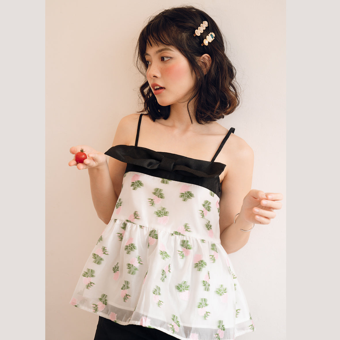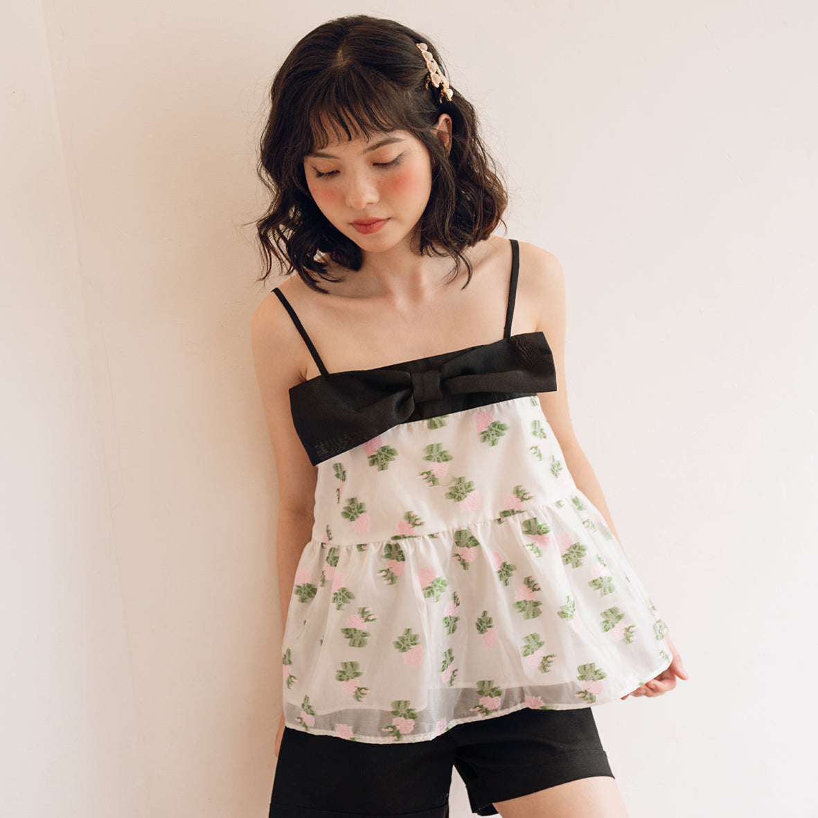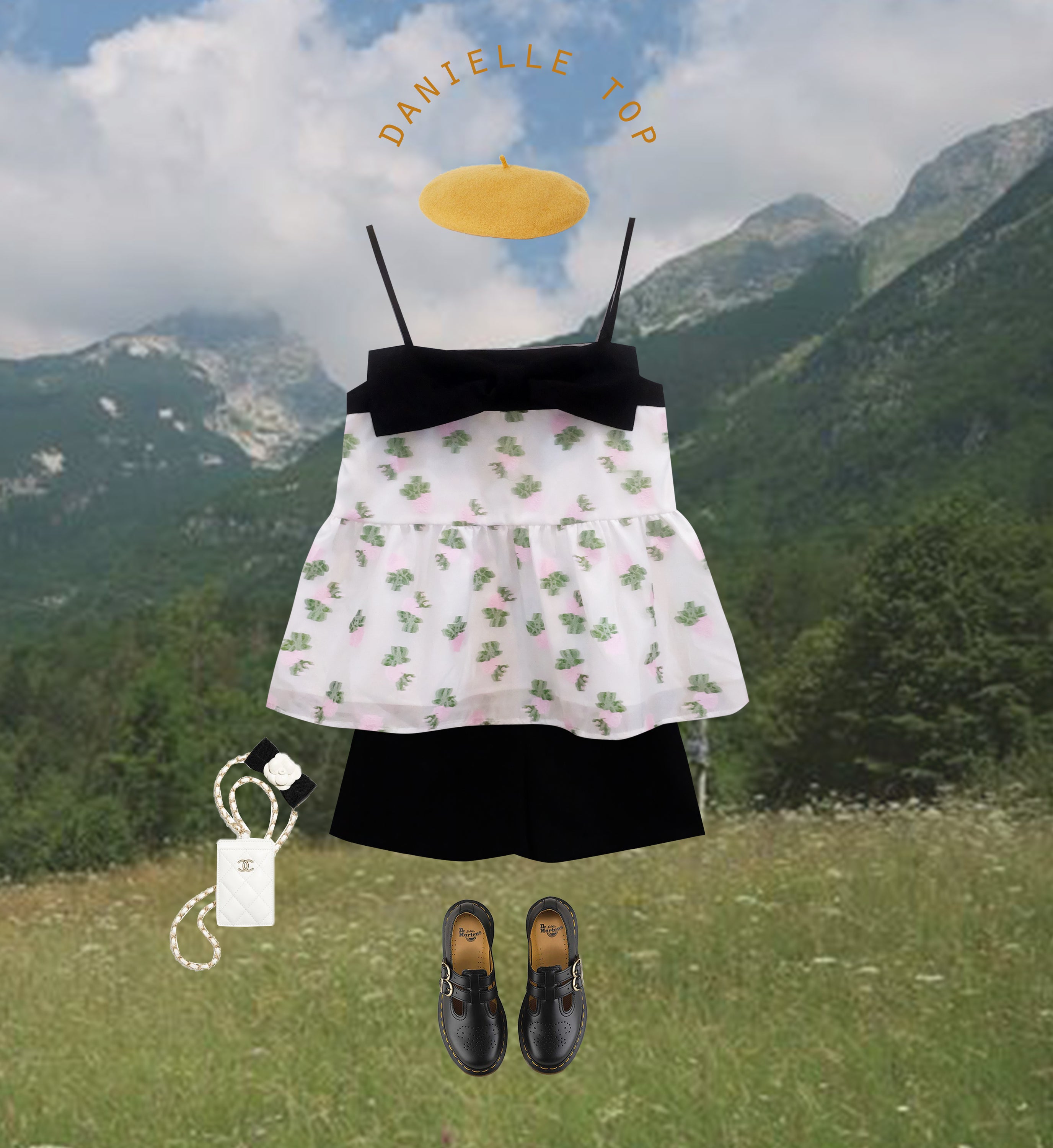 One of the standout features of the Danielle Top is its large bow at the chest, which not only enhances its aesthetic appeal but also adds a playful element to the overall design. The bow is complemented by a black tassel that introduces a slight shimmer, making this top suitable for both casual outings and more formal occasions.