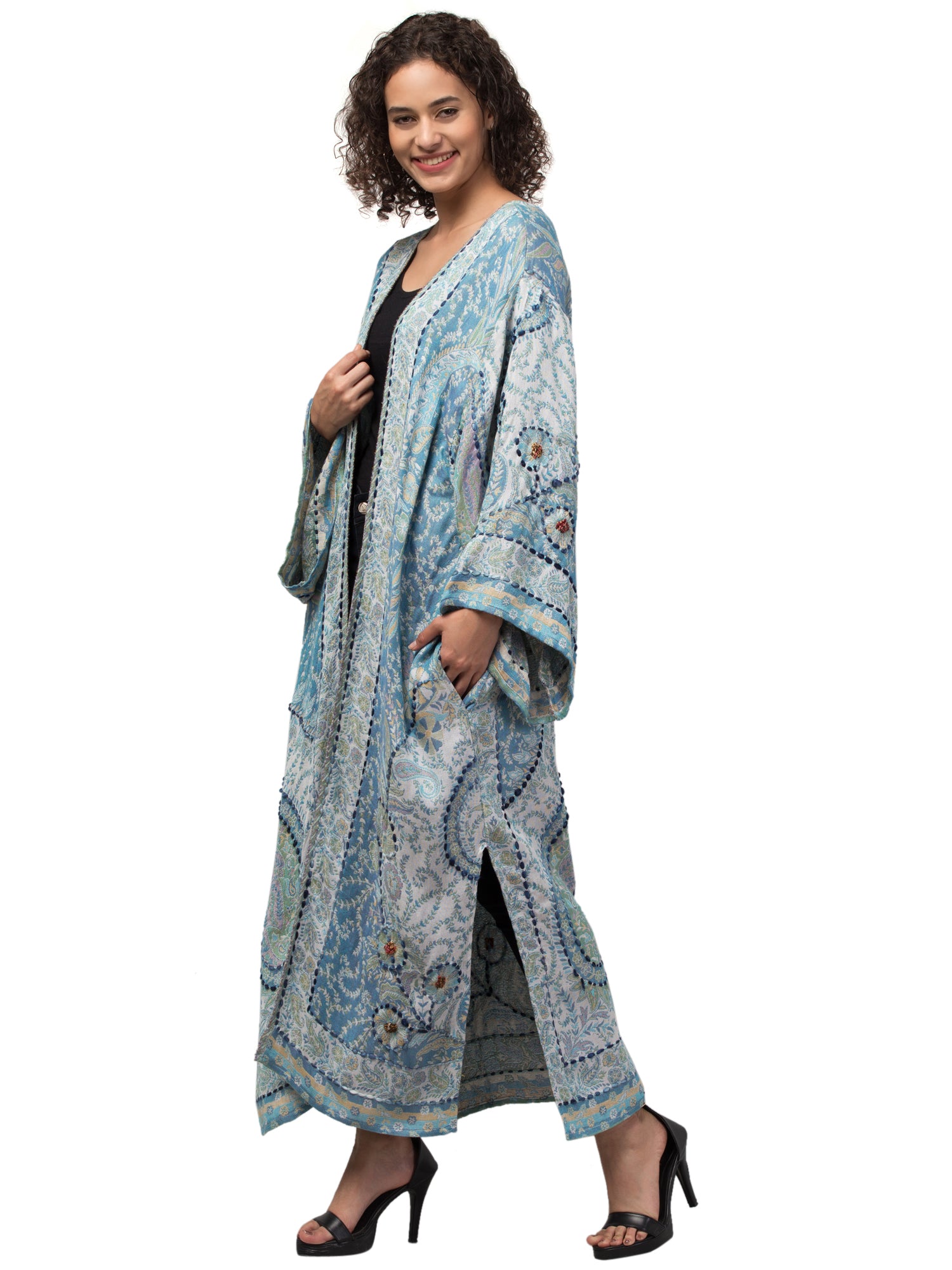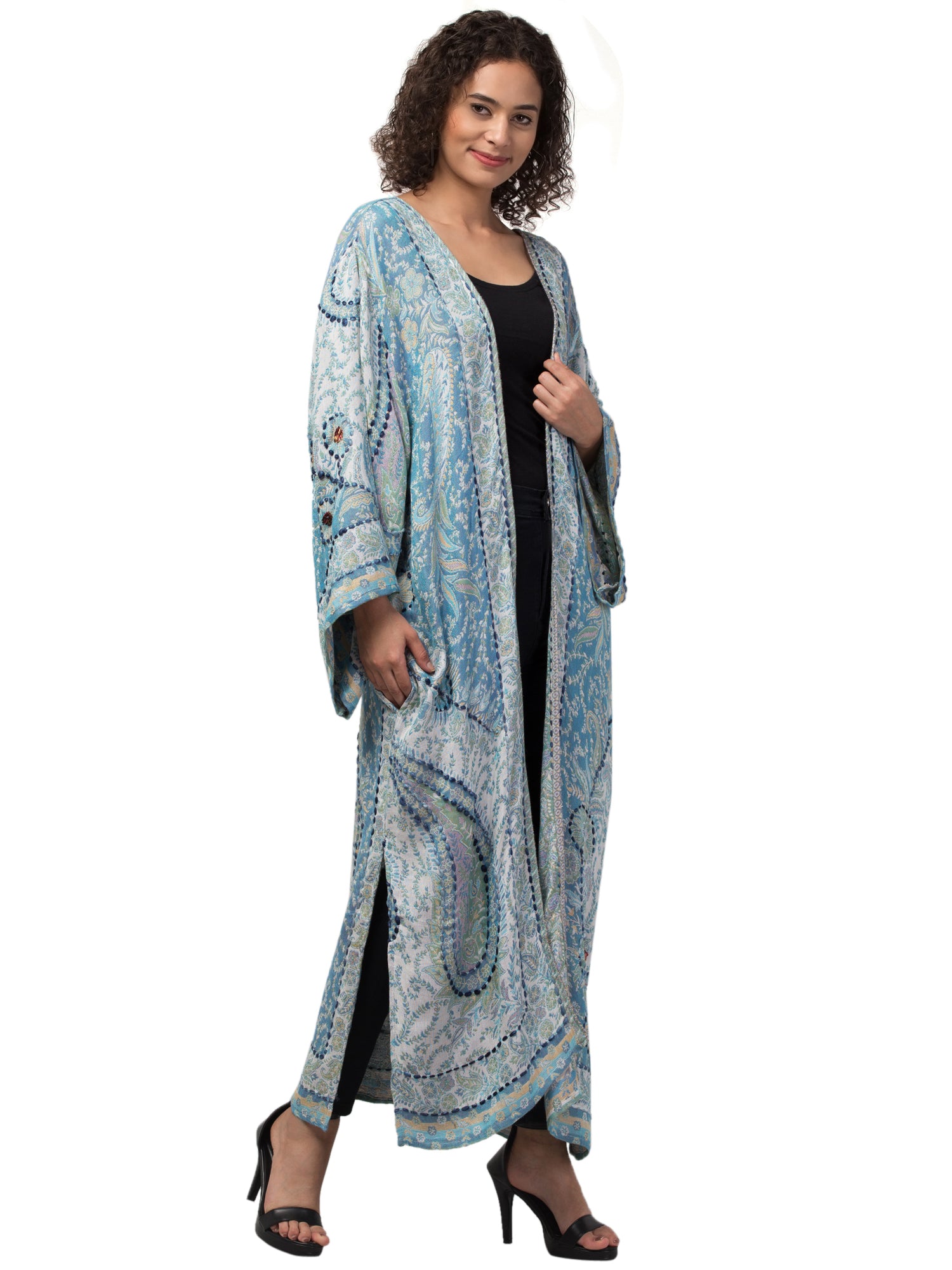 The Diana Sapphire Kimono Jacket is not just a piece of clothing; it's a statement of style and craftsmanship. This exquisite jacket is handcrafted by skilled artisans in India, ensuring that each piece is unique and of the highest quality. With its intricate hand embroidery and vibrant colors, this kimono jacket embodies the essence of Bohemian elegance, making it a perfect addition to your wardrobe.