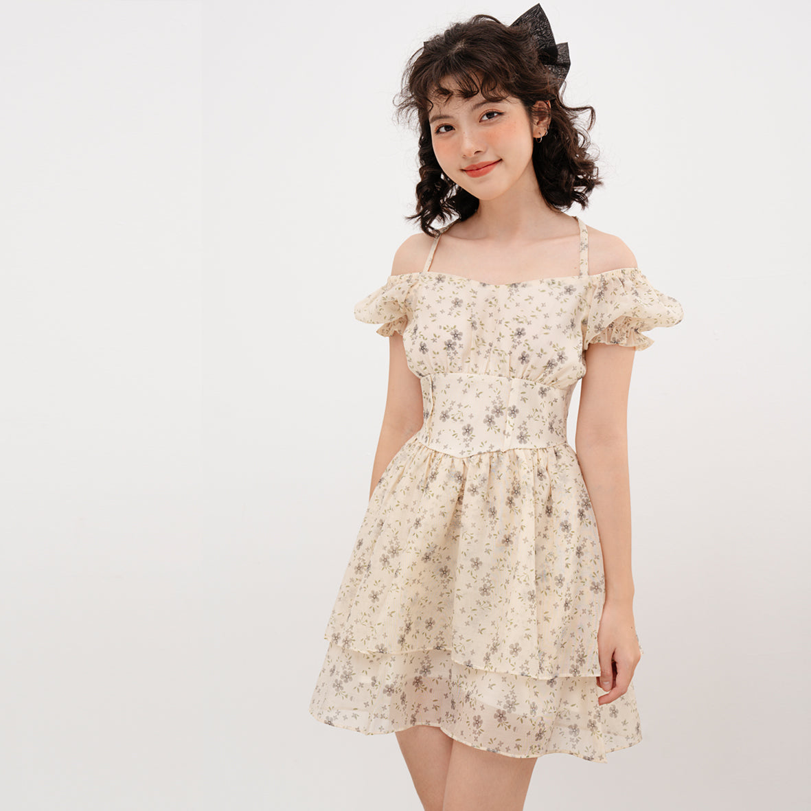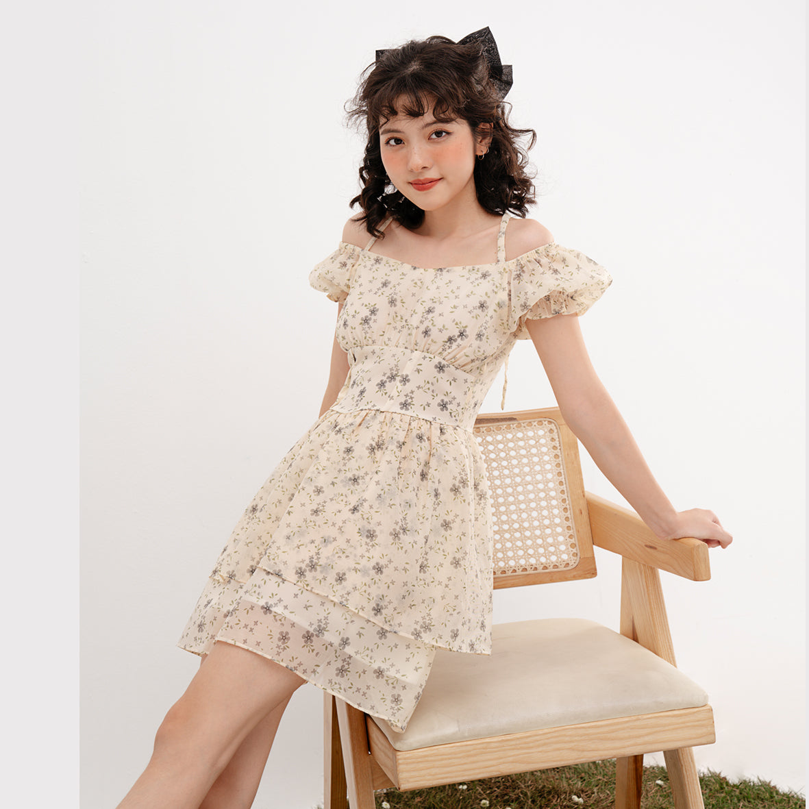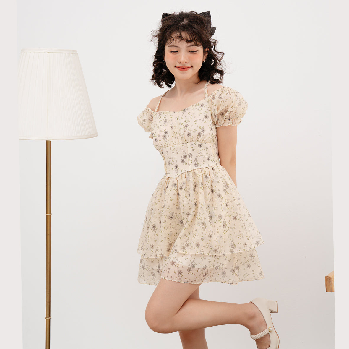 The Doris Dress is a stunning addition to any wardrobe, crafted from exquisite beige silk fabric adorned with charming baby flower prints. This dress is designed to make you feel feminine and elegant, featuring two layers of ruffles that create a beautifully flowing skirt. Whether you're attending a garden party, a wedding, or a casual outing, the Doris Dress is versatile enough to suit any occasion.