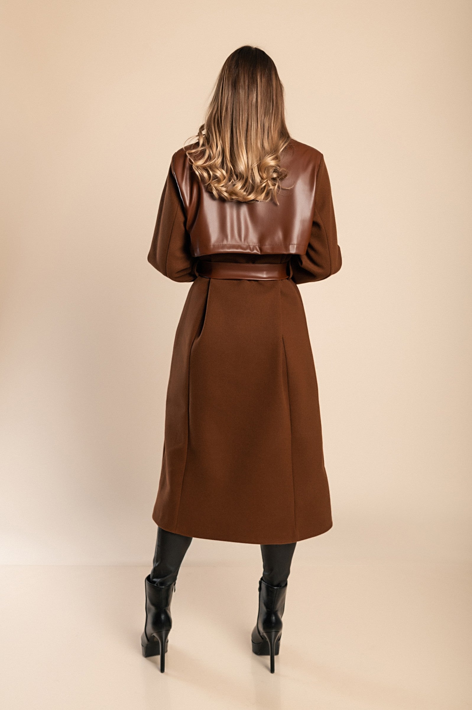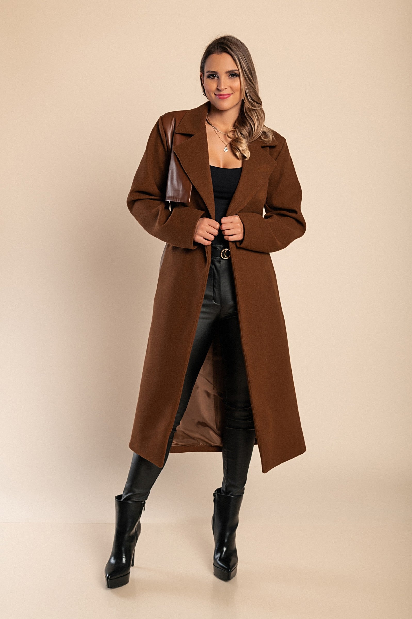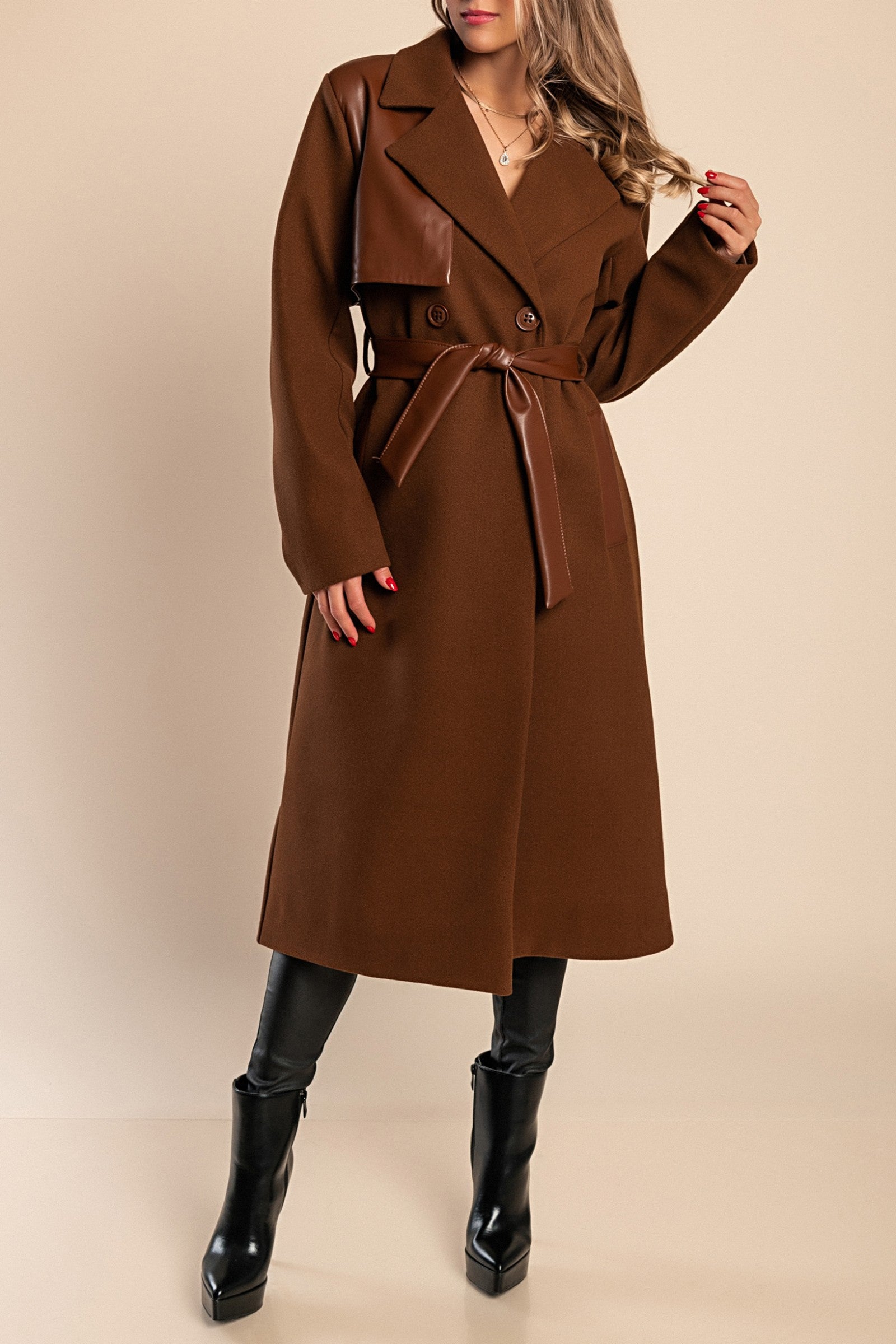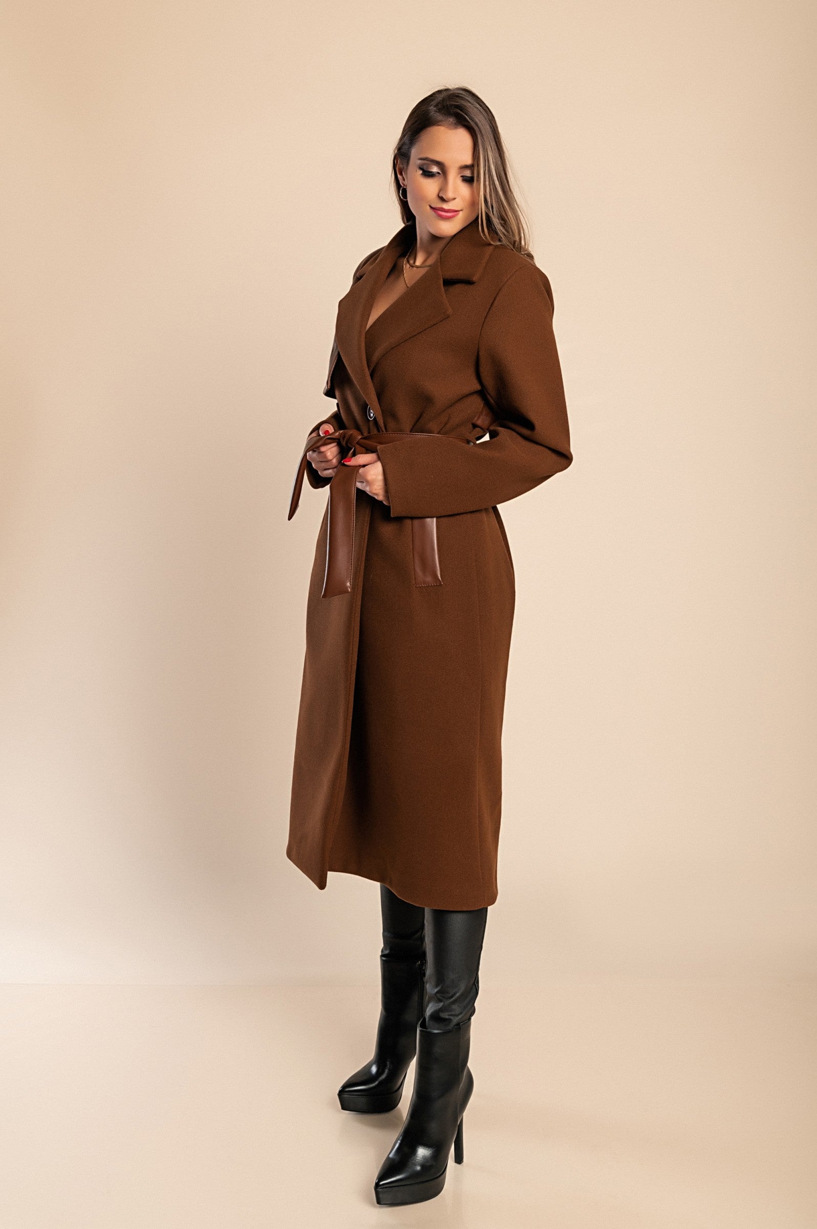 Introducing our Elegant Coat with Faux Leather Details in a rich brown hue, designed for those who appreciate style and comfort. This beautiful lined coat is crafted from high-quality, soft fabric that ensures complete comfort, making it an ideal choice for both casual outings and formal occasions.