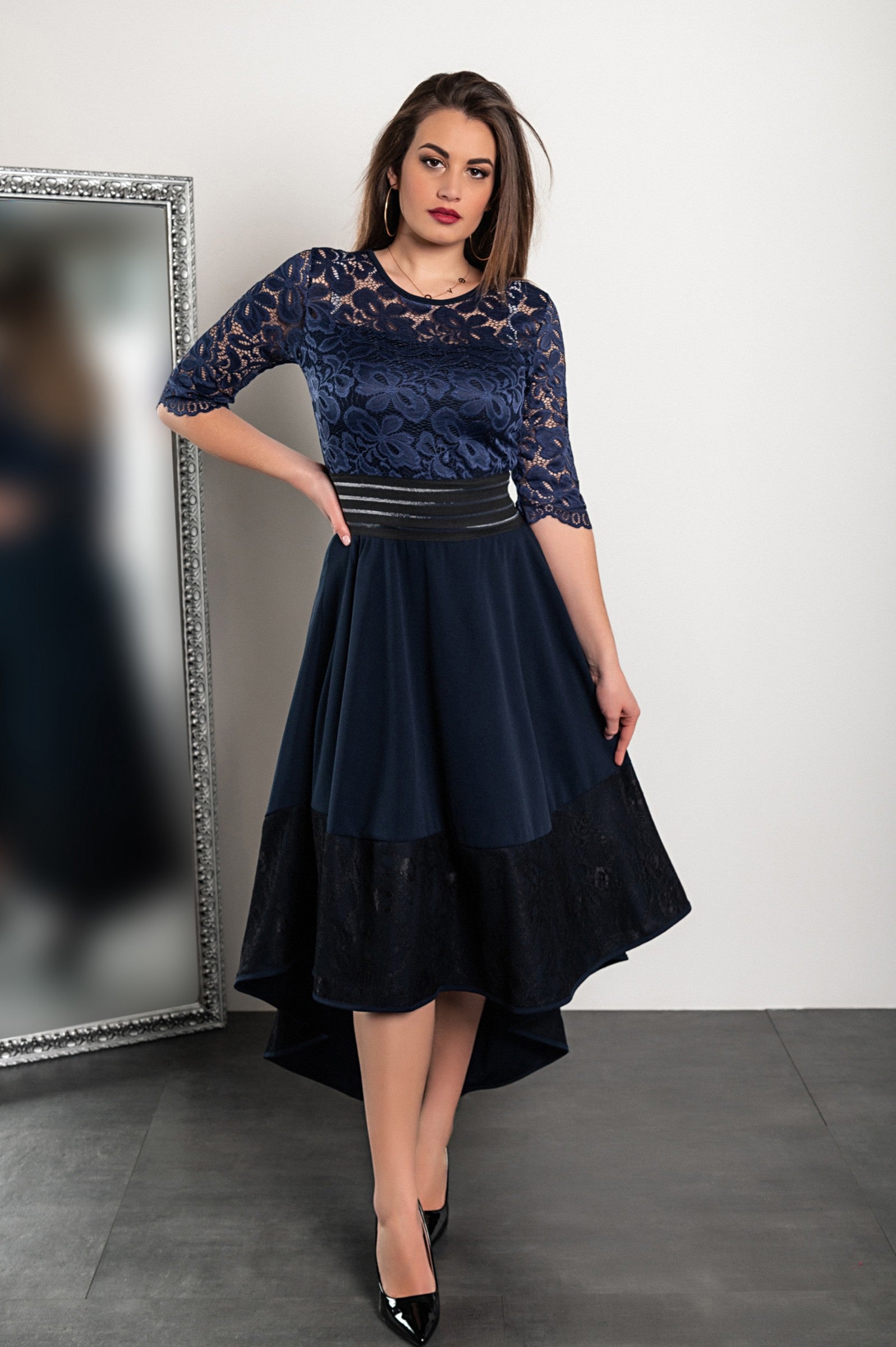 The Elegant Dress with Lace Bianca in dark blue is the epitome of sophistication and style. This fashionable asymmetrical dress is designed to enhance your look, making it perfect for various occasions, from formal events to casual gatherings. The beautiful lace detailing adds a touch of glamour, ensuring you stand out in any crowd.