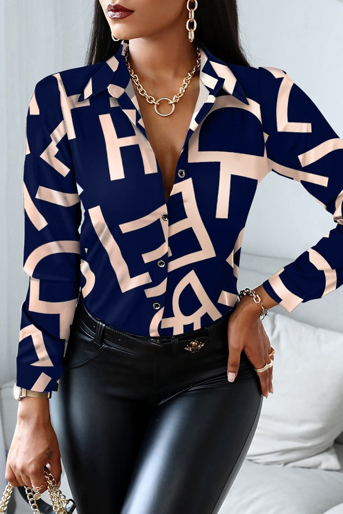 This blouse features a fashionable letter print that adds a unique touch to your outfit. The classic collar and long sleeves provide a timeless silhouette, while the full-length button closure adds a sophisticated element. Whether you're dressing up for a business meeting or going out for a casual lunch, this blouse is versatile enough to suit any occasion.