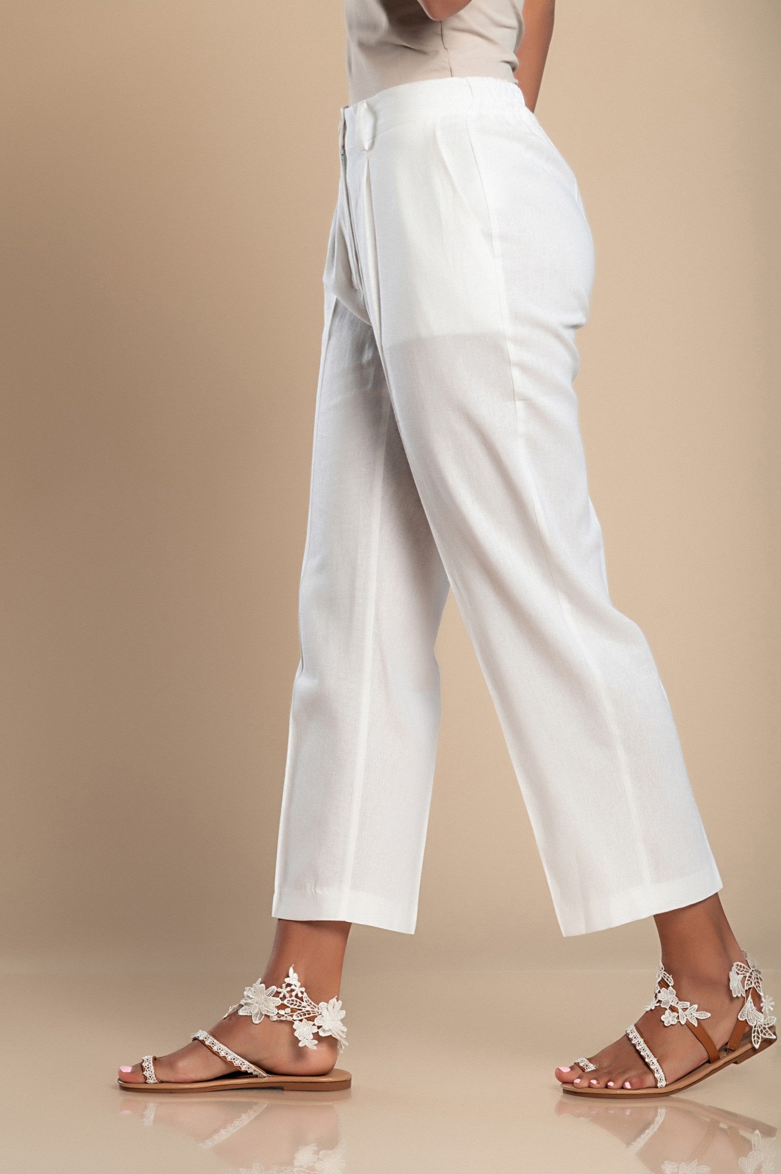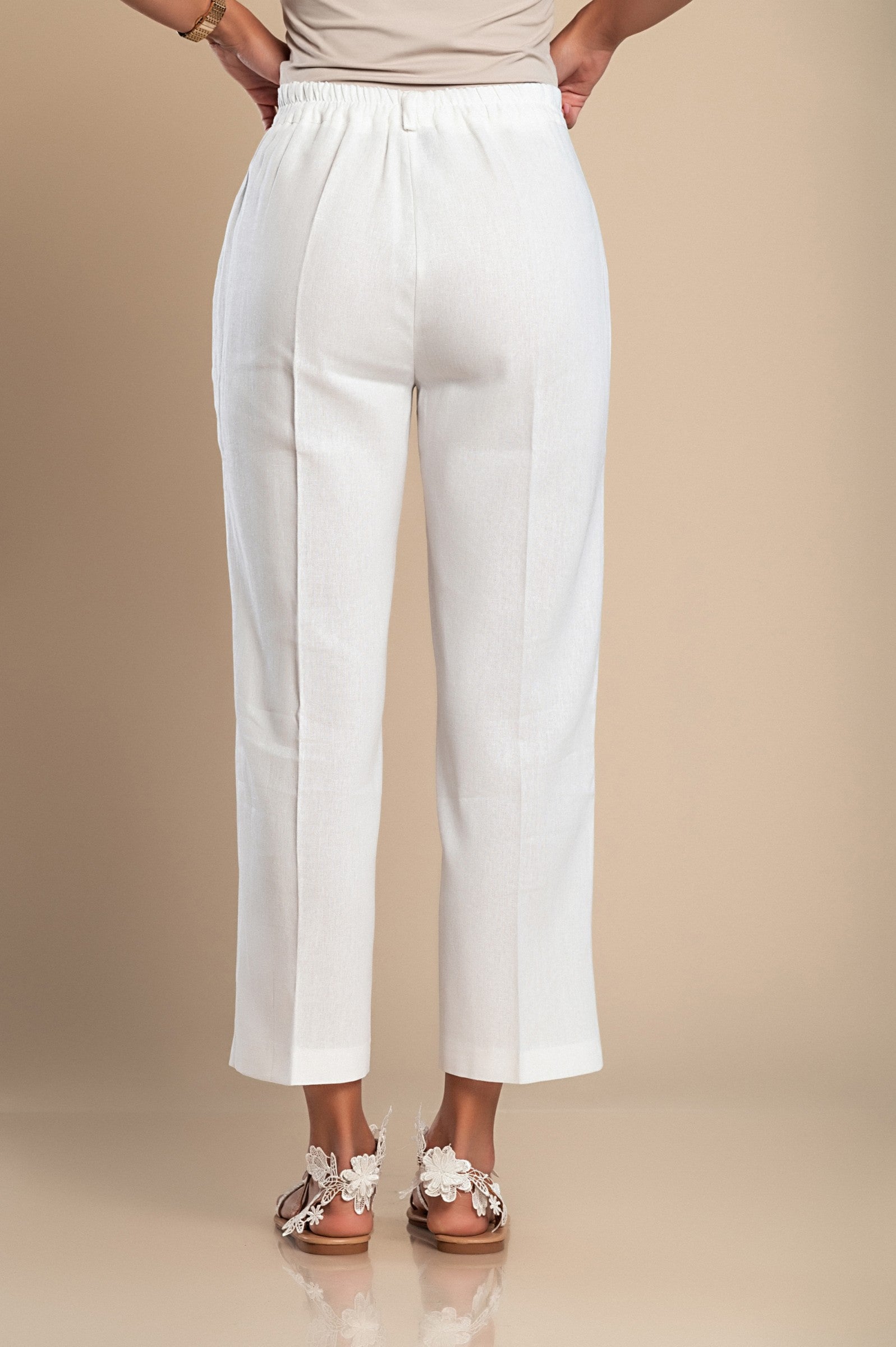 Elegant white linen trousers with straight cut, featuring an elasticated back and side pockets, made in Italy.