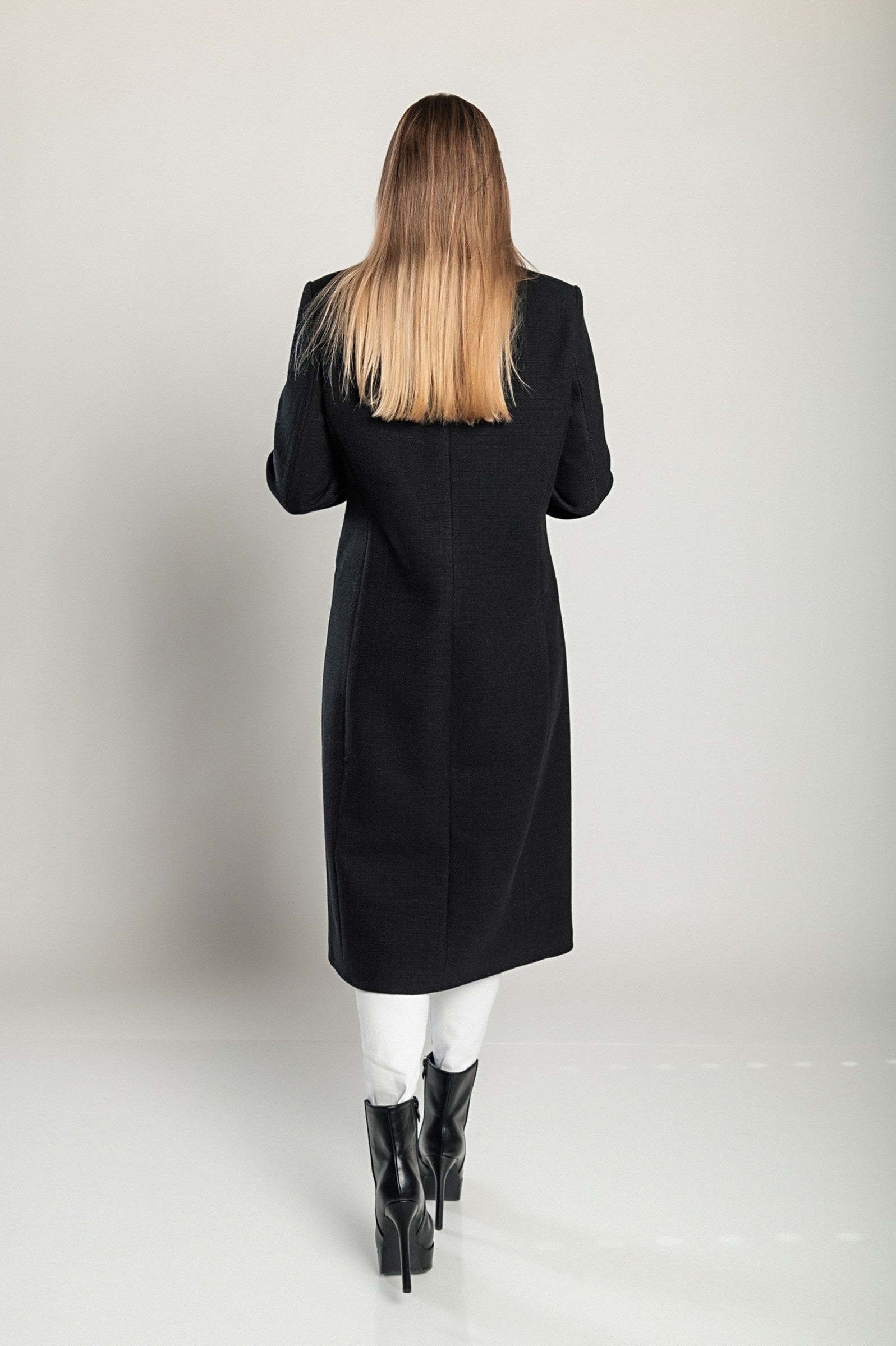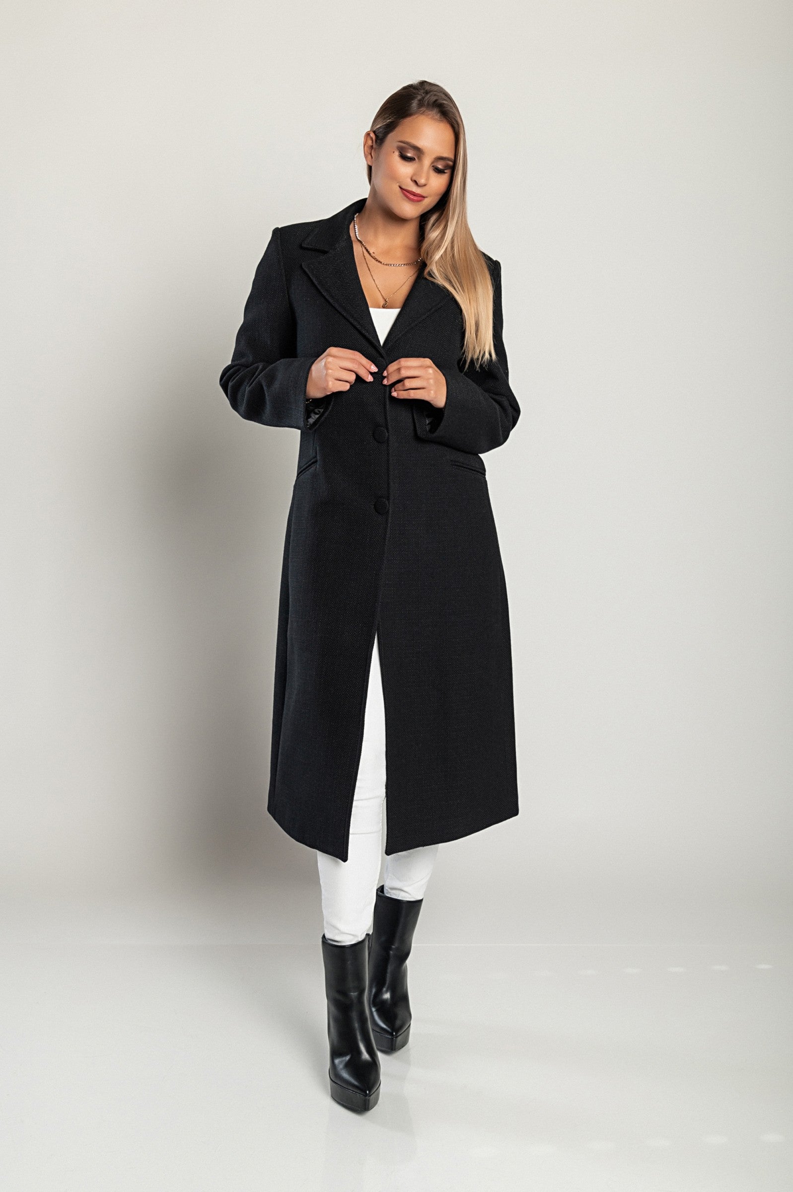 Elegant long black coat with classic collar and button closure, featuring side pockets and long sleeves, made in Italy.