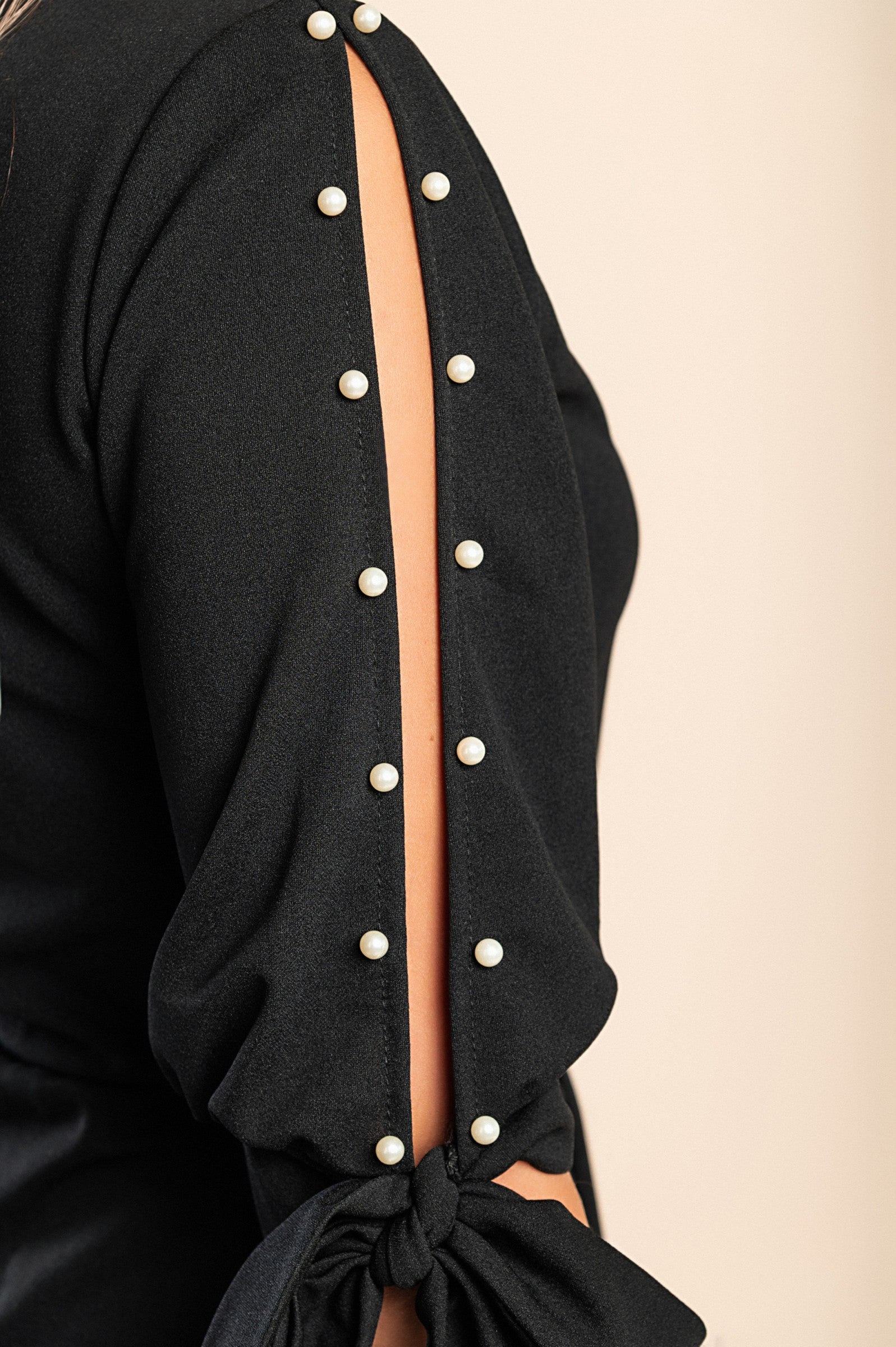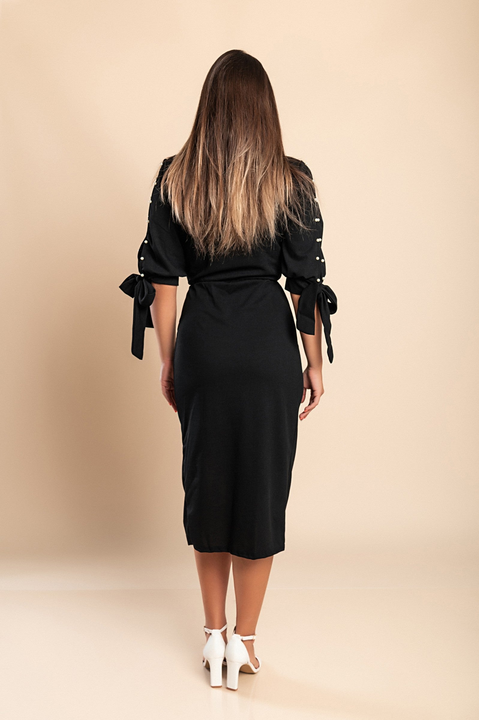 The Elegant Midi Dress with Pearl Detail Peppina in black is a stunning addition to any wardrobe. This dress combines elegance and comfort, making it perfect for various occasions, from formal events to casual outings. Crafted from high-quality fabric, this midi dress ensures that you feel as good as you look. The tight cut of the dress accentuates your figure while providing a flattering silhouette.