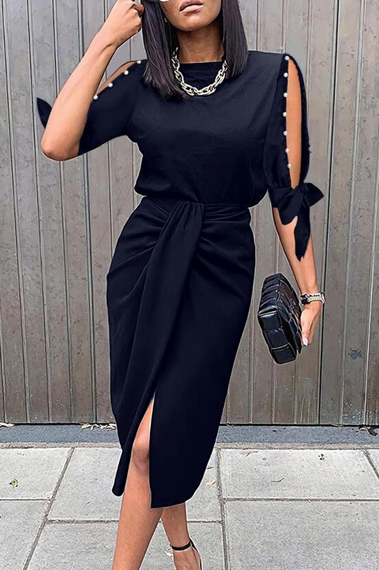 This midi dress features a round neckline that adds a touch of elegance. The 3/4 sleeves come with an opening, enhancing the overall design while allowing for ease of movement. The decorative artificial pearls add a unique flair, making this dress stand out in any setting. The ribbons to tie further enhance the dress's stylish appeal, allowing you to adjust the fit to your preference.