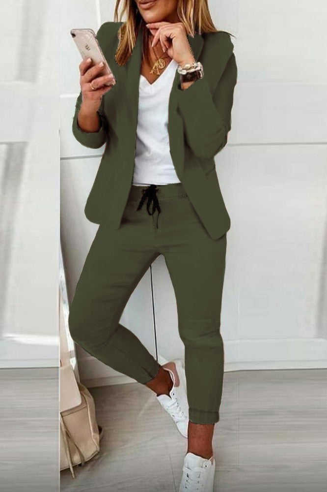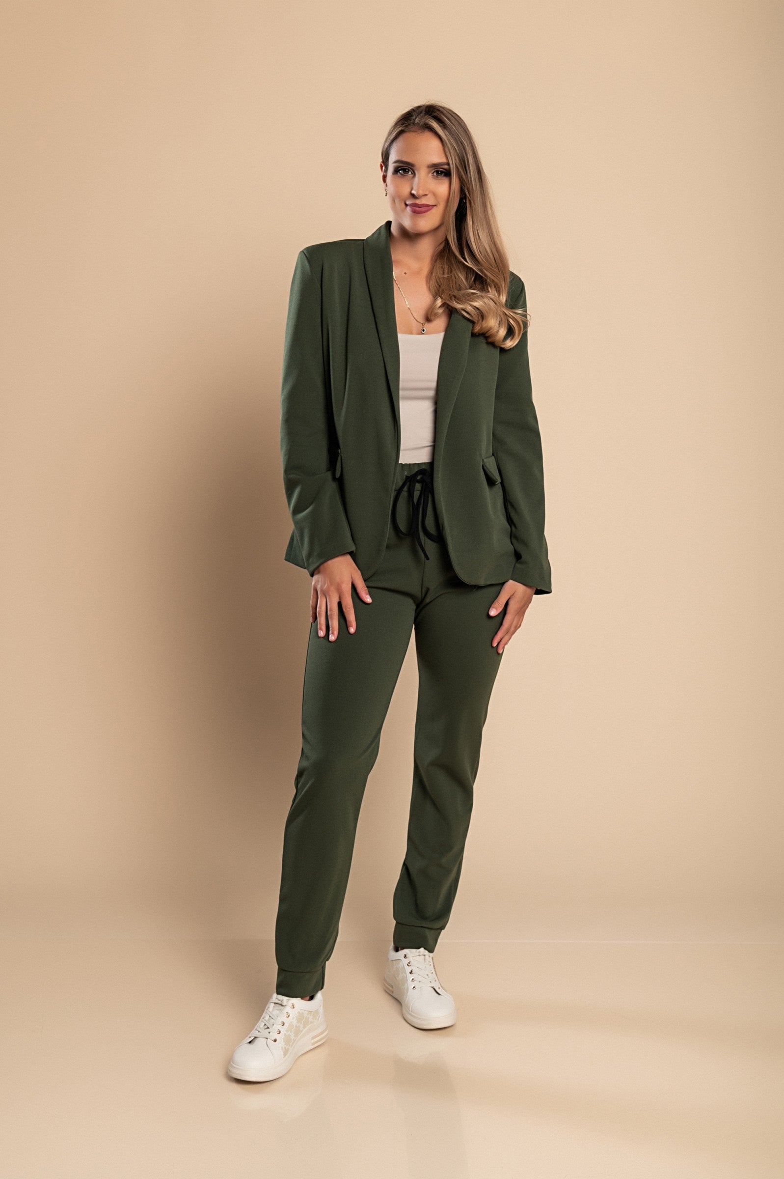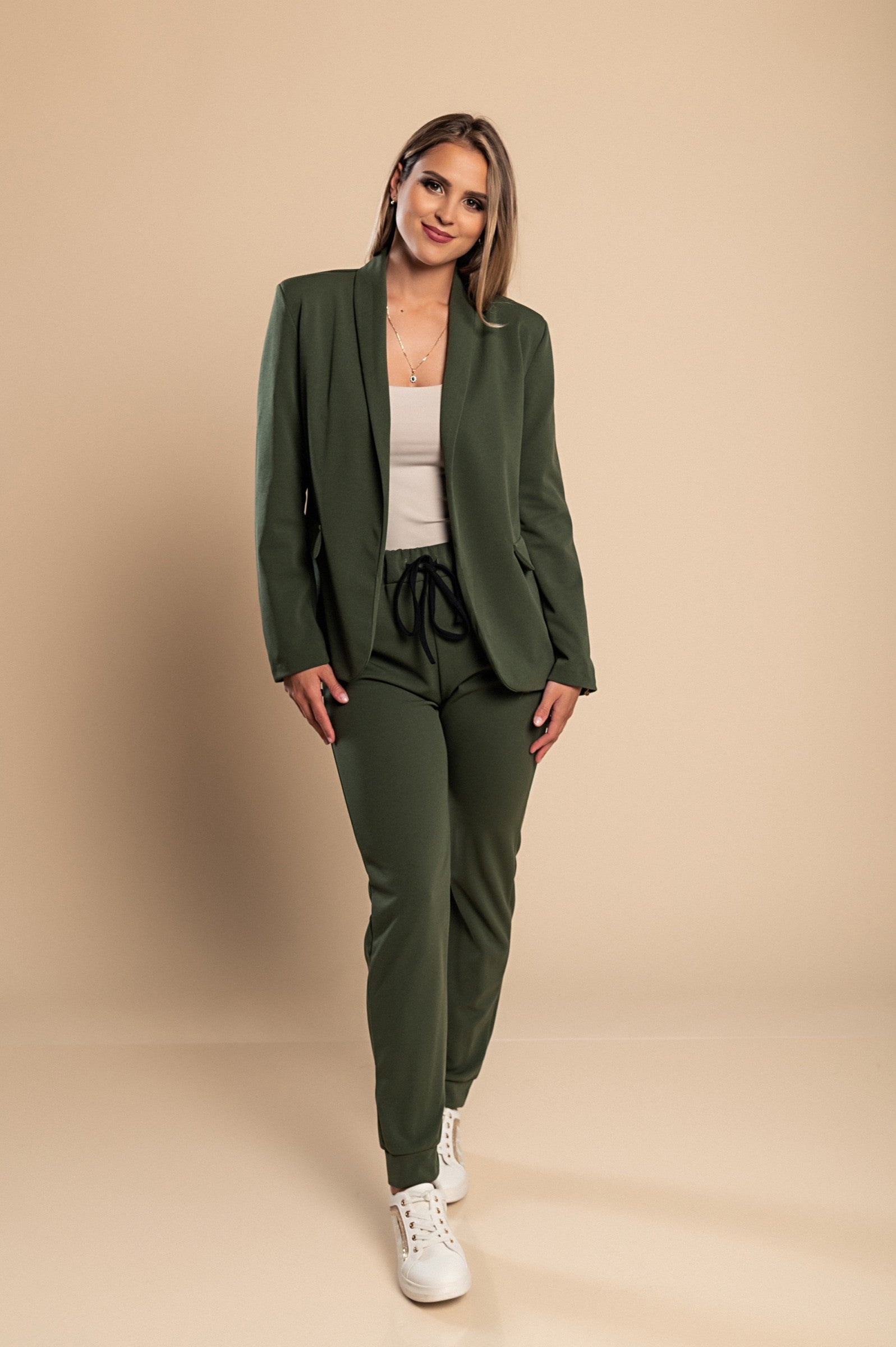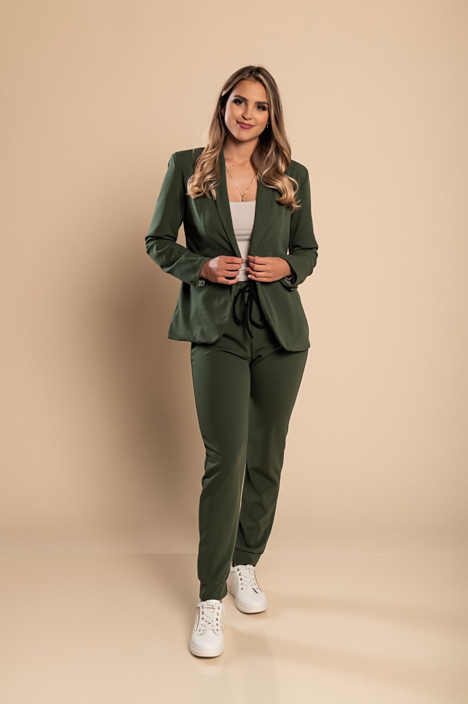Modni blazer s klasičnim ovratnikom in dolgimi rokavi doda pridih elegance. Blazer je zasnovan tako, da se lepo prilega telesu, kar poudari vašo postavo. Dolge in oprijete hlače so zasnovane z elastiko in vrvico v pasu, kar omogoča prilagodljivo nošenje in udobje. Ta kombinacija zagotavlja, da boste vedno izgledali sofisticirano in moderno.