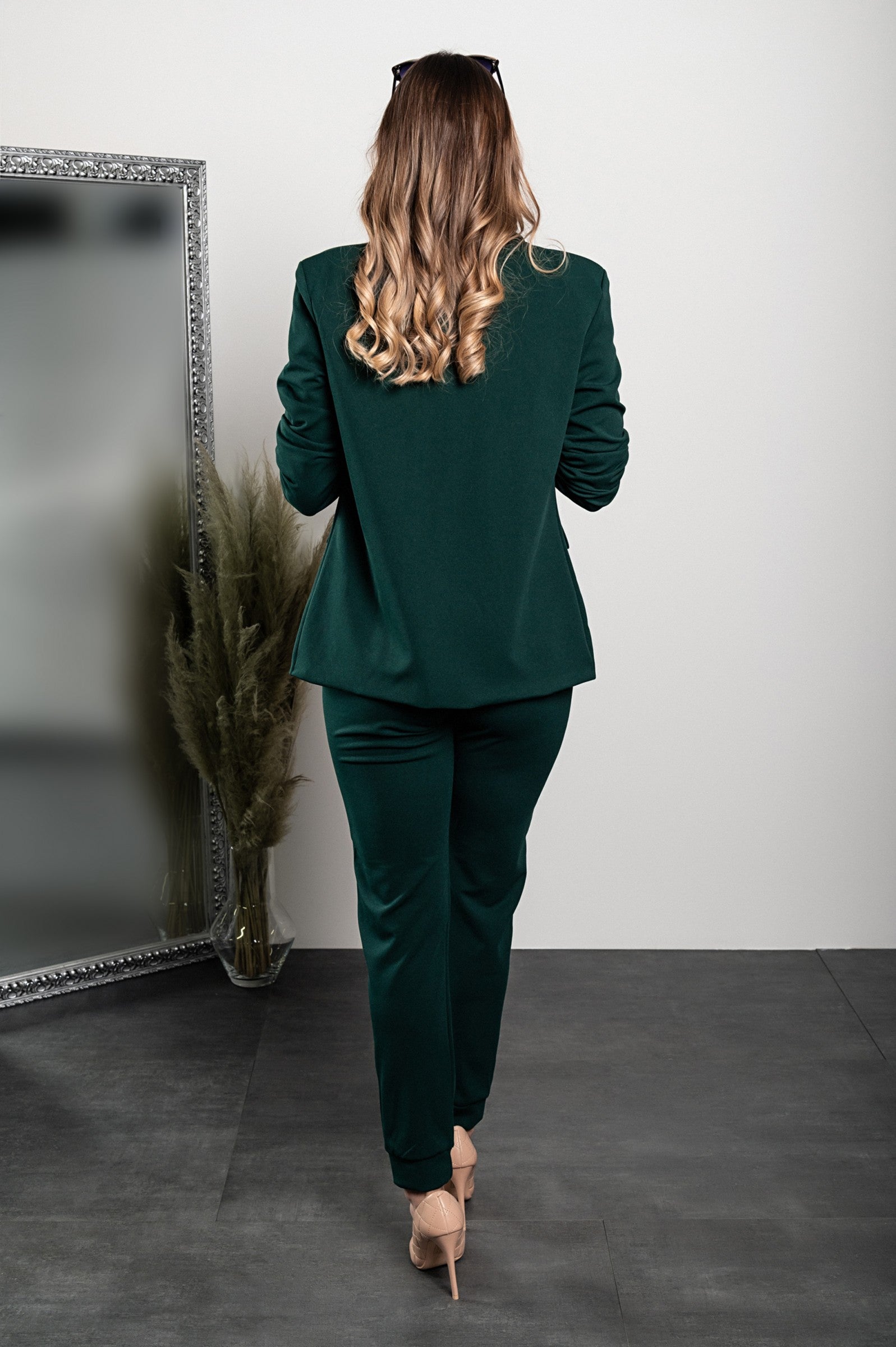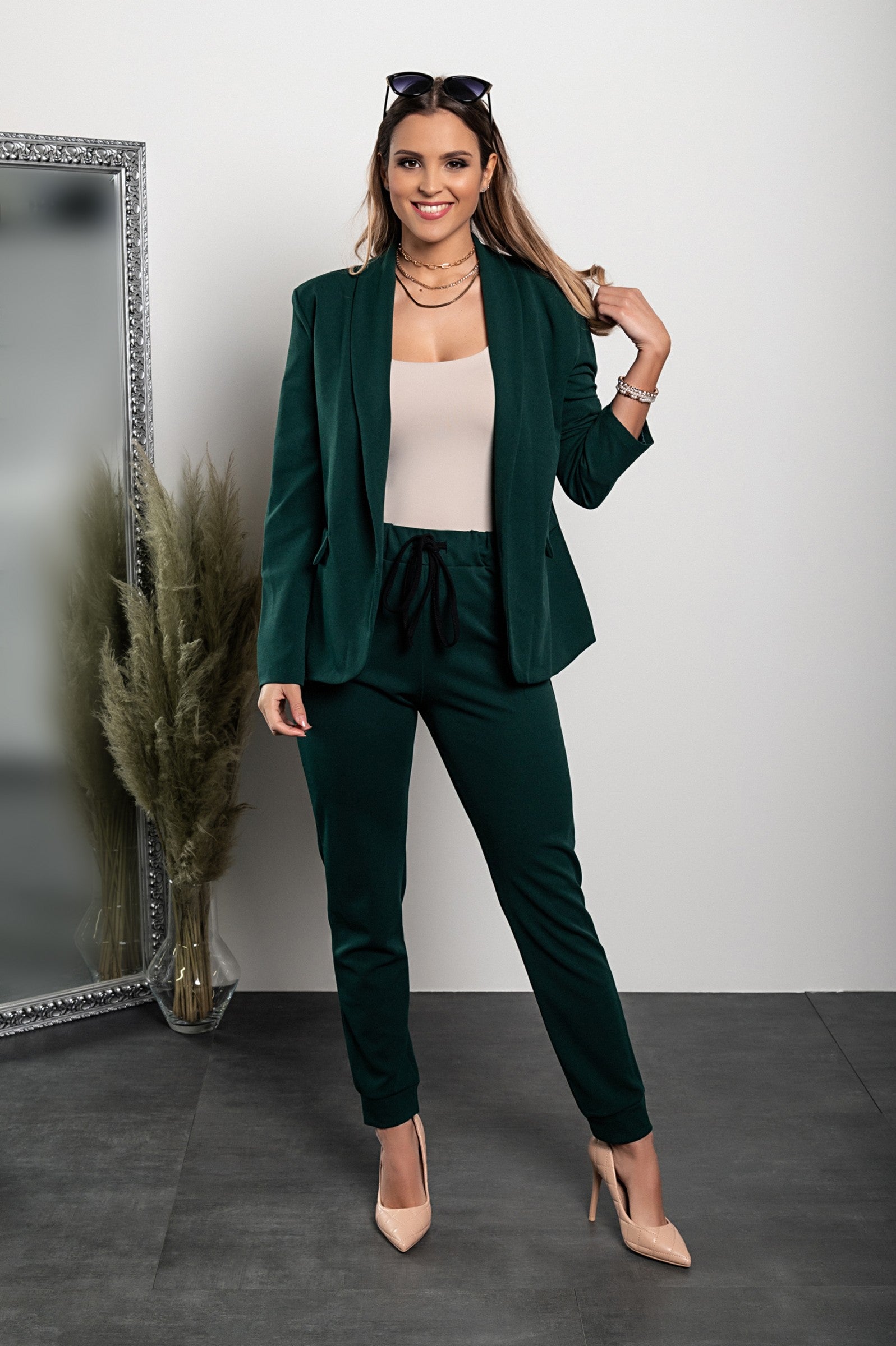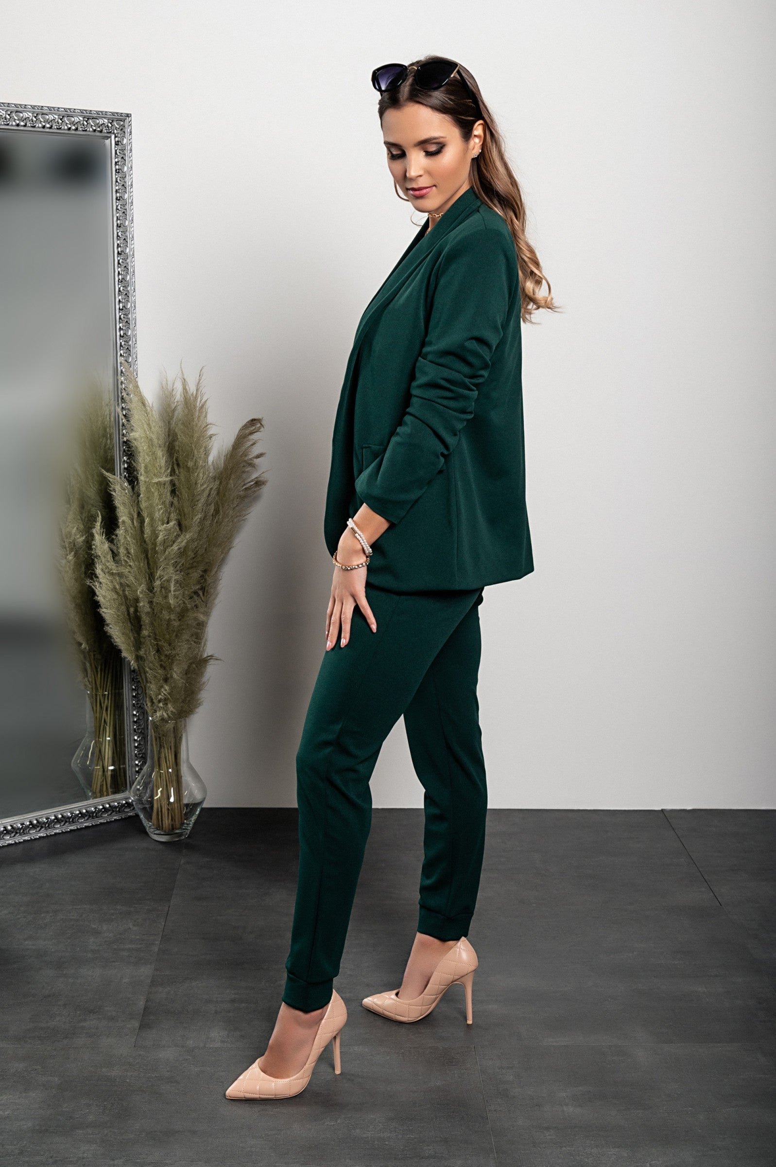 Odkrijte eleganten enobarvni hlačni kostim Estrena v čudoviti zeleni barvi, ki je idealen za vse priložnosti. Ta kostim je izdelan iz mehkega in kompaktnega blaga visoke kakovosti, kar zagotavlja popolno udobje pri nošenju. Ne glede na to, ali ga nosite na poslovnem sestanku ali na večernem izhodu, boste vedno videti elegantno in samozavestno.