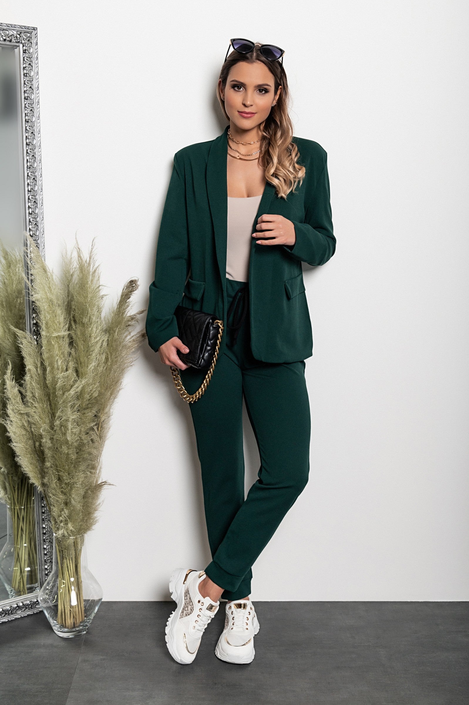 Ne odlašajte in si privoščite eleganten enobarvni hlačni kostim Estrena v zeleni barvi. Ta kostim je prava izbira za vse, ki cenijo kakovost, udobje in stil. Dodajte ga v svojo garderobo in uživajte v njegovih prednostih na vsakem koraku!