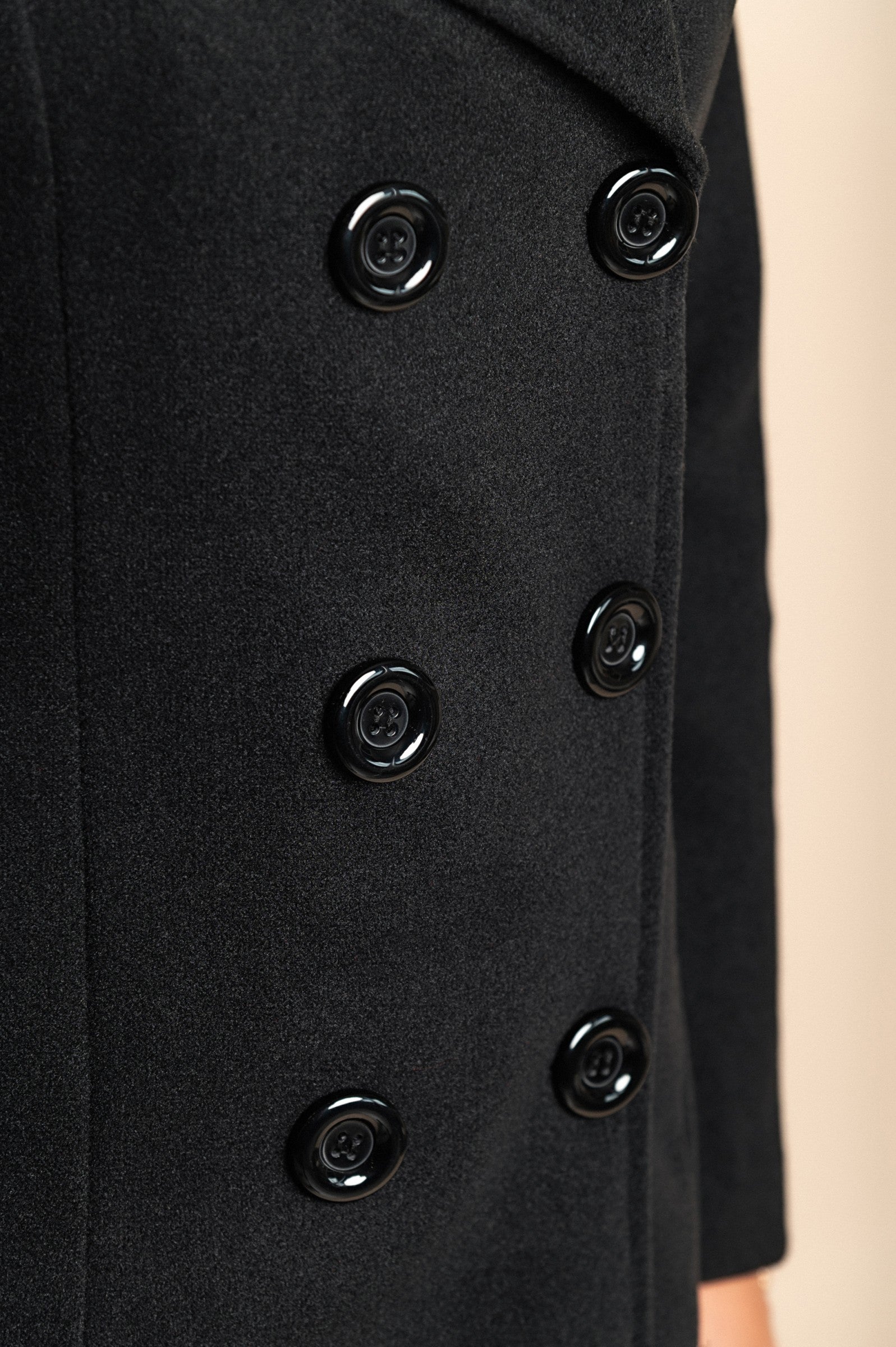 Odkrijte naš eleganten črn plašč z gumbi, ki je popolna izbira za vsako priložnost. Ta čudovit plašč je izdelan iz mehkega in udobnega blaga visoke kakovosti, kar zagotavlja popolno udobje pri nošenju. Ne glede na to, ali ga nosite na poslovnem srečanju ali na večernem izhodu, bo ta plašč zagotovo pritegnil pozornost.