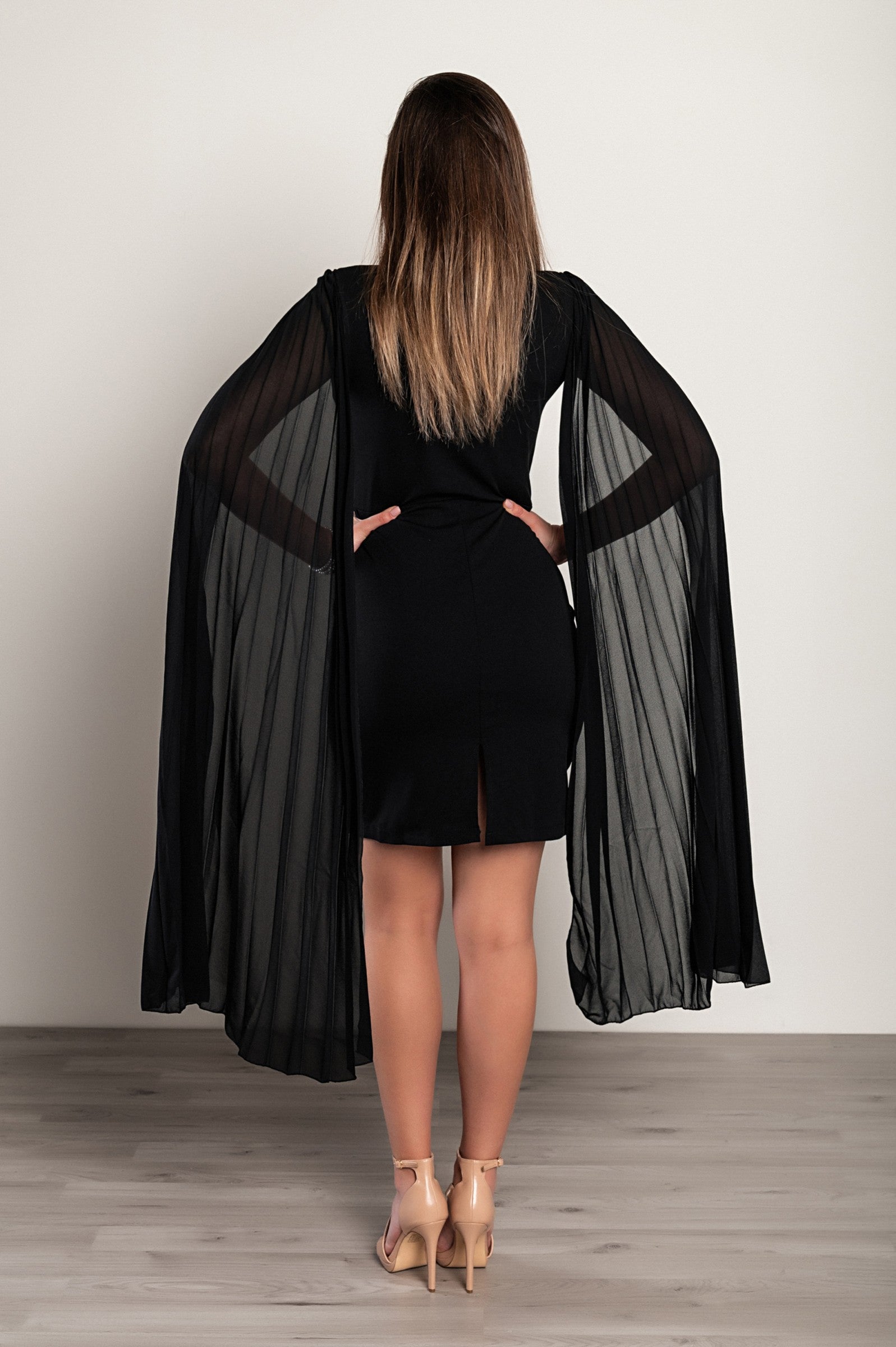 Elegantna mini obleka oprijetega kroja s plisiranimi rokavi, globokim 'V' izrezom, izdelana v Italiji.