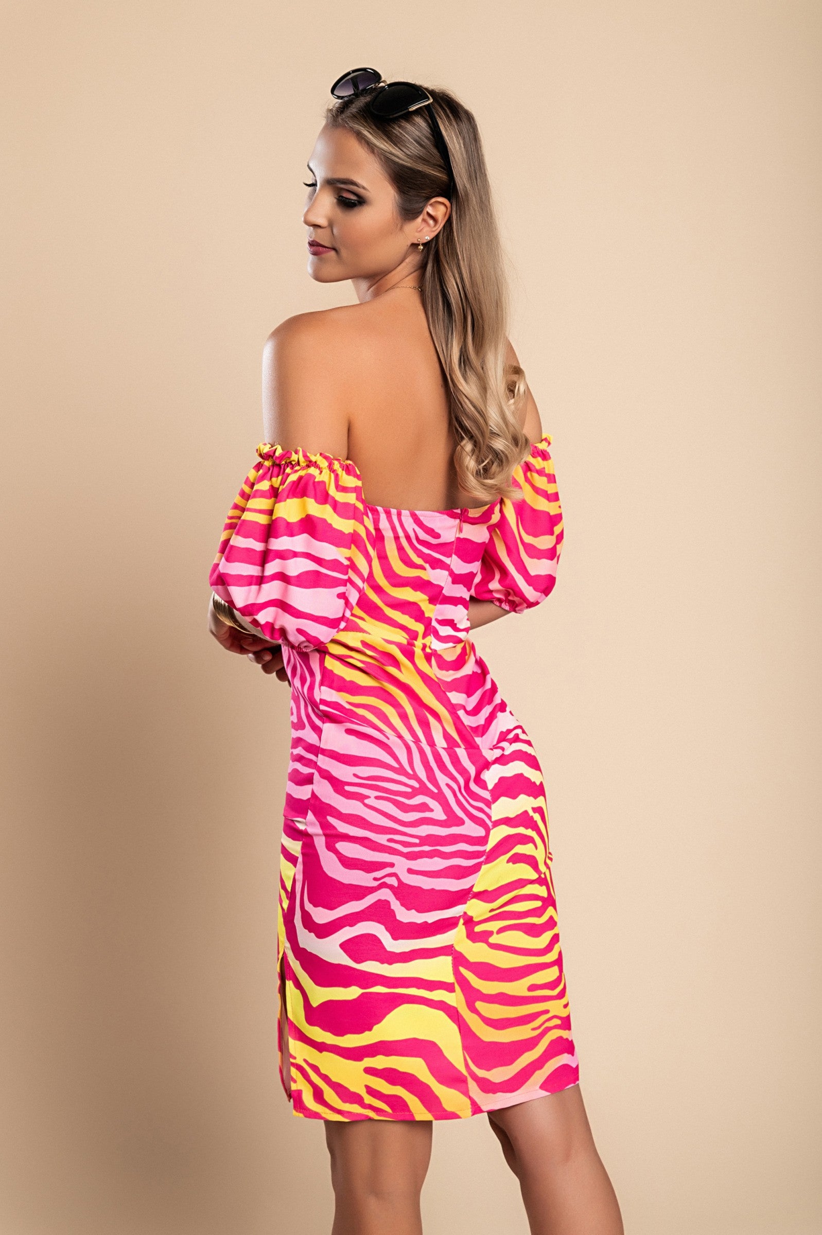 Mini obleka s potiskom se ponaša s srčastim vratnim izrezom, ki doda pridih ženstvenosti in elegance. Kratki rokavi z volančki so še en detajl, ki obleko naredi posebno in privlačno. Oprijet model lepo poudari postavo in doda samozavest vsaki nosilki.