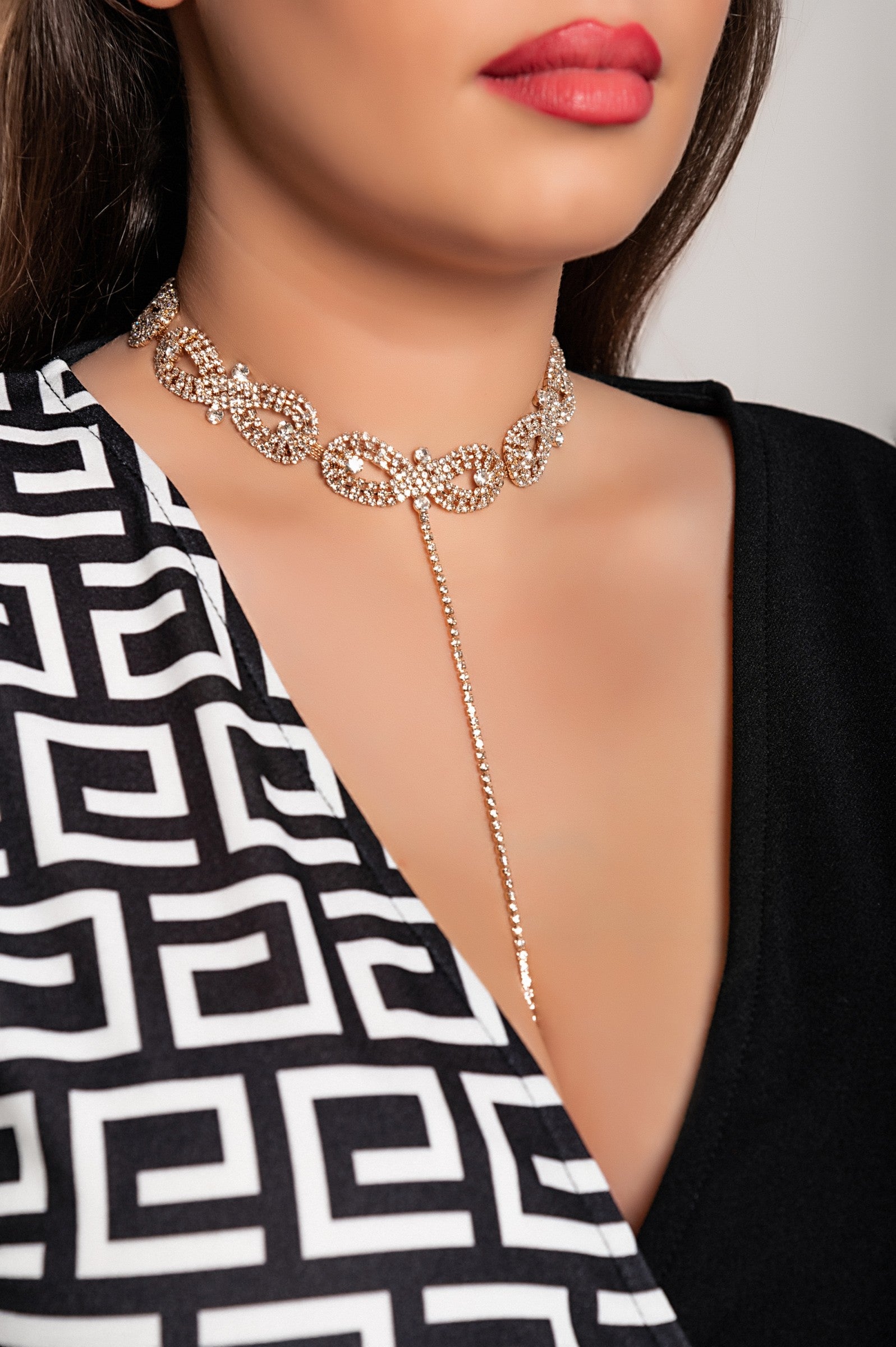 Odkrijte našo elegantno verižico z detajlom umetnih kamenčkov, ki bo zagotovo dodala piko na i vsaki vaši modni kombinaciji. Ta čudovita verižica je zasnovana tako, da pritegne pozornost in doda pridih elegance vsakemu videzu. Njena dolga in tanka verižica na sprednji strani omogoča, da se lepo prilega vratu in se odlično kombinira z različnimi oblačili.