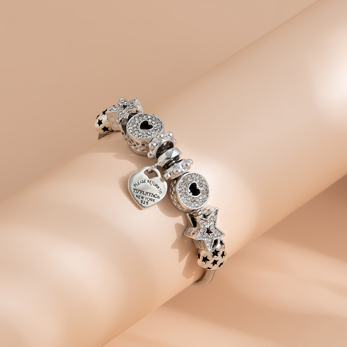 Odkrijte čudovito elegantno zapestnico z obeski v srebrni barvi, ki bo zagotovo popestrila vsako vašo modno kombinacijo. Ta zapestnica je zasnovana tako, da doda pridih elegance in stila, ne glede na priložnost. Njena edinstvena zasnova z okrasnimi obeski in kamenčki pritegne pozornost in doda osebno noto vašemu videzu.