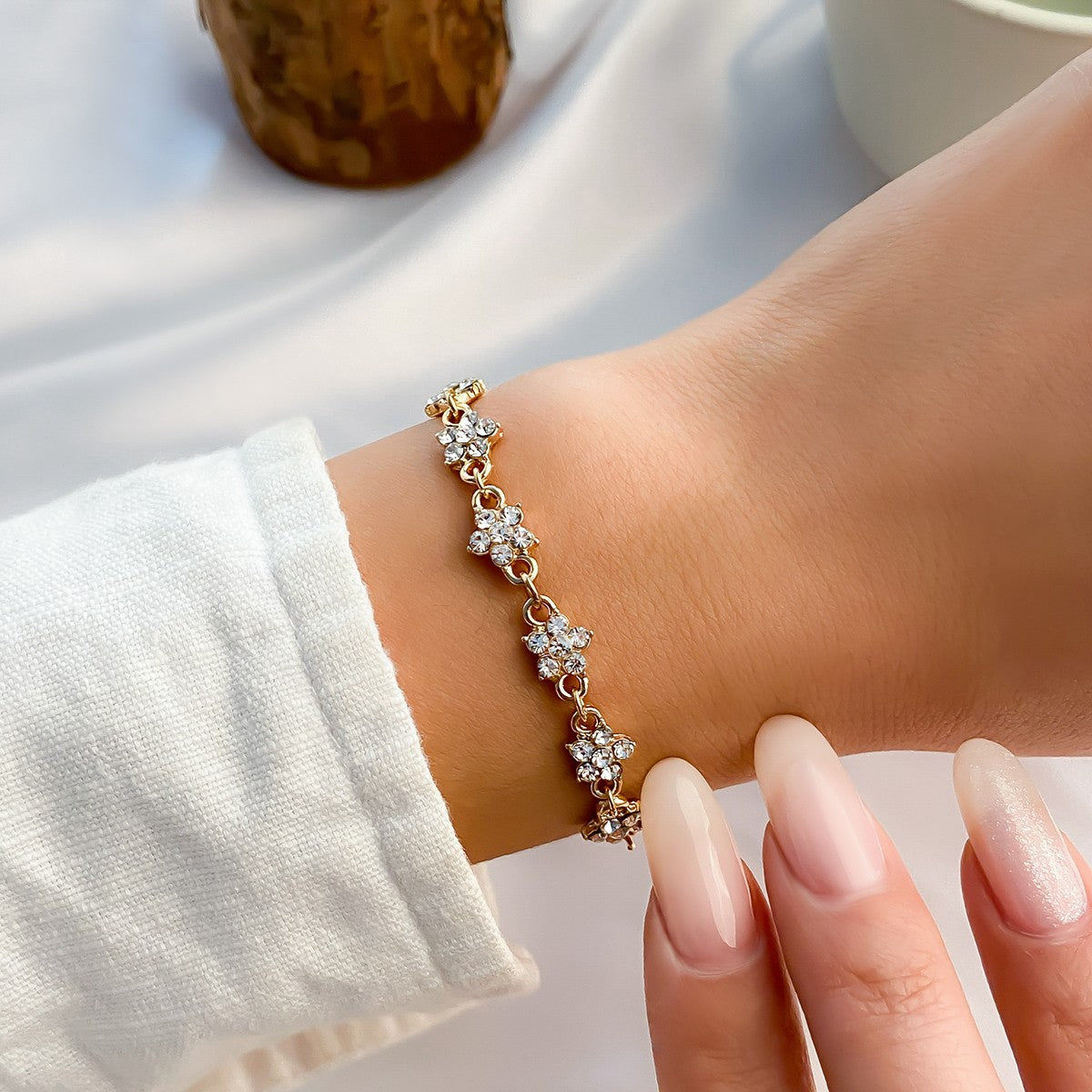Zapestnica je izdelana iz umetnih kamenčkov, ki so skrbno izbrani, da zagotavljajo dolgotrajno lepoto in sijaj. Umetni kamenčki so znani po svoji sposobnosti, da posnemajo naravne kamne, kar pomeni, da lahko uživate v videzu draguljev, ne da bi pri tem obremenili svoj proračun. Sestava materiala je 100% kovinska zlitina, kar zagotavlja trdnost in vzdržljivost zapestnice.