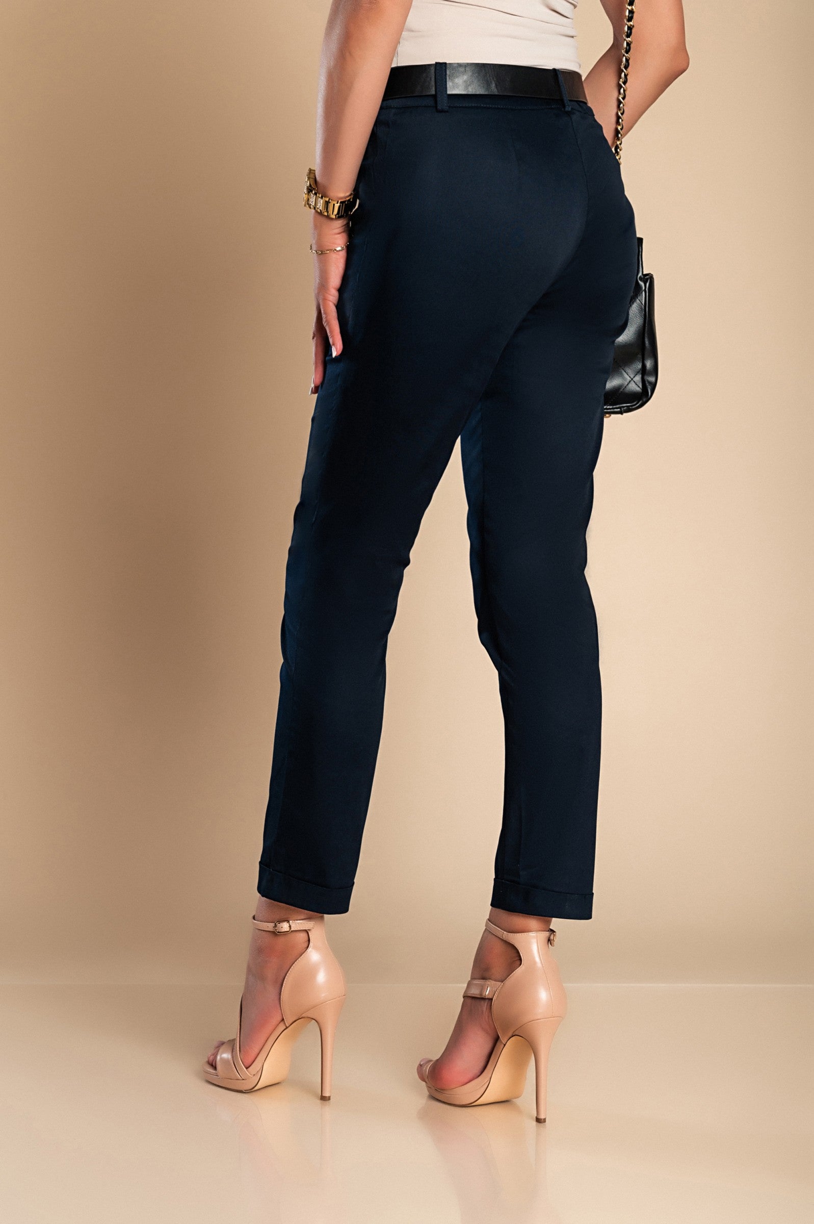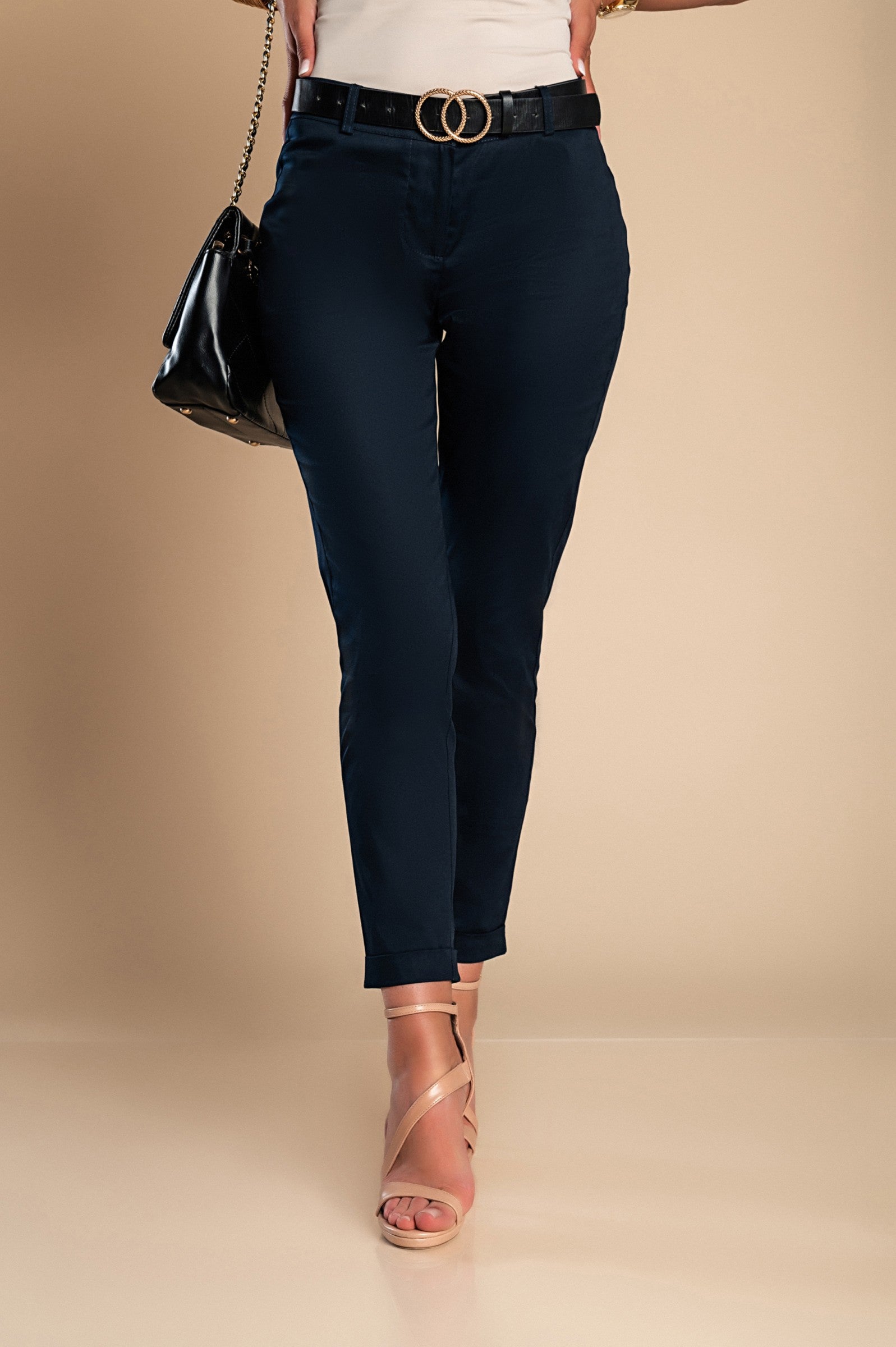 Odkrijte naše elegantne bombažne hlače v temno modri barvi, ki so zasnovane za udobje in stil. Te dolge hlače so izdelane iz visoko kakovostnega bombaža, kar zagotavlja prijetno nošenje skozi ves dan. S svojo 7/8 dolžino in zavihanimi robovi, te hlače ponujajo moderen videz, ki je primeren za različne priložnosti.