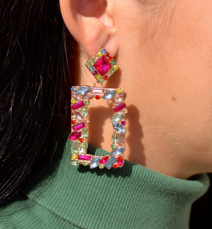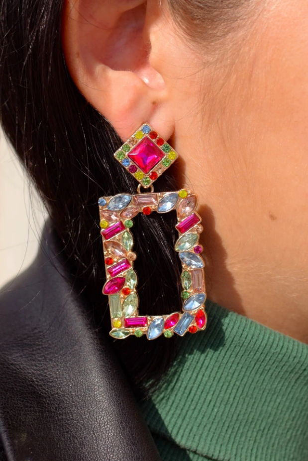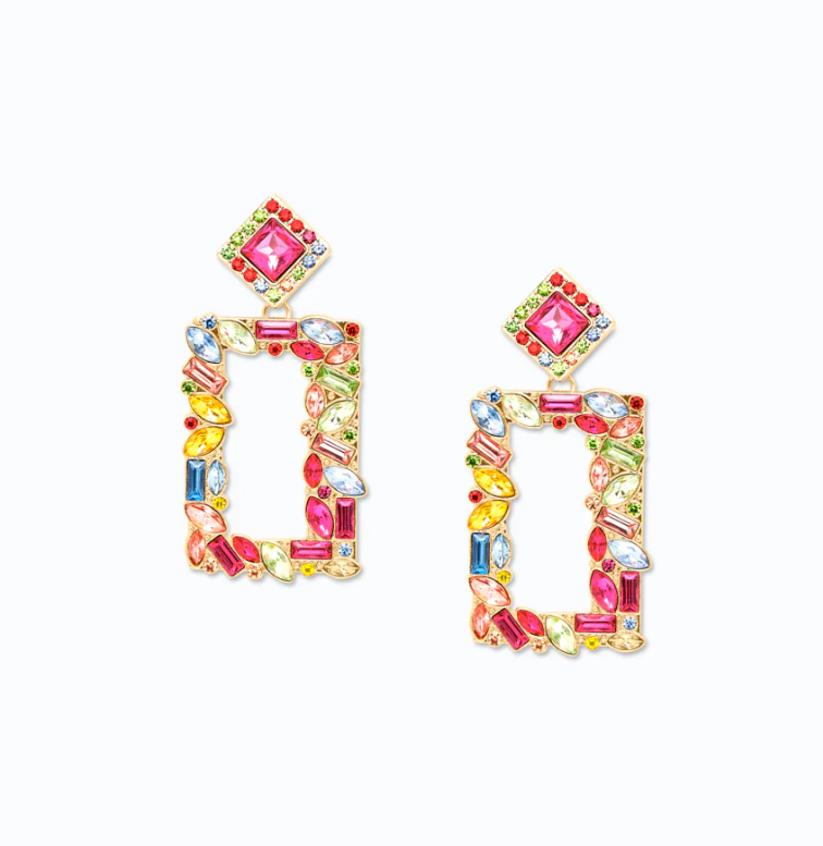 Elegantni viseči uhani pravokotne oblike z okrasnimi diamanti v večbarvni zasnovi, idealni za modno kombinacijo.