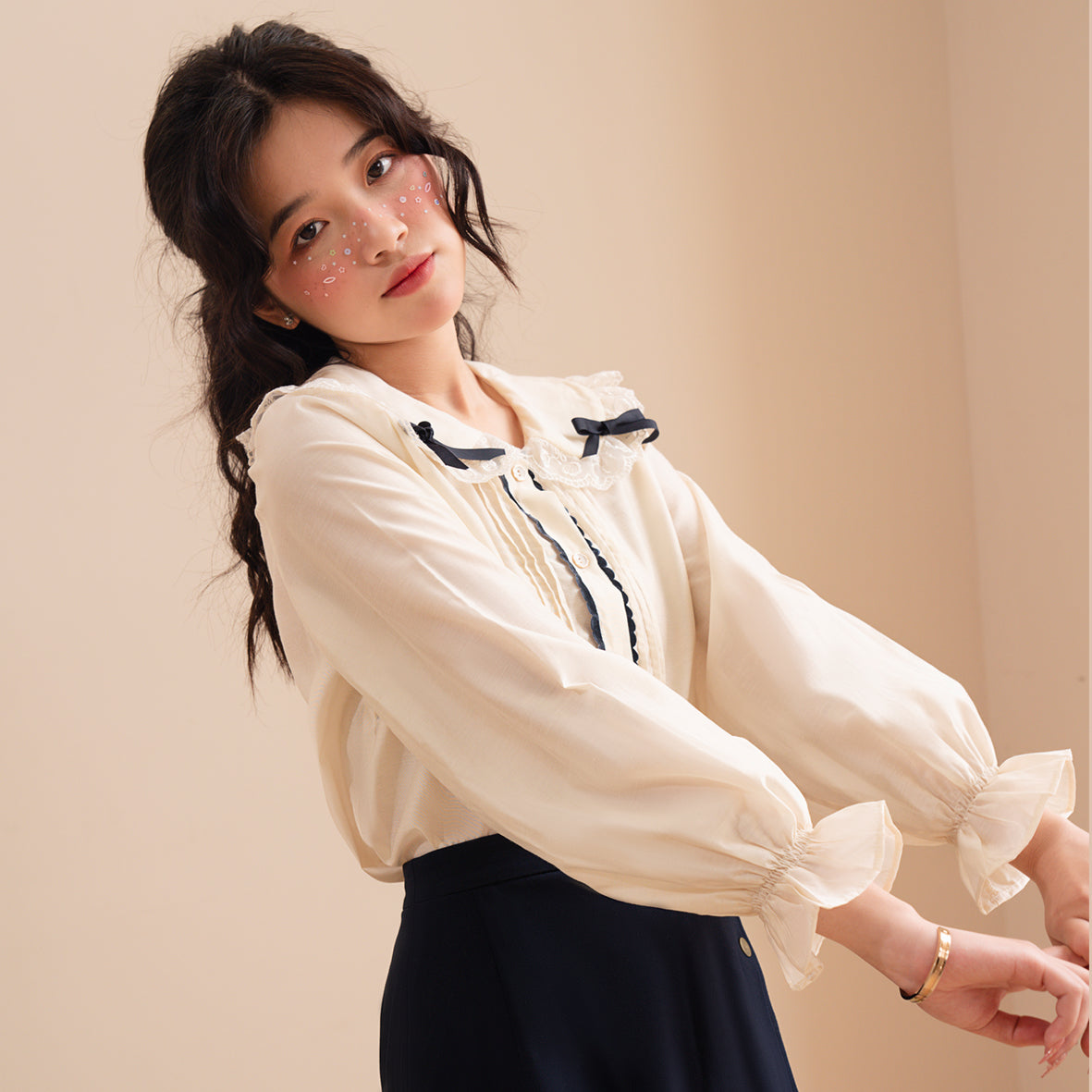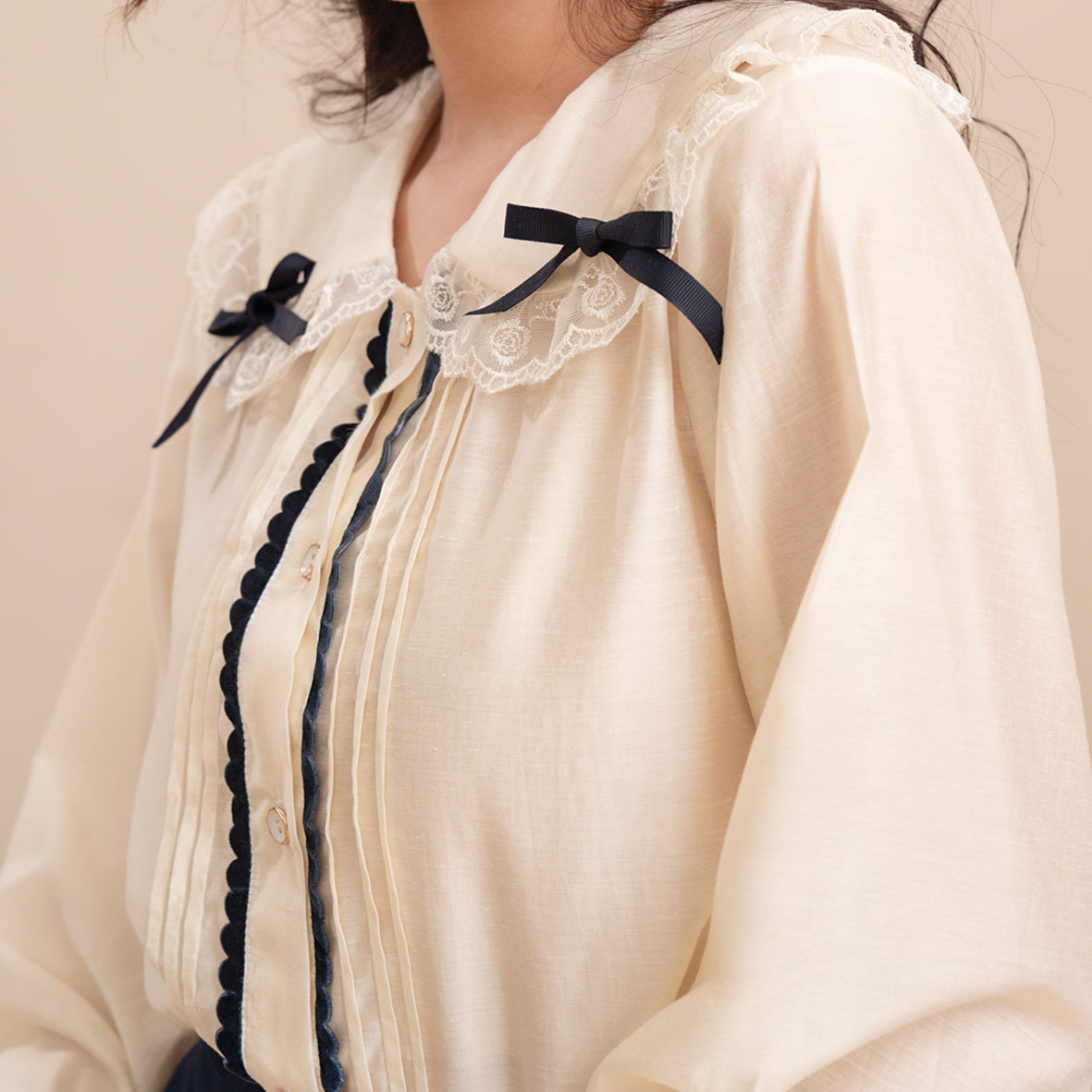 This shirt features a lovely round collar that adds a touch of sophistication to your look. The delicate lace and bow accents elevate the overall design, making it perfect for special events or a chic day out. The pleated bodice, complemented by a rounded velvet cord, adds texture and visual interest, ensuring you stand out in any setting.
