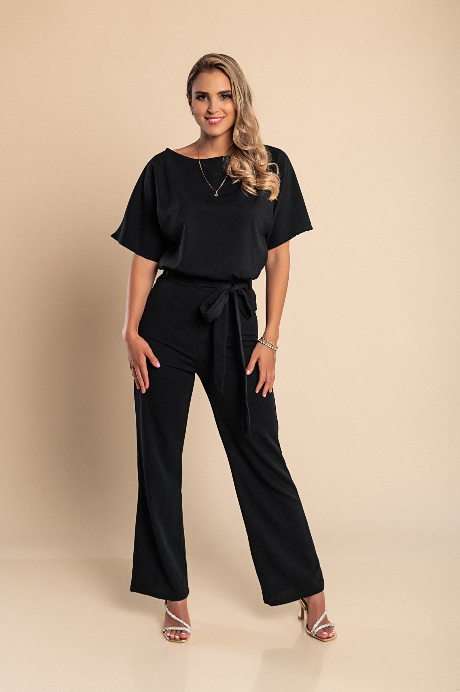 This jumpsuit features a sophisticated design with short sleeves and a loose-fitting shirt that flatters various body types. The wider upper part provides a relaxed silhouette, making it an ideal choice for those who prefer a more comfortable fit. The long, wide trousers add an elegant touch, making this jumpsuit suitable for both formal and informal events.
