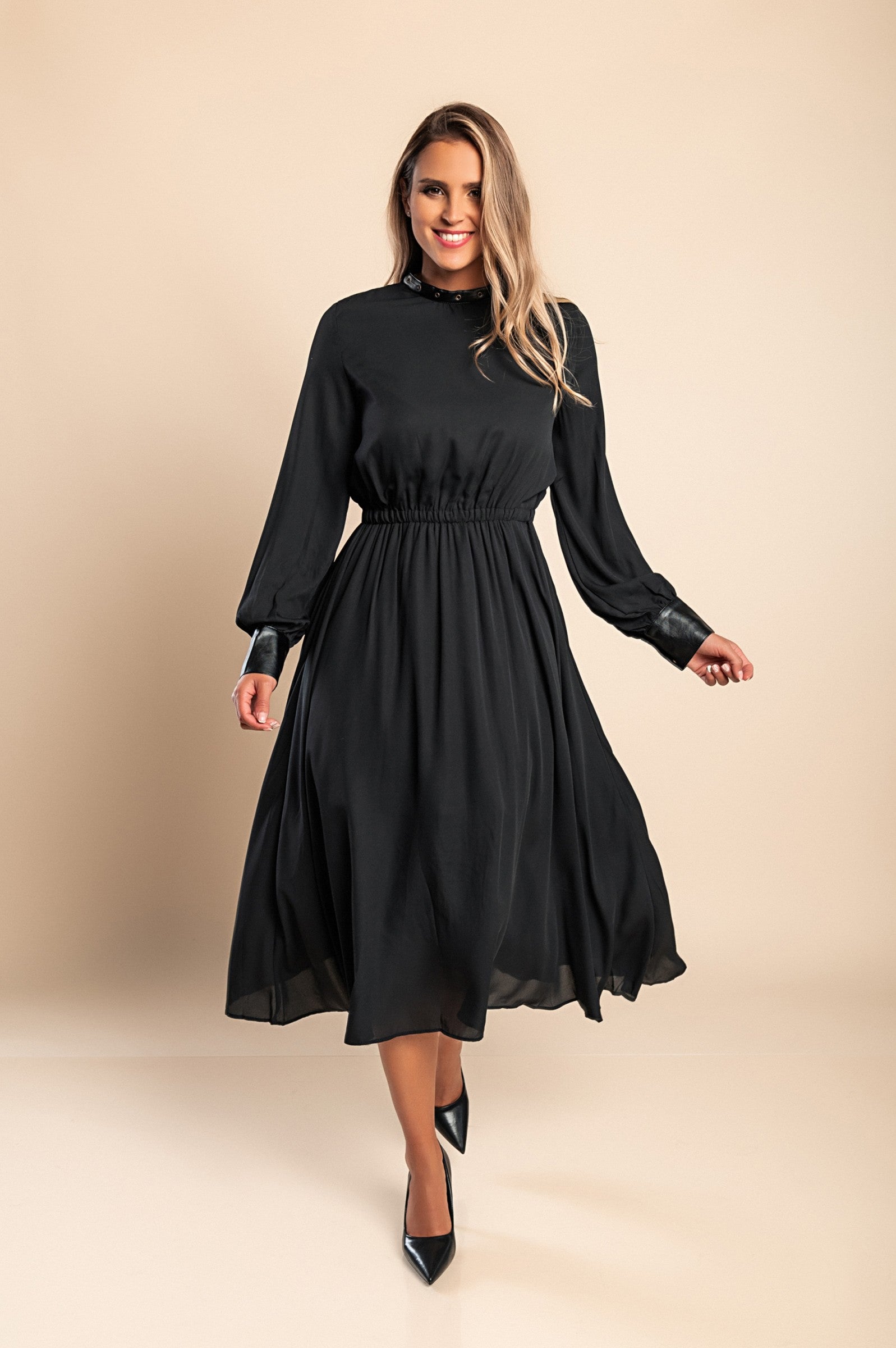 Invest in the Faux Leather Detail Elegant Midi Dress Plana in Black today and elevate your fashion game. With its stylish design, comfortable fit, and versatile nature, this dress is sure to become a staple in your wardrobe.