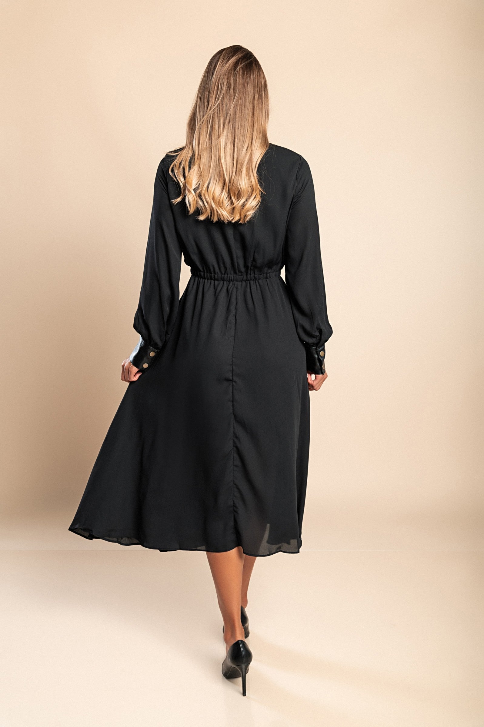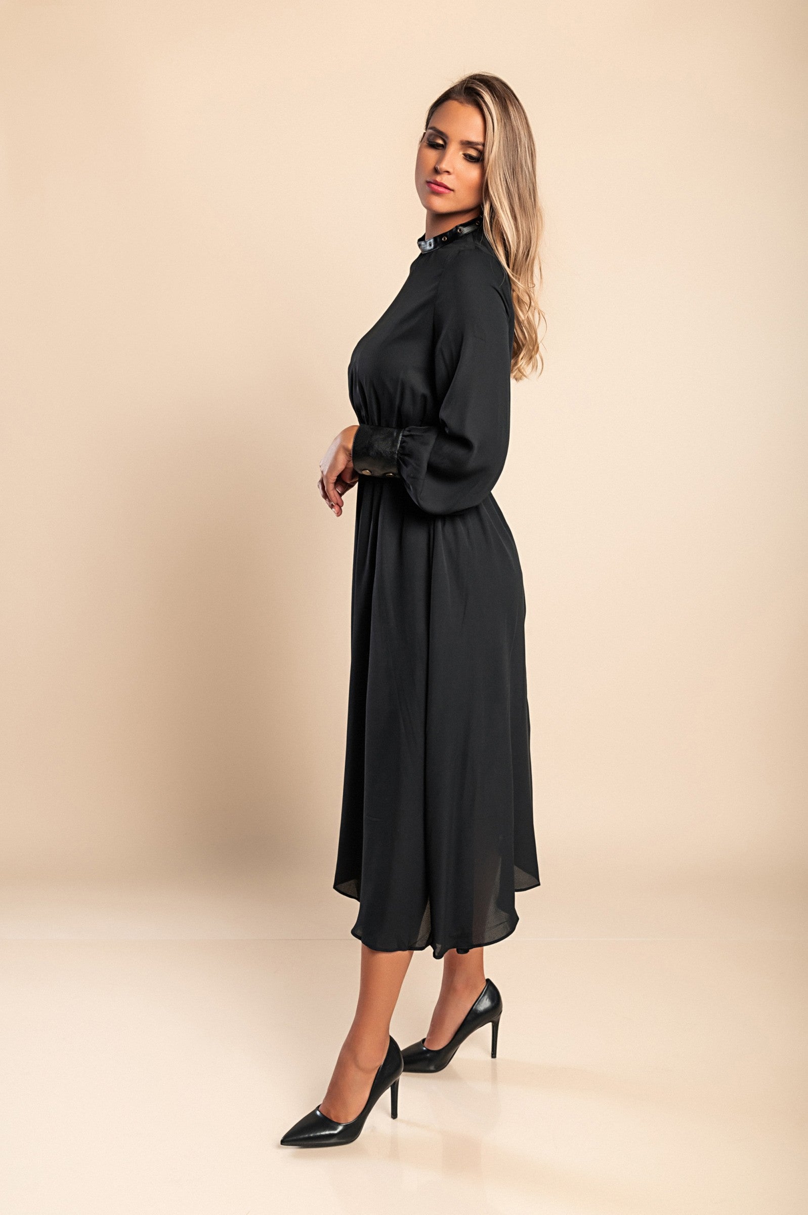 This midi dress is suitable for various fashion combinations, allowing you to express your personal style. Pair it with heels for a sophisticated evening look, or dress it down with ankle boots for a more casual vibe. The black color adds versatility, making it easy to accessorize with different colors and styles.