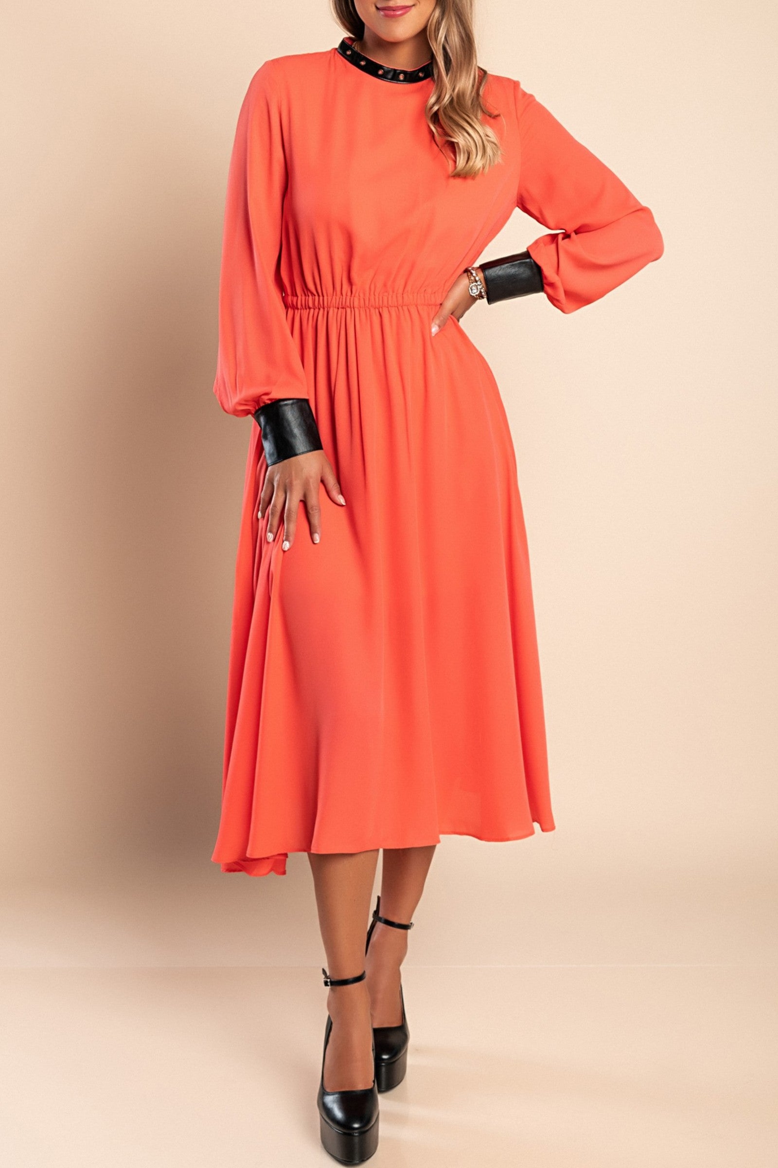 This elegant midi dress features a chic round neckline and long sleeves, making it an ideal choice for transitional seasons. The faux leather details add a touch of sophistication, elevating the overall look of the dress. The combination of the pink fabric and the sleek faux leather accents creates a stunning contrast that is sure to turn heads.