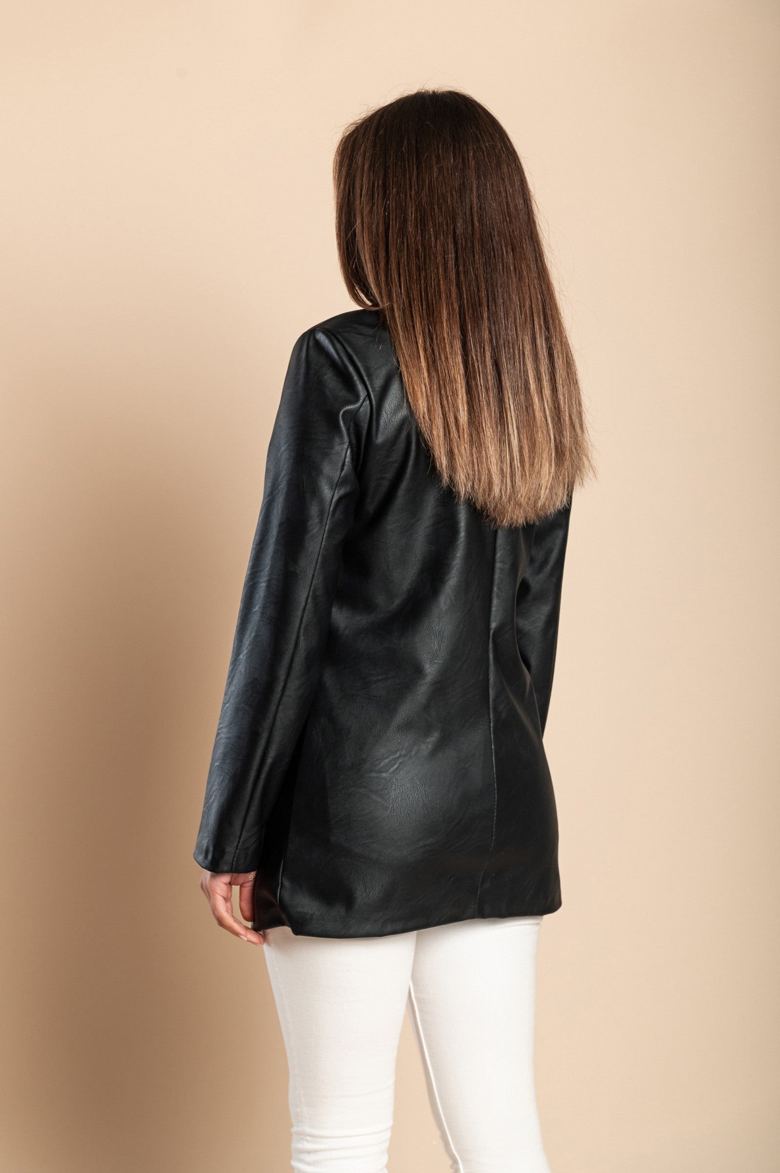 Introducing the stunning faux leather jacket 81095 in black, a perfect blend of style and sophistication. This blazer is crafted from high-quality materials, ensuring durability and a luxurious feel. With its elegant design, this jacket is ideal for both casual outings and formal occasions, making it a versatile addition to your wardrobe.