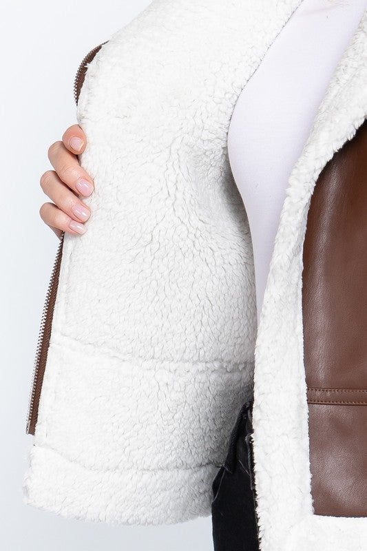 In addition to its stylish appearance, the Faux Leather Shearling Jacket is designed with practicality in mind. It includes zippered pockets on either side, allowing you to securely store your essentials such as your phone, keys, or wallet. This feature ensures that you can keep your belongings safe while on the go, making it an ideal choice for busy lifestyles.