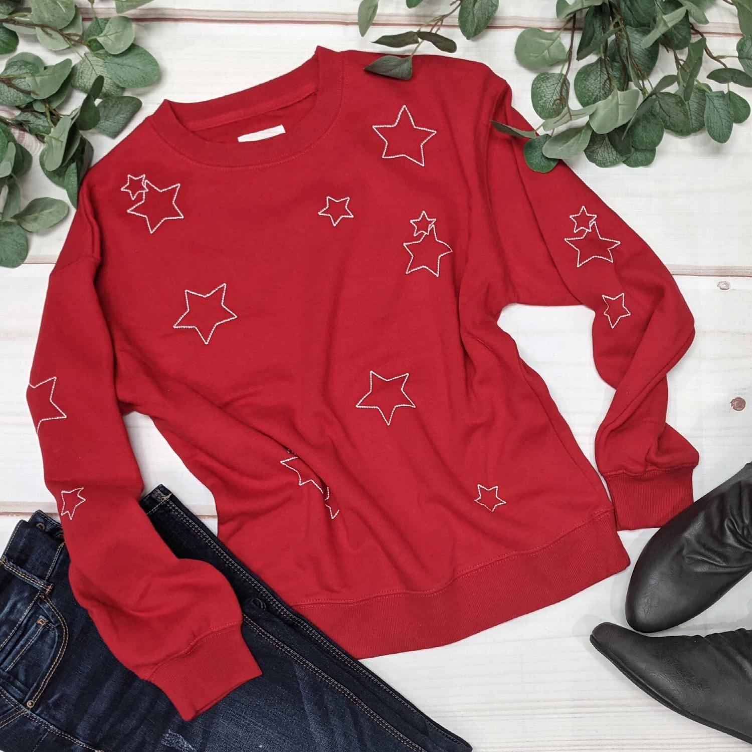 Available in three vibrant colors—red, black, and white—each adorned with grey outlines of stars in various sizes, this sweatshirt is sure to catch the eye. The star print is not only trendy but also versatile, allowing you to mix and match with different bottoms. Pair it with your favorite slim-fit jeans for a laid-back yet stylish look, or opt for comfortable sweats or leggings for a relaxing day indoors.