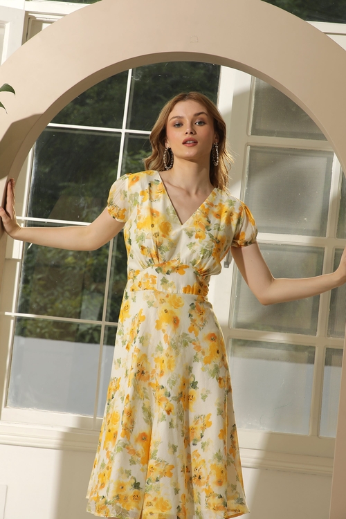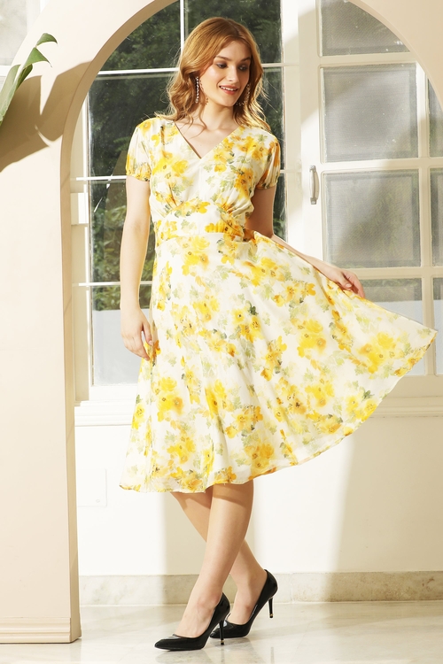 Floral Dress with Cut body Fit from the Waist. Casual wear which can be paired with a stole and sneakers.