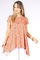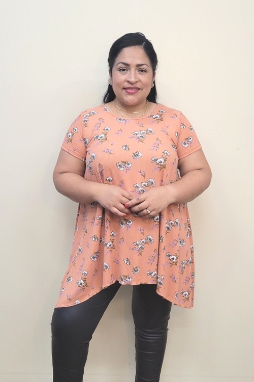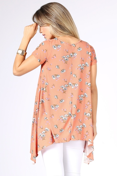 Floral print short sleeve top with asymmetrical hem. In light ribbed fabric. 96% Polyester 4% Spandex. Manufactured in U.S.A.