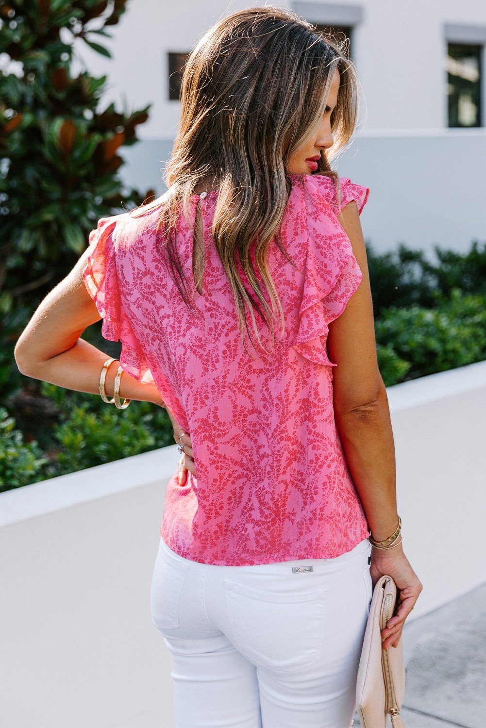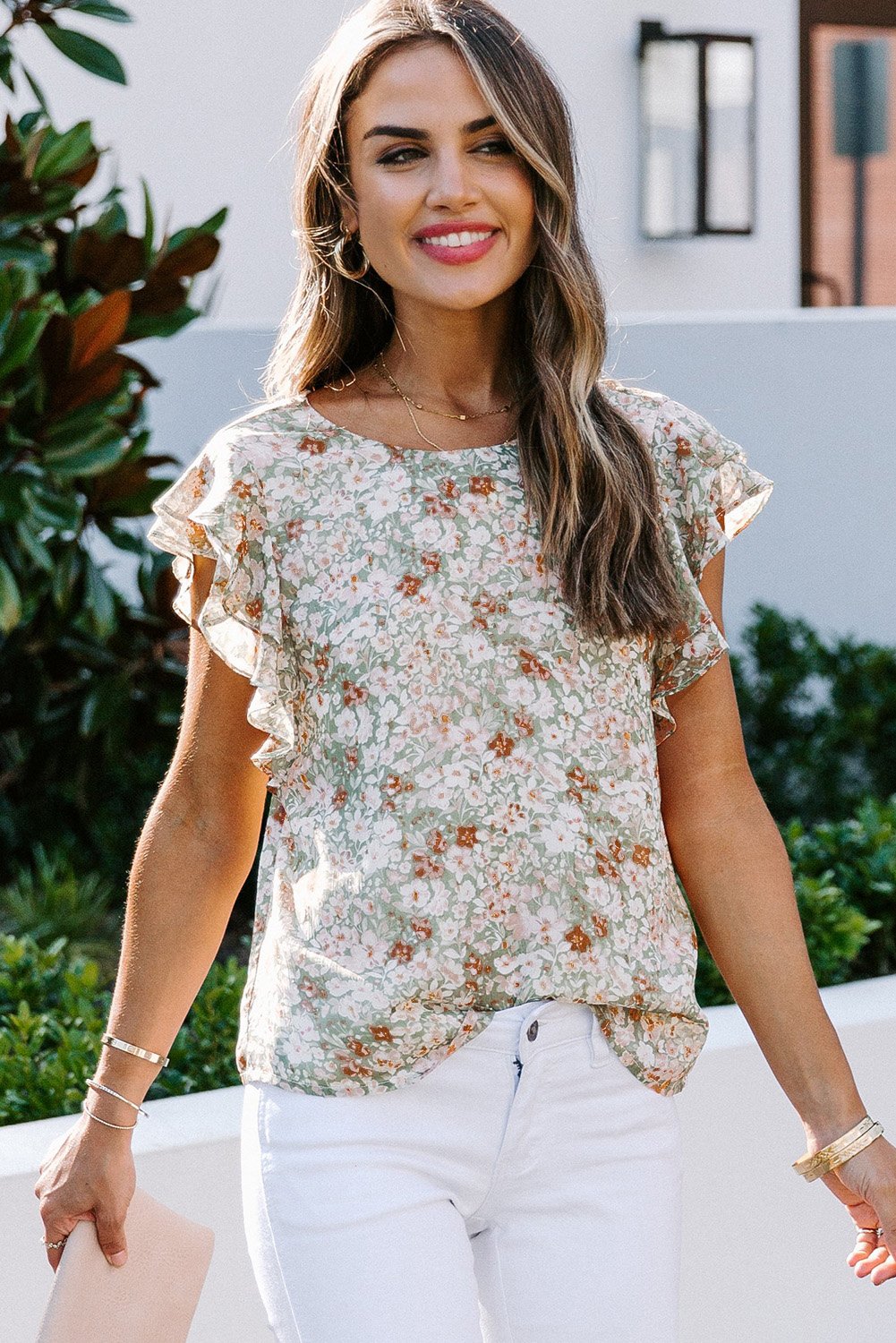 Floral Ruffle Short Sleeve Tee featuring a floral print, flutter cap sleeves, and a back button closure, perfect for casual wear.
