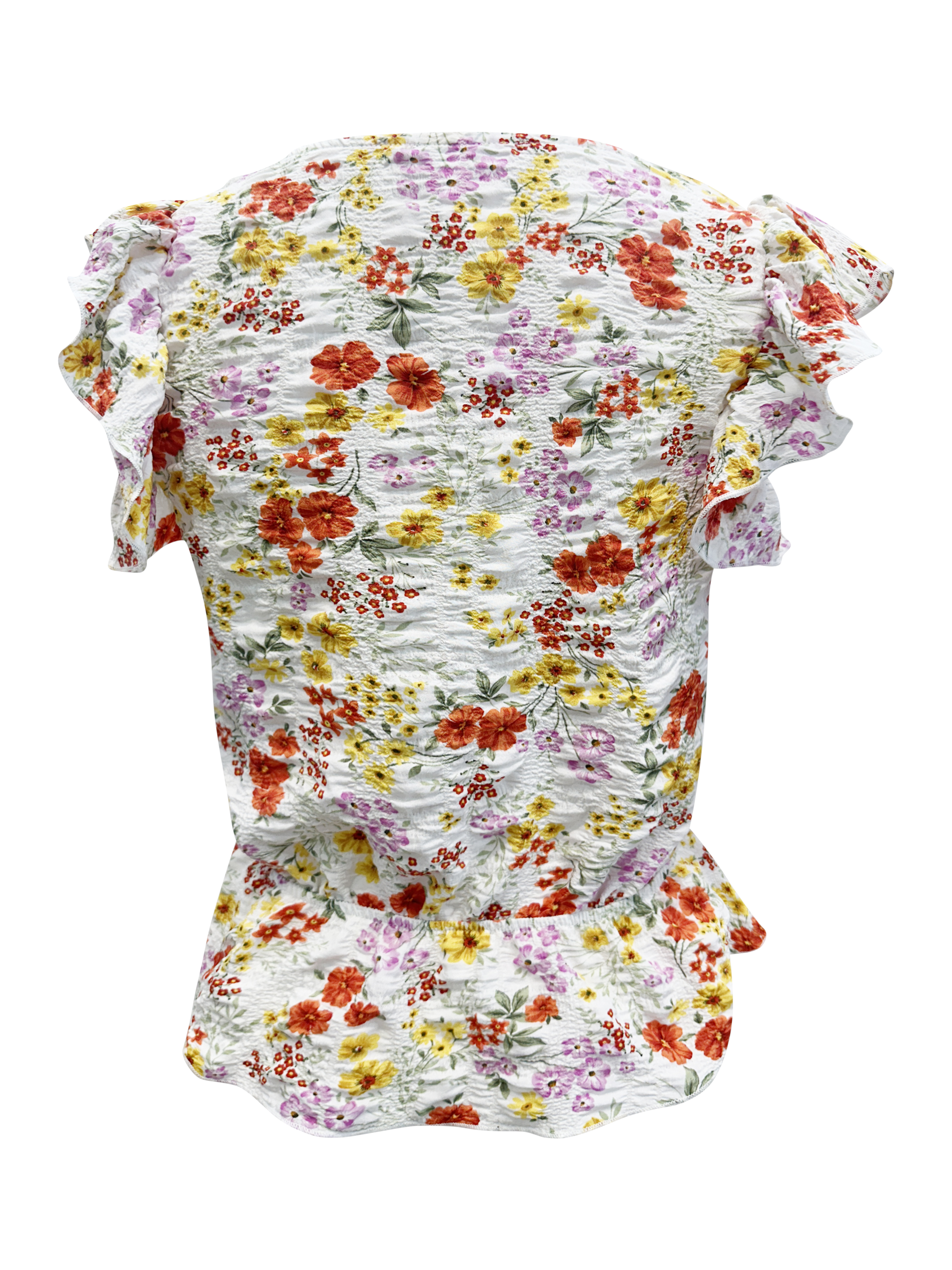 To keep your Floral Ruffle Sleeve Peplum Top looking its best, it is recommended to hand wash in cold water and lay flat to dry. Avoid bleach and iron on low heat if necessary. Following these care instructions will help maintain the vibrant colors and shape of the top.