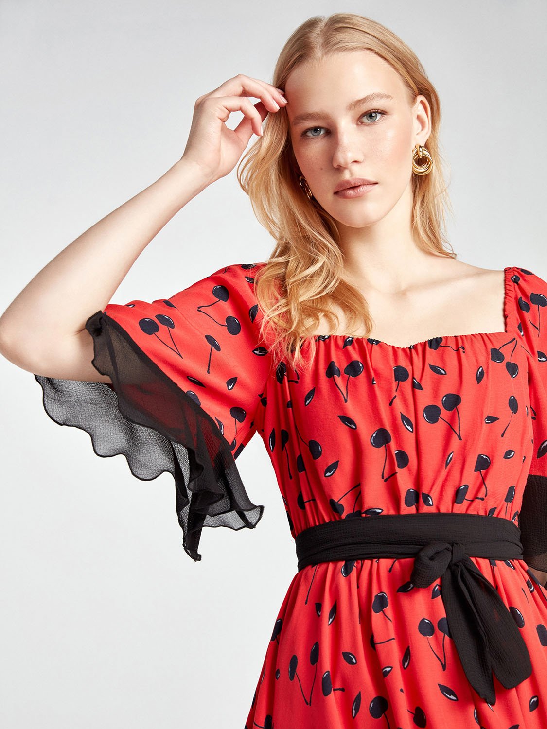 Crafted from a blend of 45% Ecovero and 55% Viscose, this dress not only feels soft against the skin but is also environmentally friendly. Ecovero is a sustainable fabric derived from wood pulp, making it a great choice for eco-conscious consumers. The viscose adds a luxurious touch, ensuring that the dress drapes beautifully on your body.