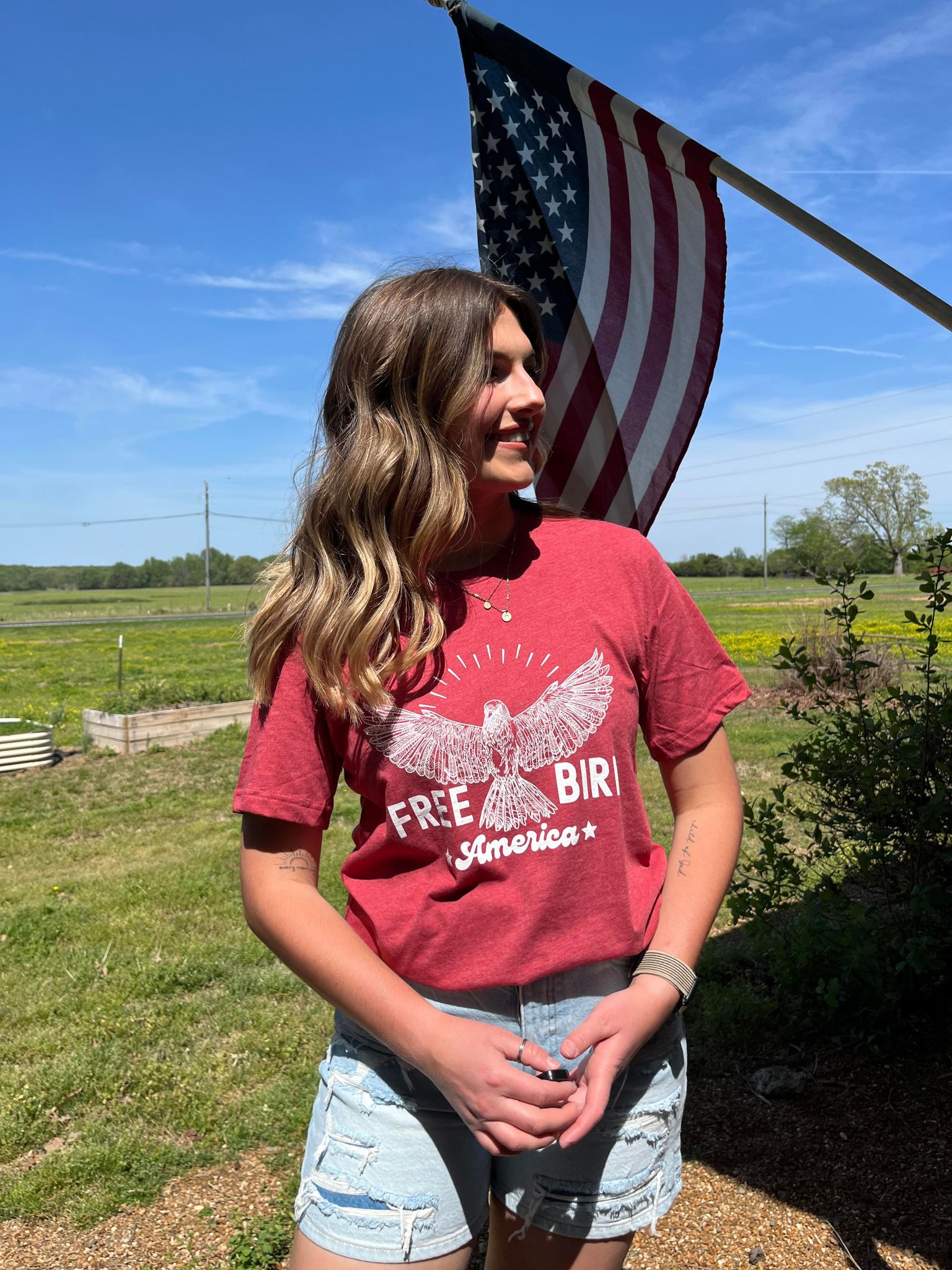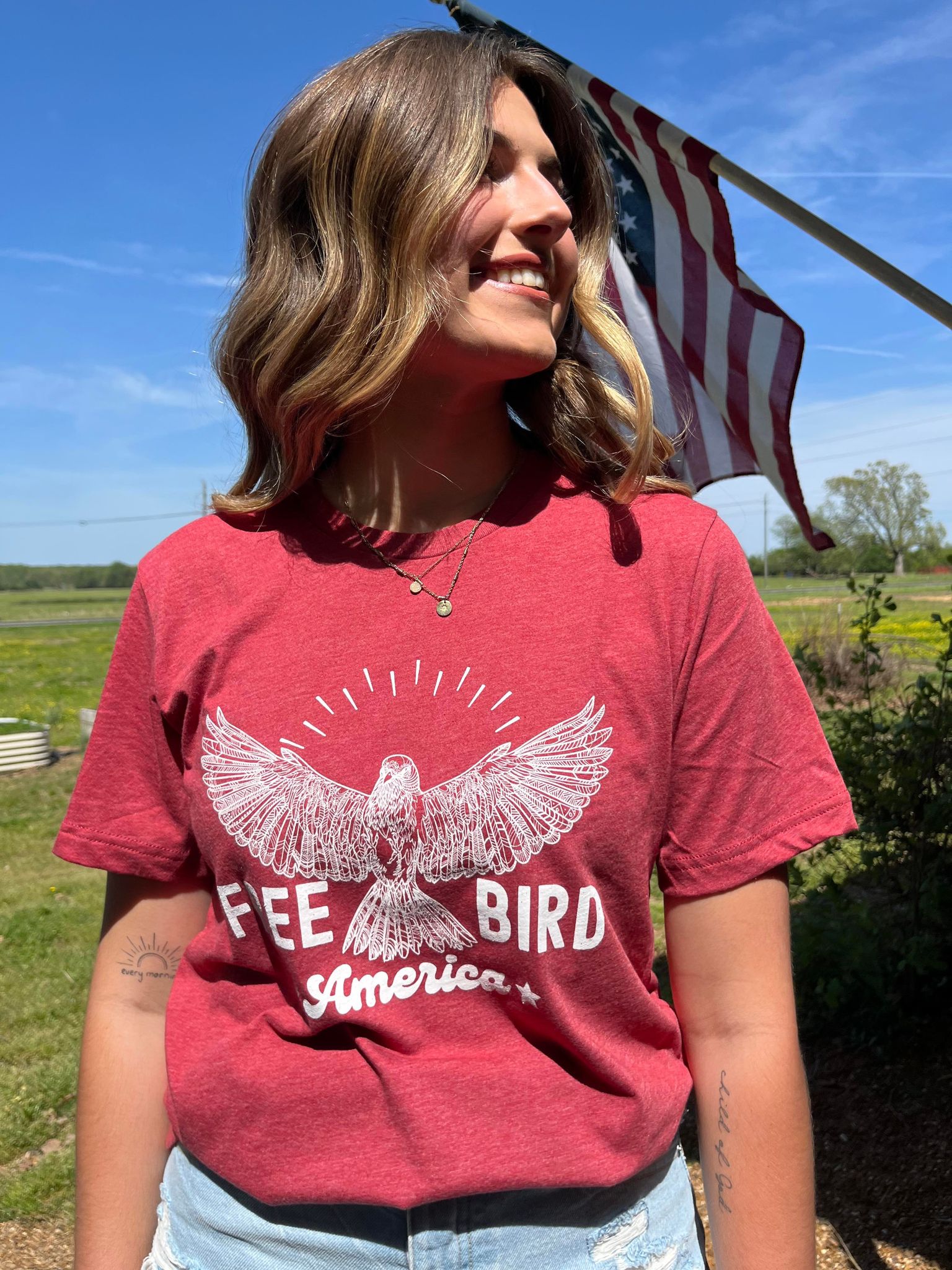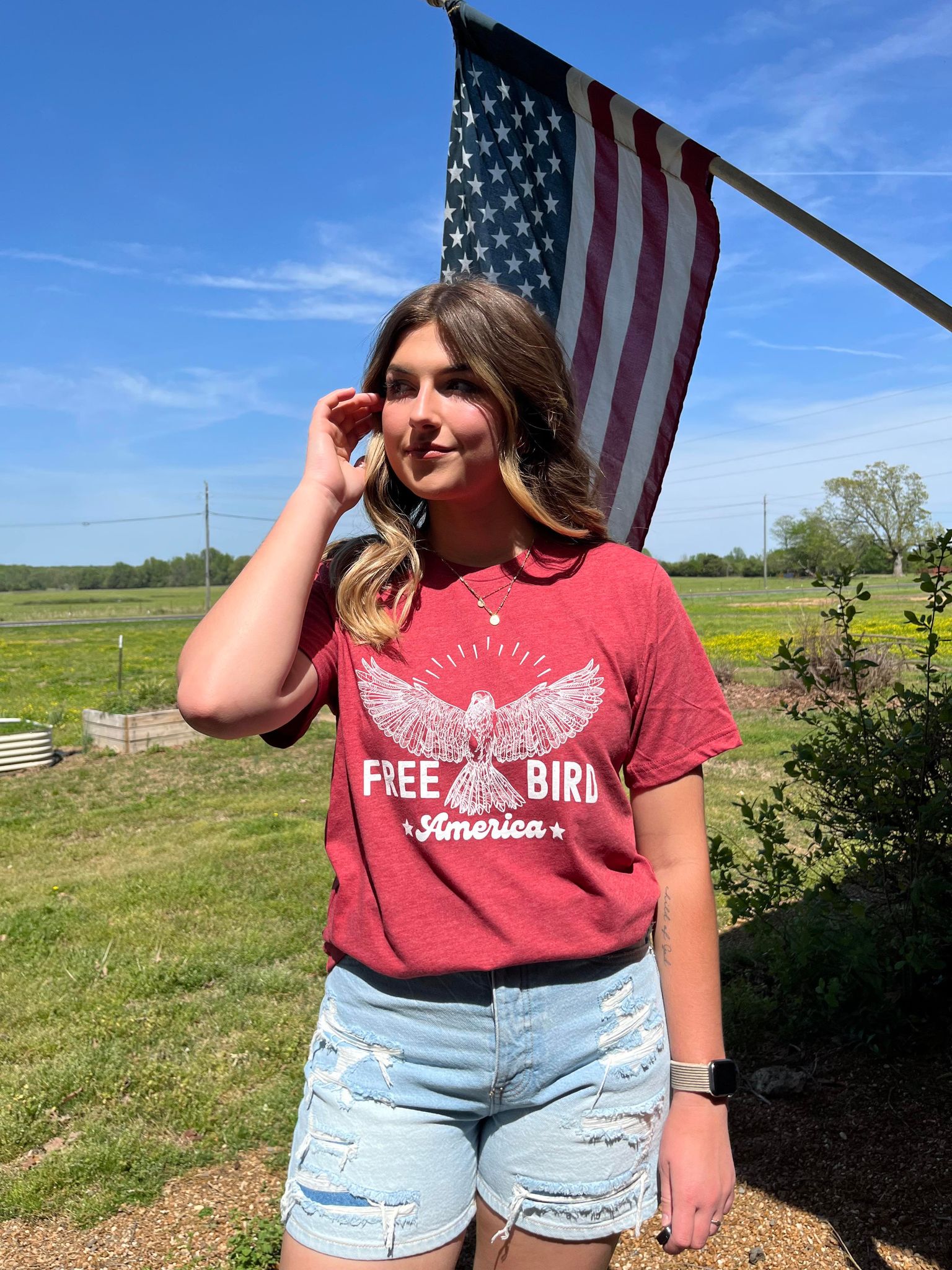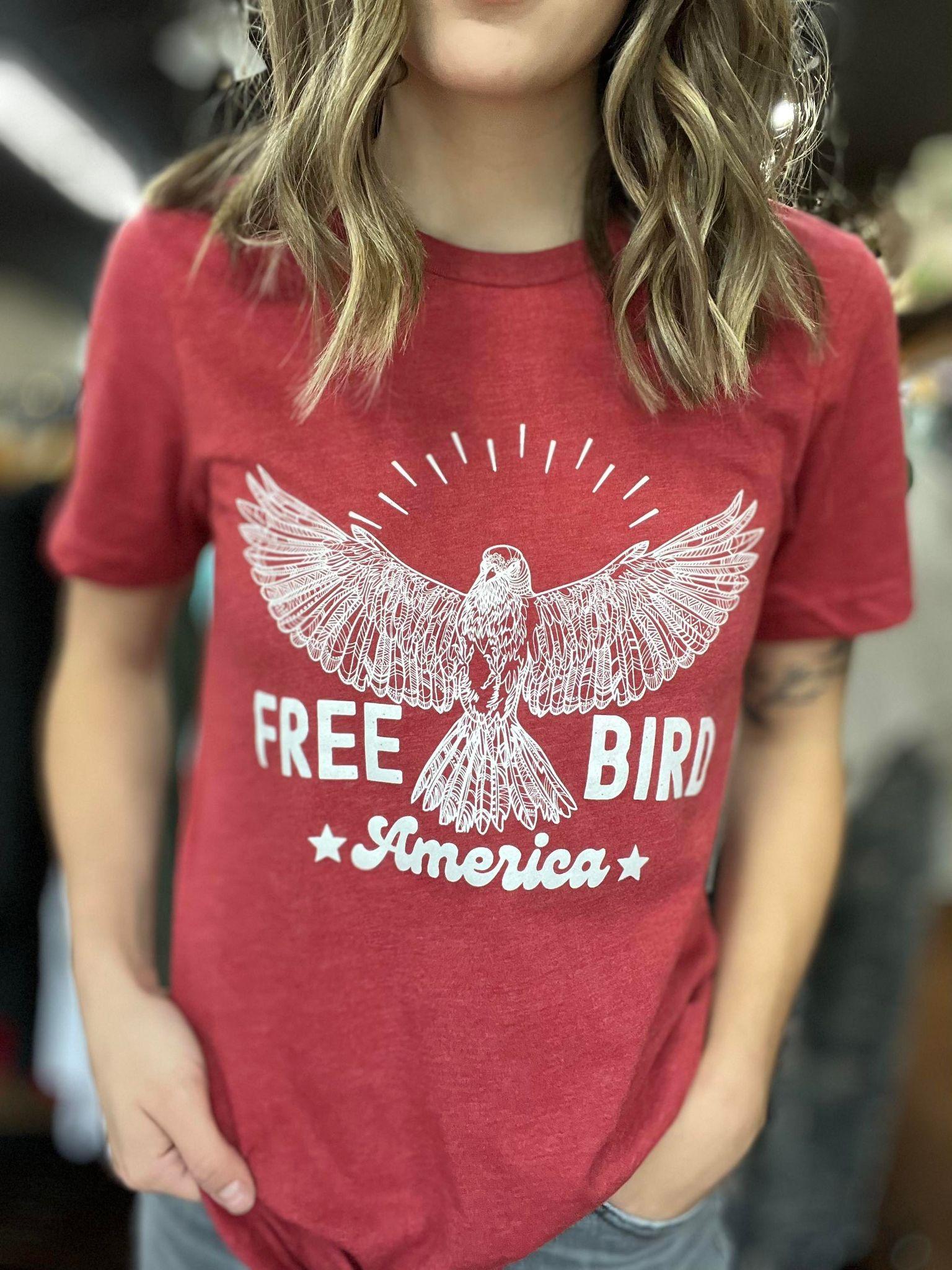 Introducing the Free Bird: America graphic tee, a perfect blend of style and patriotism. Inspired by the iconic lyrics of Lynyrd Skynyrd, this shirt embodies the spirit of freedom and independence. Whether you're celebrating the 4th of July or simply expressing your love for America, this tee is a must-have addition to your wardrobe.