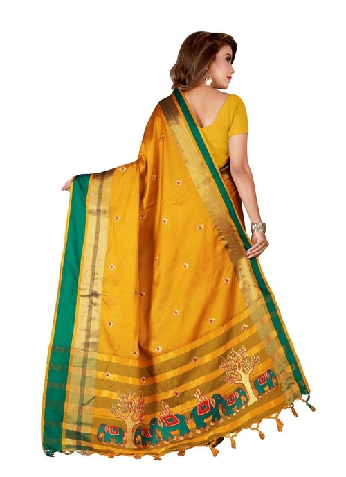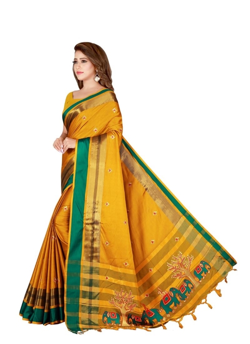 Generic Women's Cotton Blend Saree with Blouse (Yellow, 5-6 Mtrs).