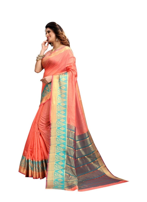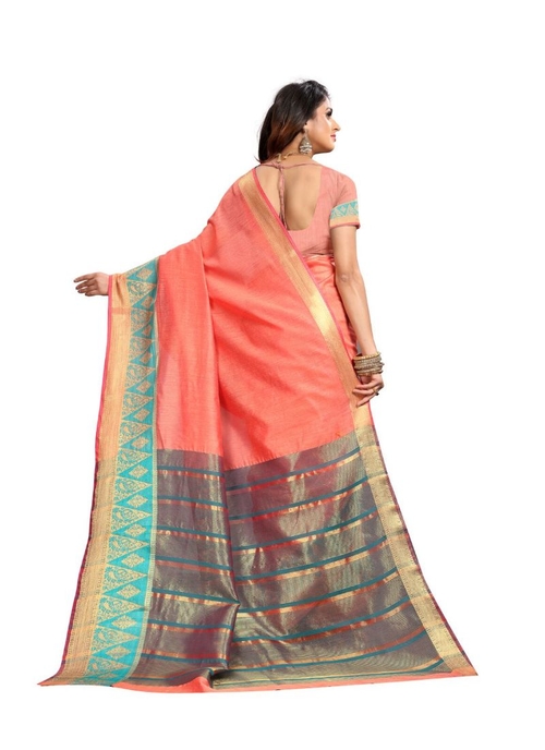 Generic Women's Cotton Silk Saree(Coral, 5.5-6 Mtr) Color : Coral, Material : Cotton Silk, Saree Length : 5.5 Mtr, Blouse Length : 80 Cm, Work Type : Woven and Zari Work, Style : Designer Pallu