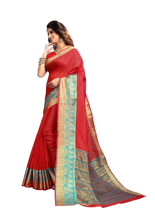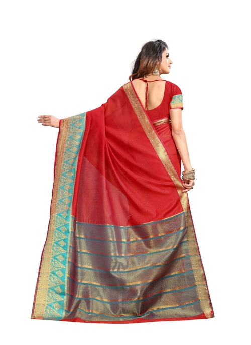 Generic Women's Cotton Silk Saree(Red, 5.5-6 Mtr) Color : Red, Material : Cotton Silk, Saree Length : 5.5 Mtr, Blouse Length : 80 Cm, Work Type : Woven and Zari Work, Style : Designer Pallu