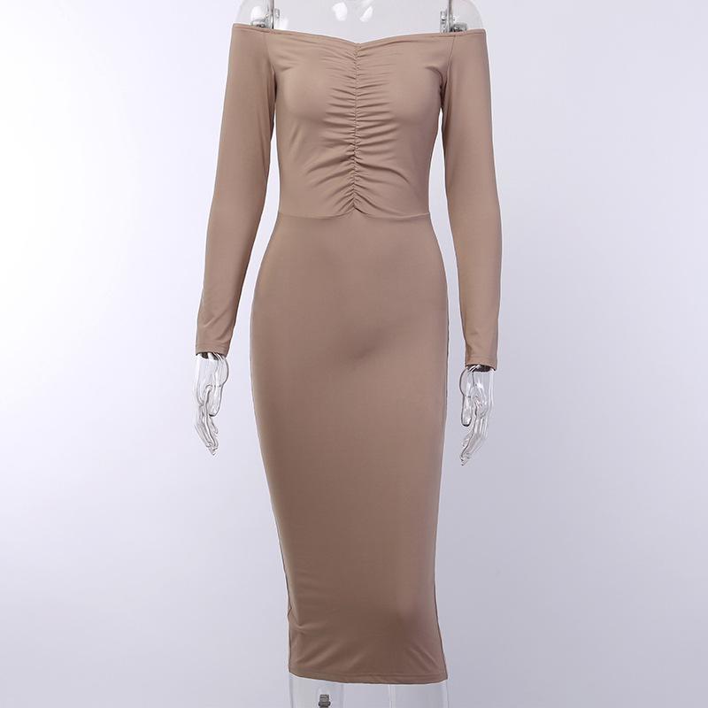 The A-line silhouette of the dress is designed to flatter all body types. It flows gracefully from the waist down, providing a balanced look that is both feminine and chic. The mid-calf length adds a sophisticated touch, making it suitable for various occasions. Additionally, the dress features a slash neck neckline that enhances its sexy appeal, while the full-length sleeves provide coverage without sacrificing style.