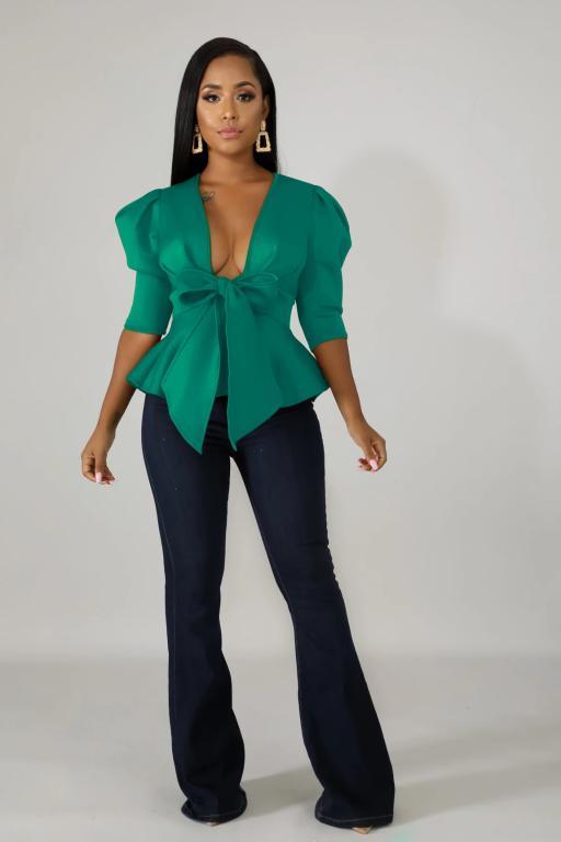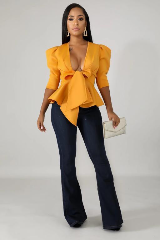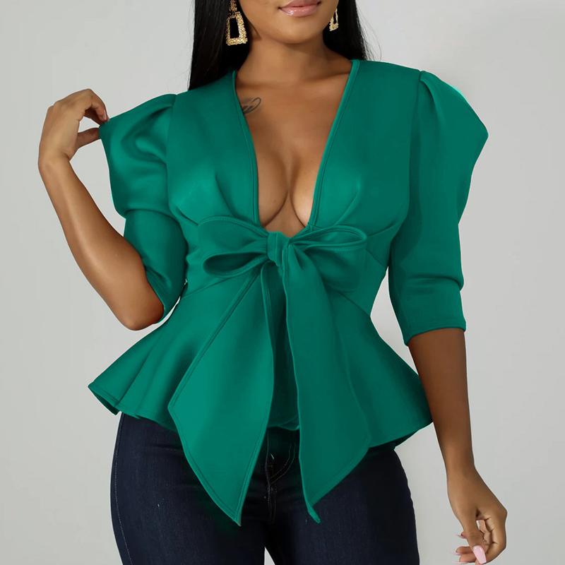 This blouse features a flattering V-neckline that enhances your neckline and adds a touch of sophistication. The puff sleeves provide a trendy and feminine silhouette, making it a perfect choice for those who want to make a statement. The tie bow decoration adds a playful element to the blouse, allowing you to express your personal style effortlessly.