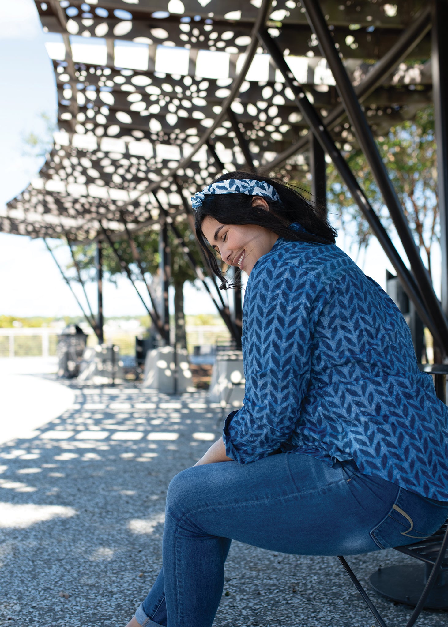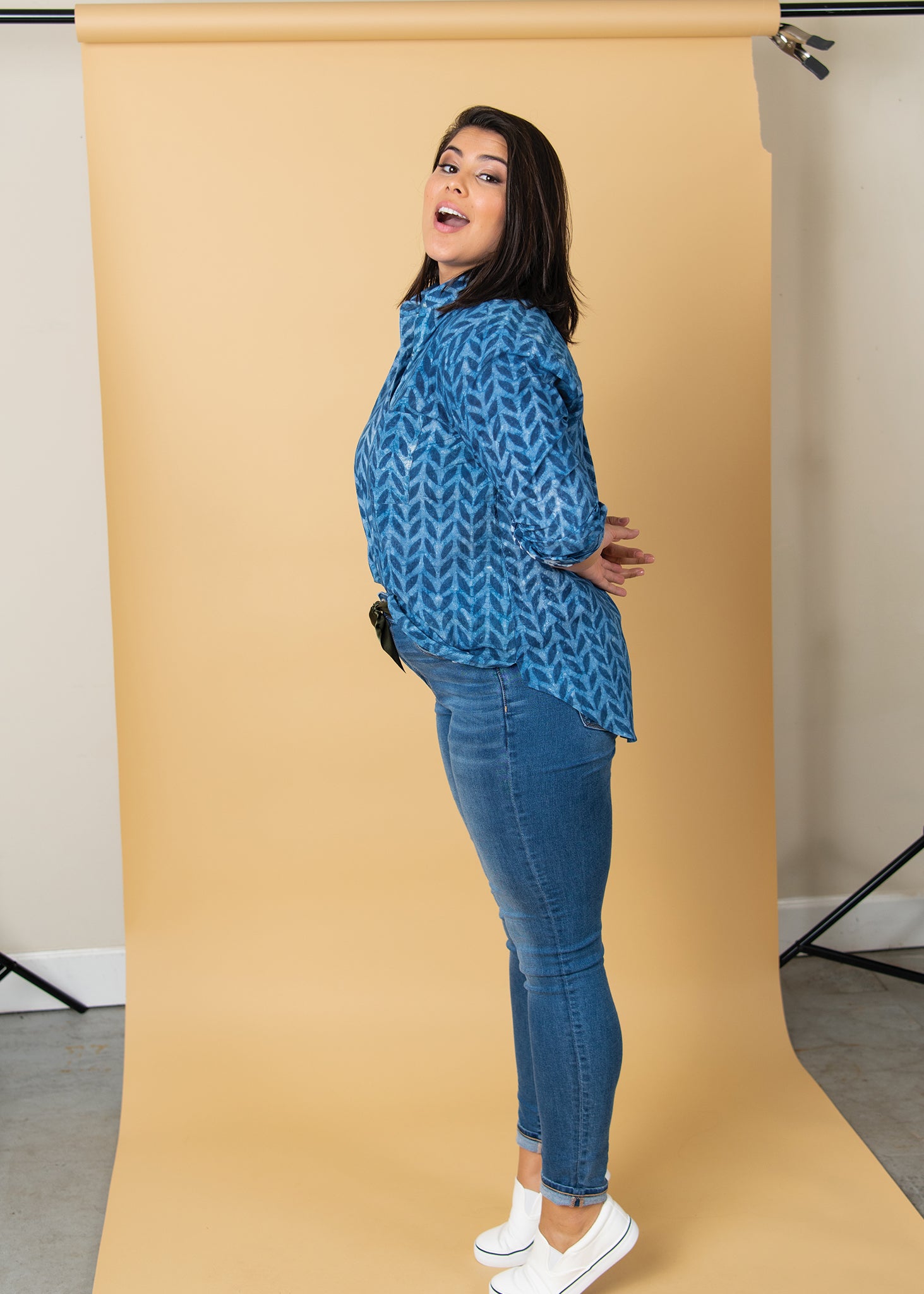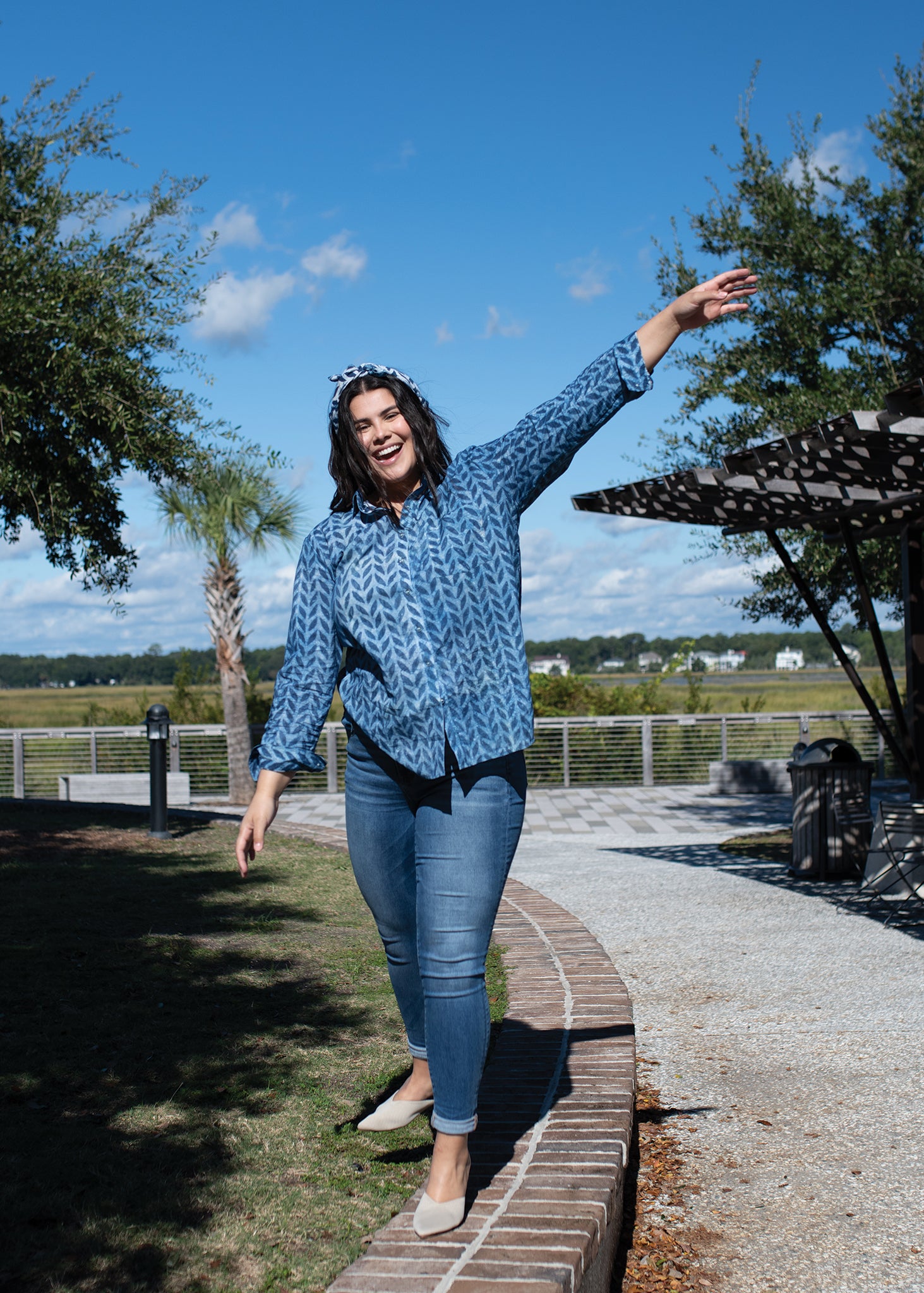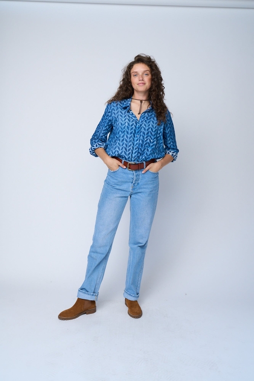 The indigo chevron pattern adds a touch of sophistication to the classic boyfriend shirt design. This unique print ensures that you stand out in any crowd while maintaining a laid-back vibe. The shirt's relaxed fit makes it easy to wear, and the slightly oversized style provides a comfortable and flattering look for all body types.