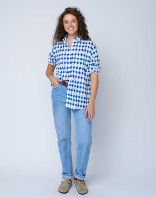 In summary, the Good Boyfriend Shirt - Shibori Diamonds is a must-have for anyone looking to enhance their wardrobe with a stylish, comfortable, and sustainable option. Its unique design, quality materials, and versatile styling options make it a perfect choice for any fashion-forward individual.