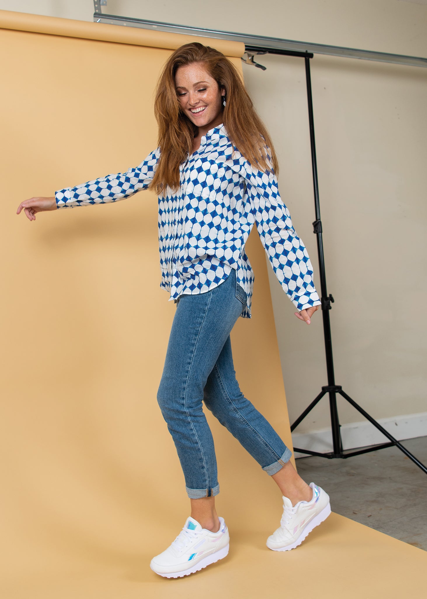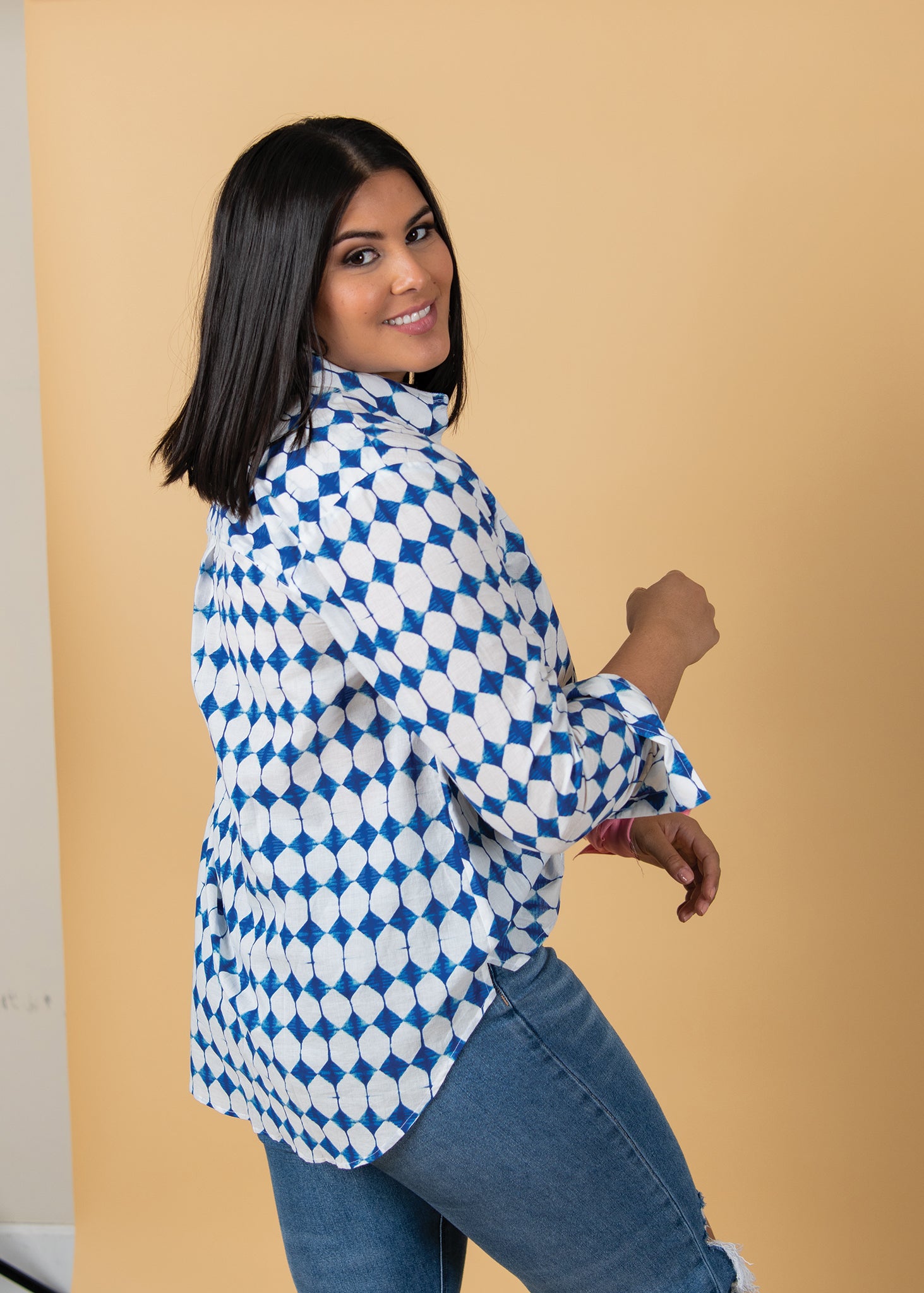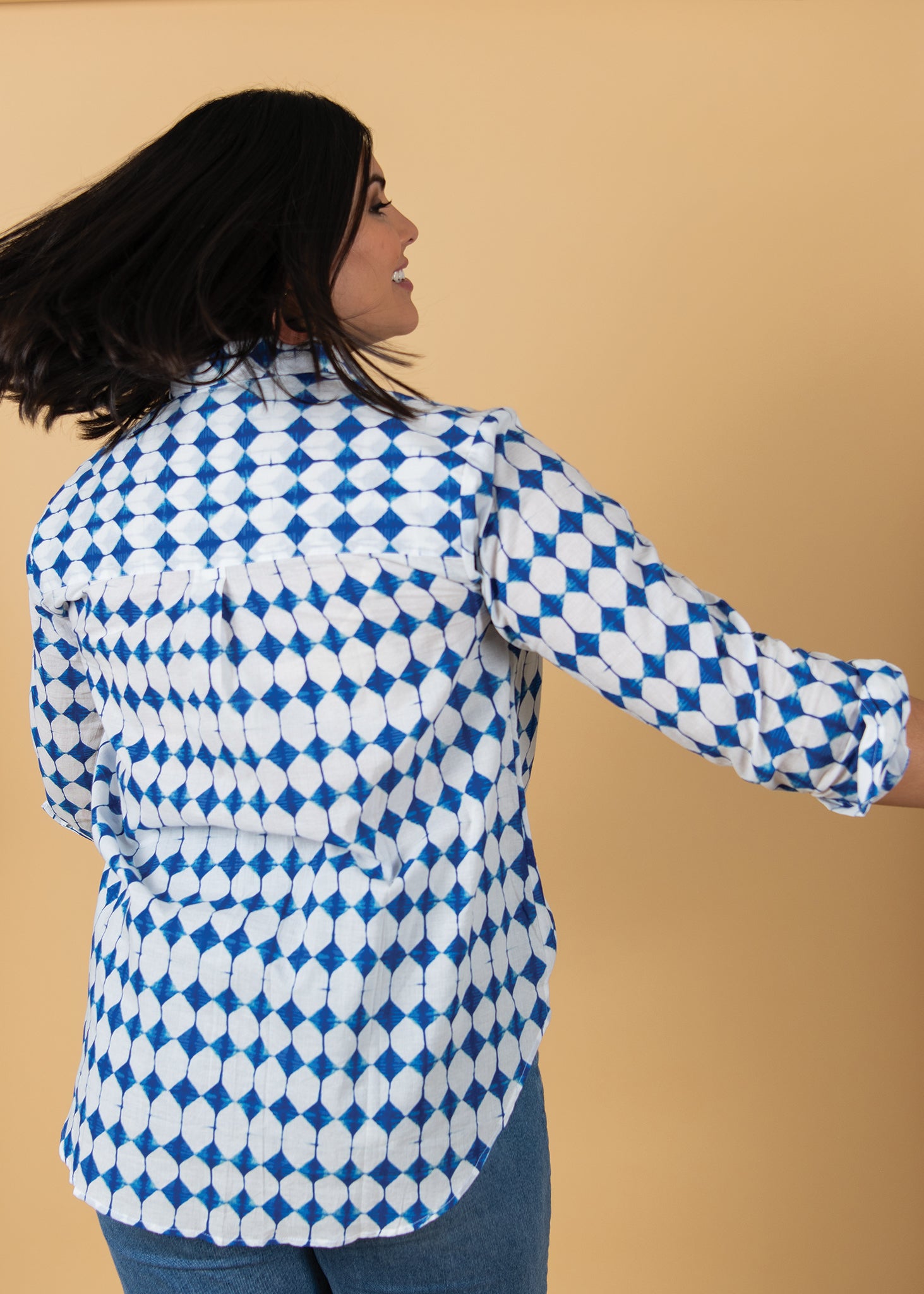 The Good Boyfriend Shirt - Shibori Diamonds is the perfect blend of style, comfort, and sustainability. This long sleeve button-down shirt is designed to be a confident and effortlessly cool addition to your wardrobe. With its relaxed, modern fit and casual silhouette, it offers endless styling options, making it a timeless favorite for any occasion.